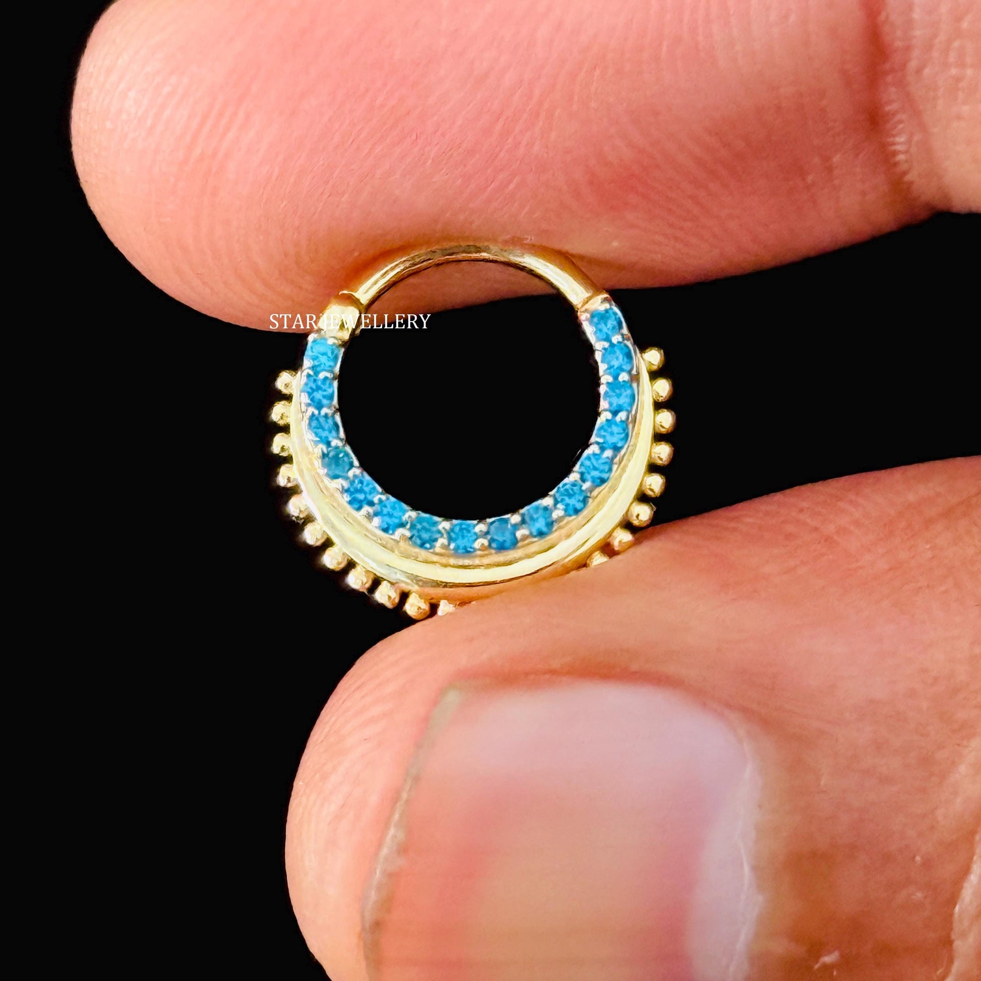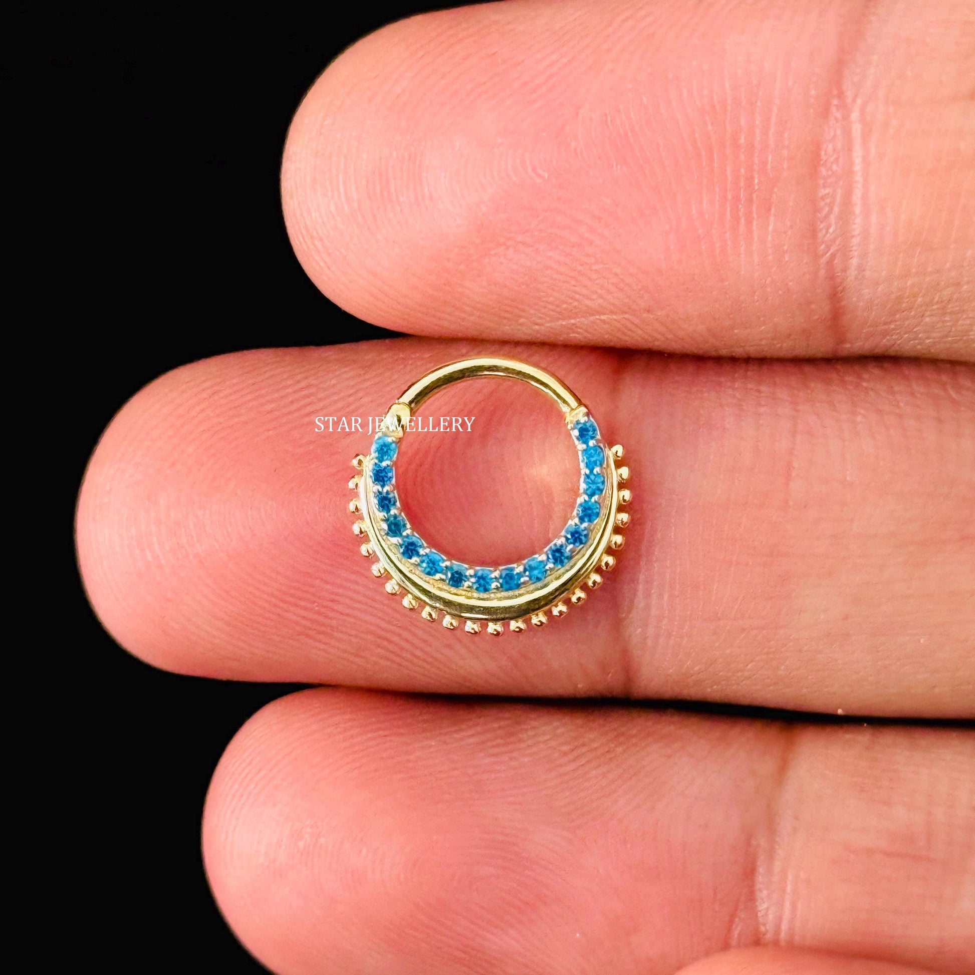 14K Gold Blue Topaz CZ Diamond Septum Nose Ring, CZ Blue Topaz Miligrain Daith Piercing, Green CZ Miligrain Daith Piercing, Septum Clicker