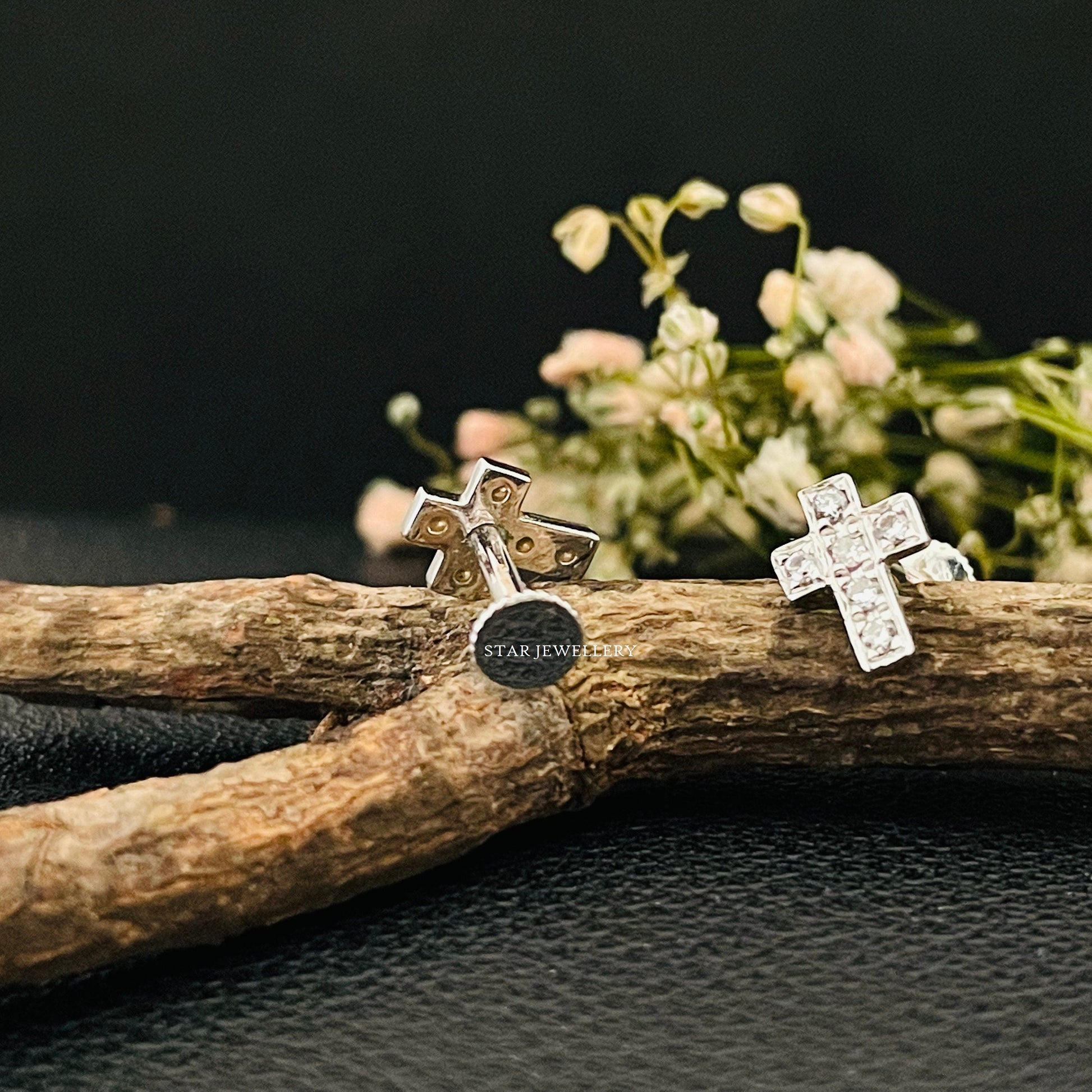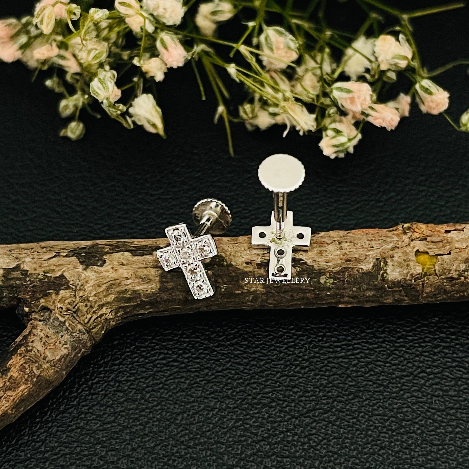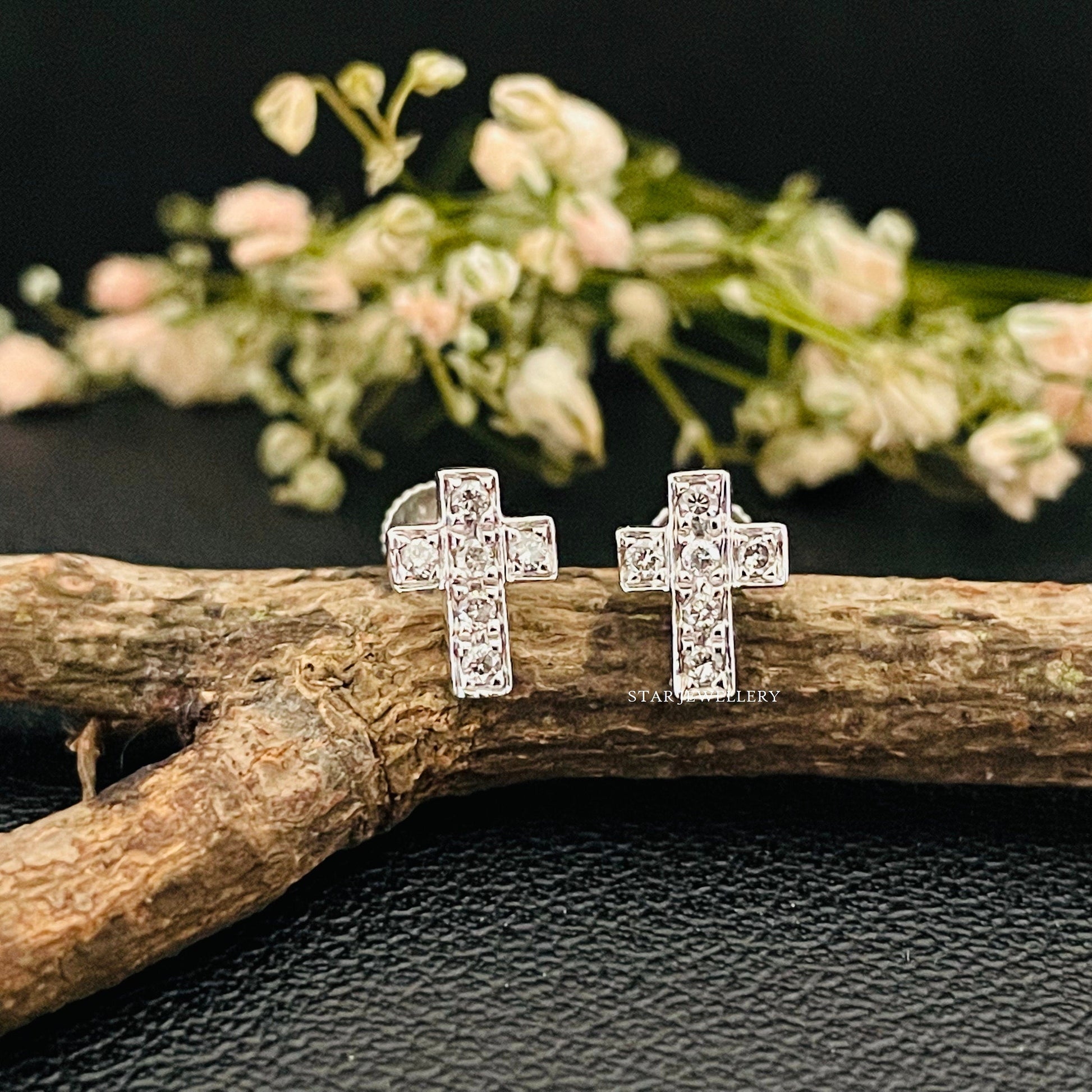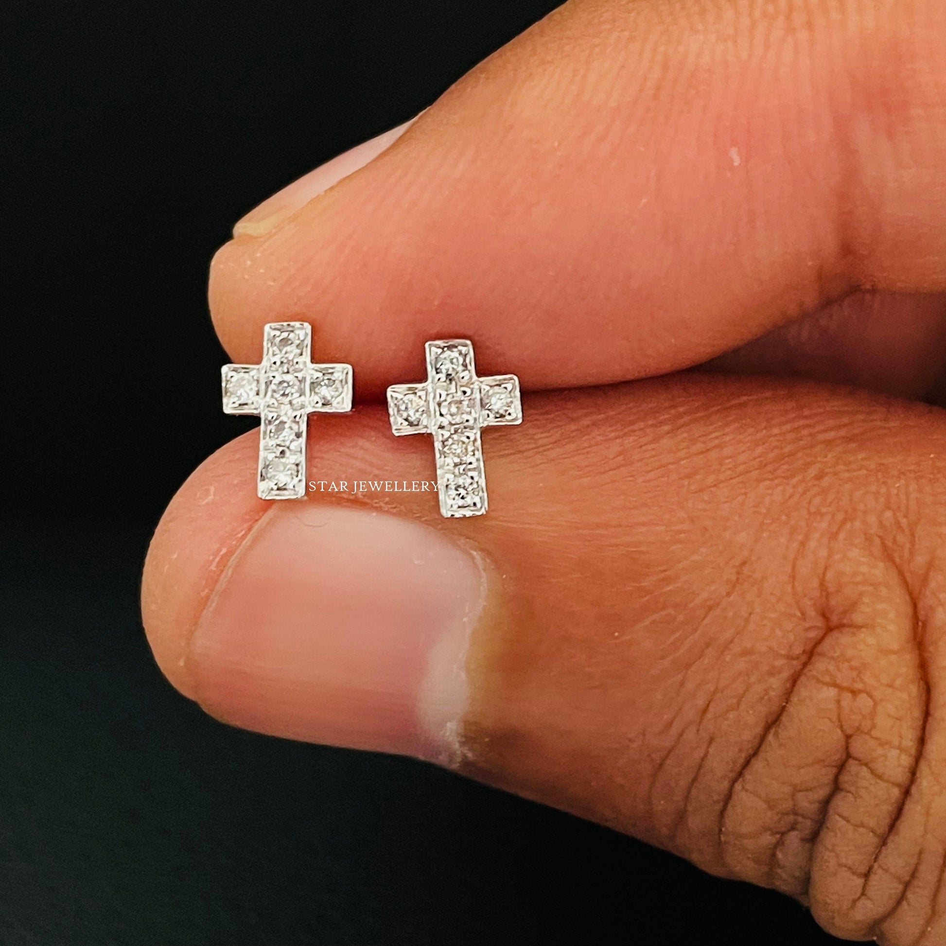 14K Gold Diamond Cross Studs, Tiny Gold Cross Earrings, Tiny Cross Stud Earrings, Tiny Cross Cartilage Piercing, Diamond Cross Nose Tragus, Forward Helix Triangle Piercing, Anti Tragus Piercing