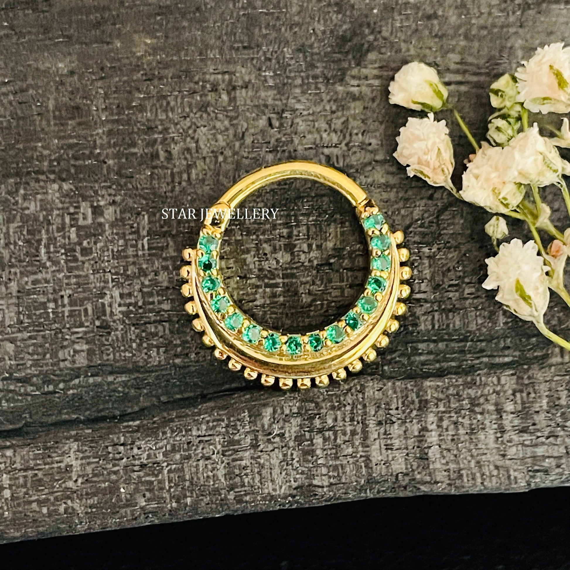 14K Gold Green CZ Diamond Septum Nose Ring, CZ Green Emerald Miligrain Daith Piercing, Green CZ Miligrain Daith Piercing, Septum Clicker