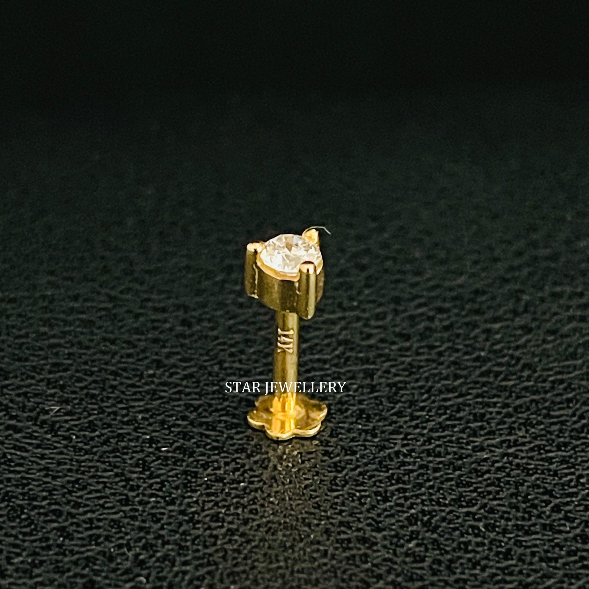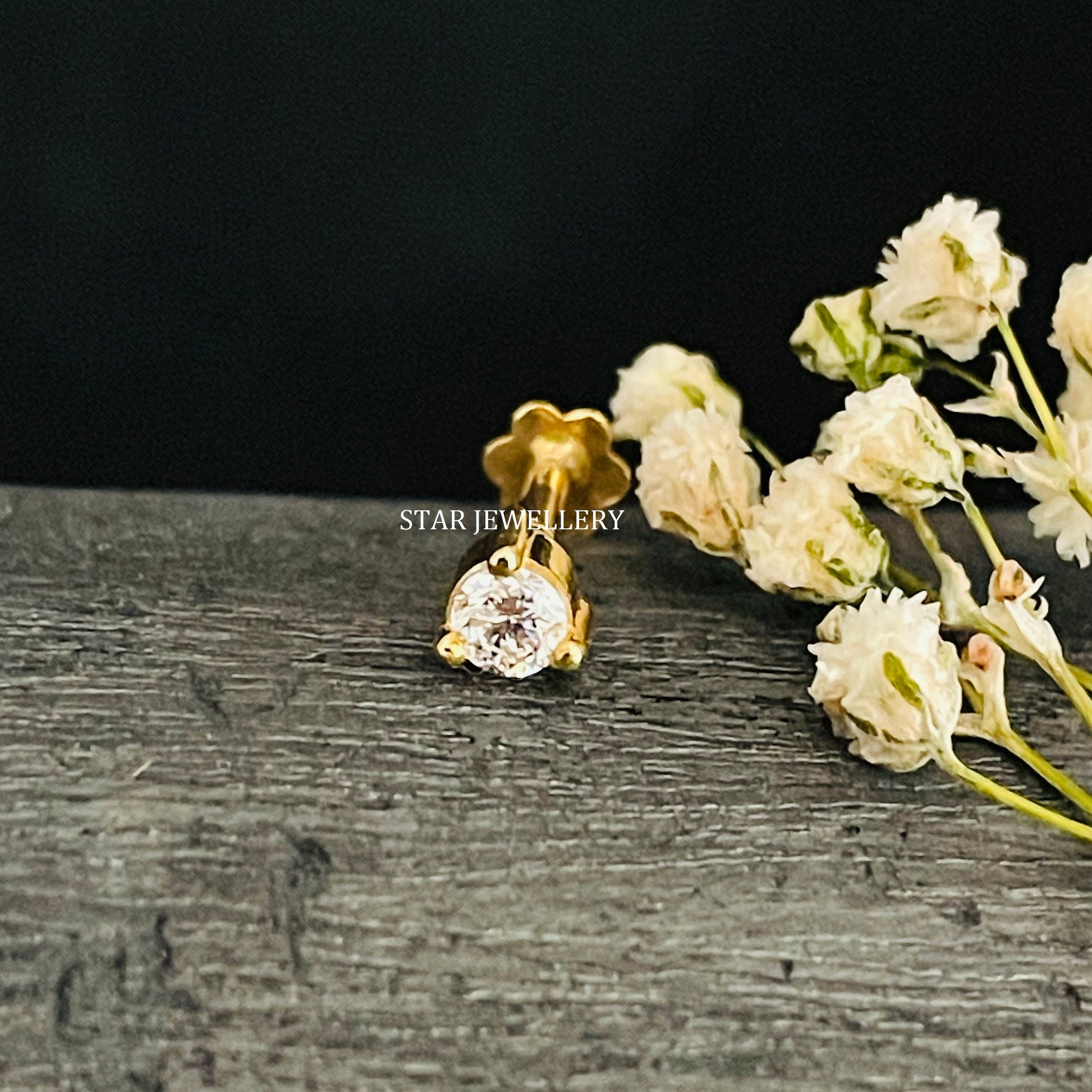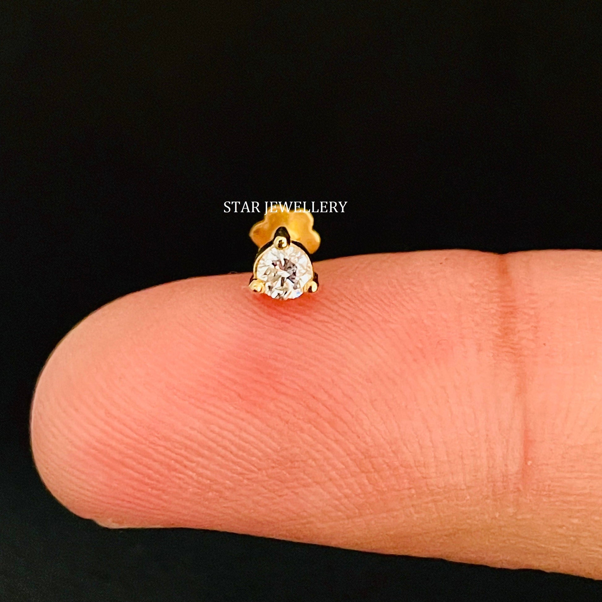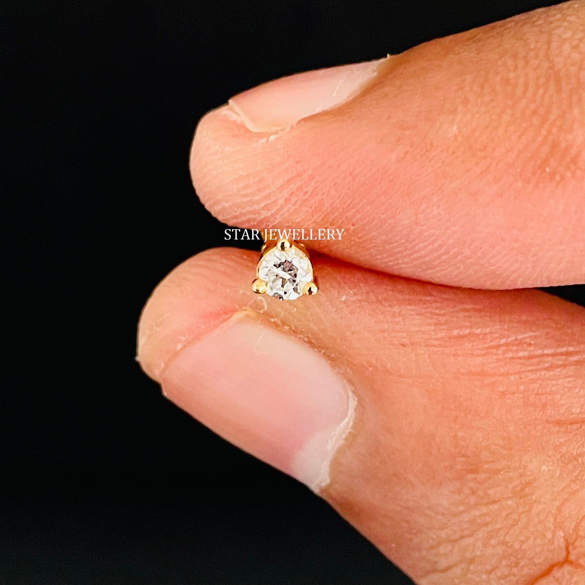 14K Gold Natural Diamond Nose/Ear Stud, 3 Prong Set Diamond Nose Stud, Piercing Nostril Jewelry. Ear, Cartilage, Helix, Tragus, Conch