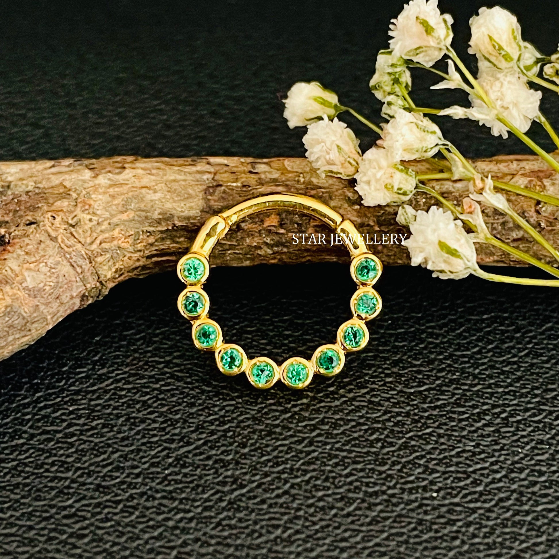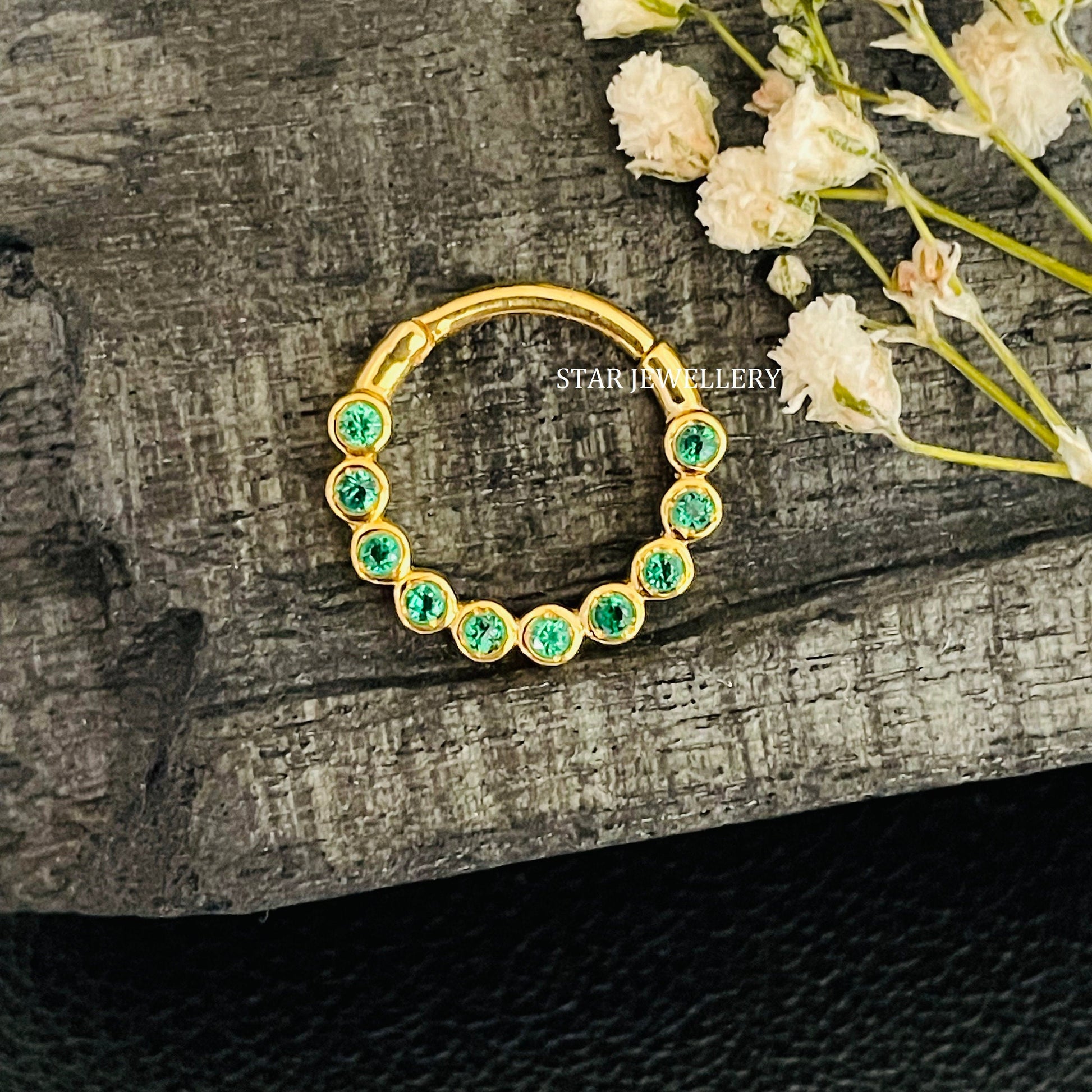 14K Solid Gold Bezel Set Minimalist CZ Green Diamond Daith Clicker, Bezel Set Dainty Green Diamond Septum Piercing, Unique Septum Nose Ring