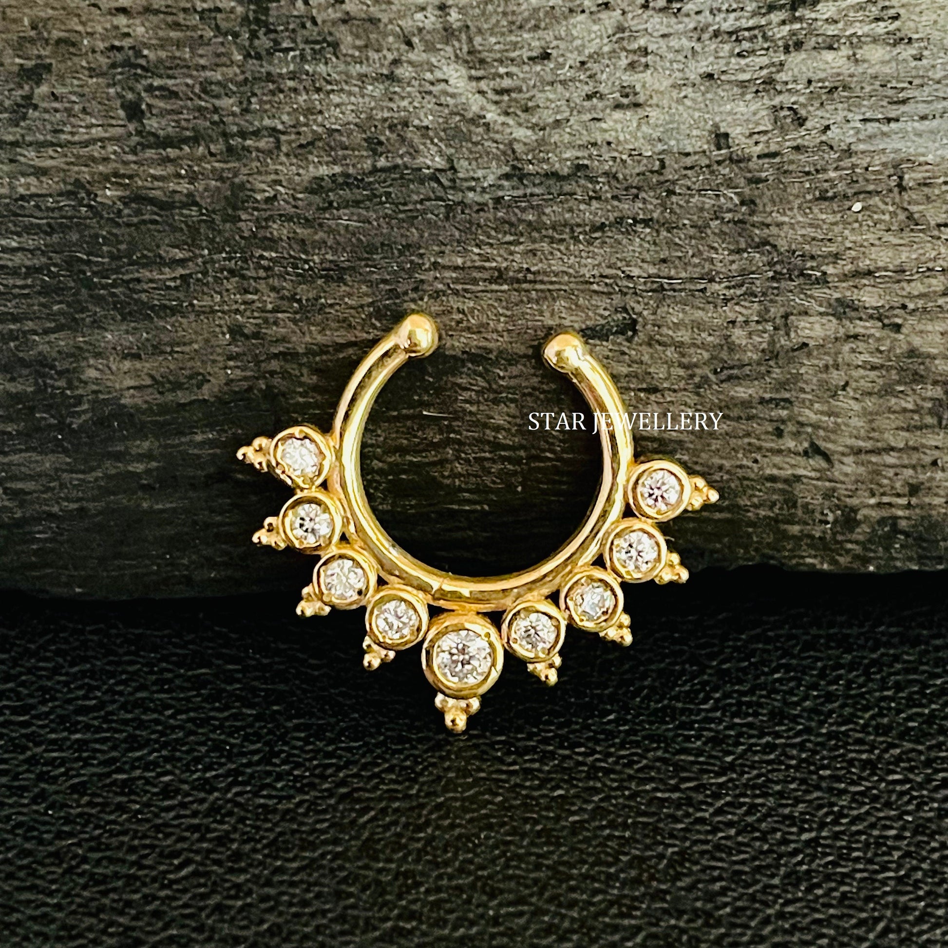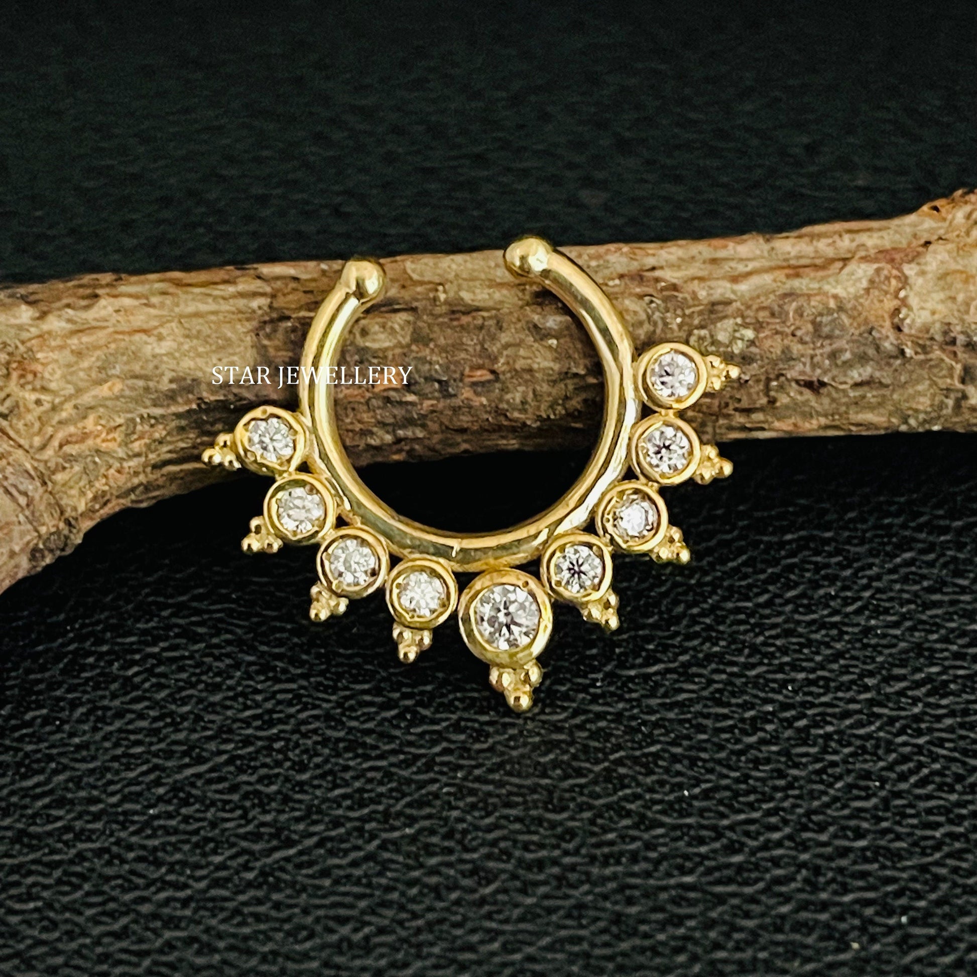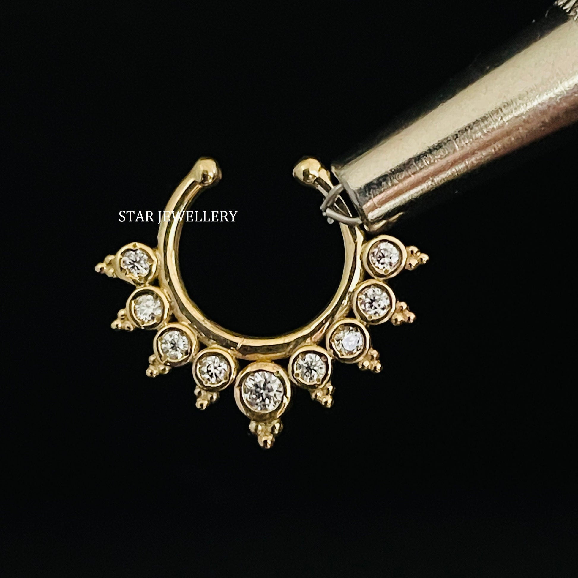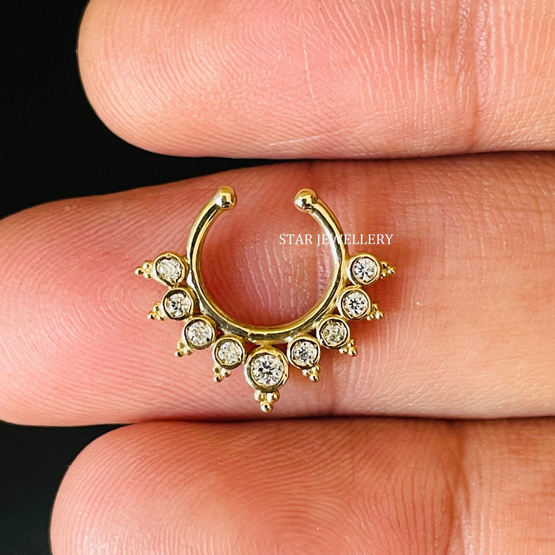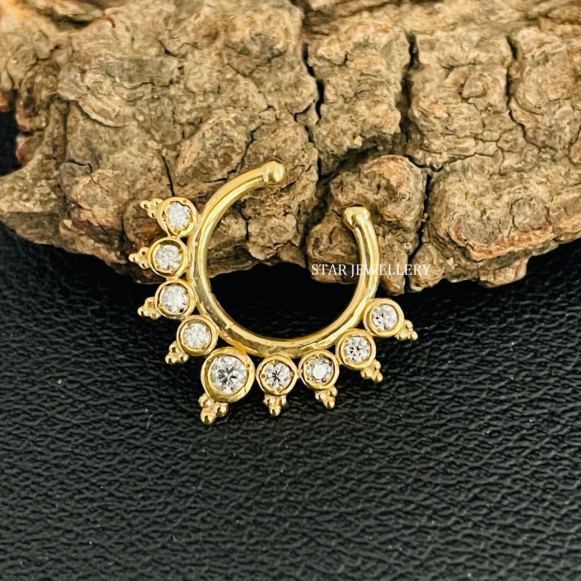 14K Solid Gold Bezel Set Natural Diamond Fake Daith Clicker, Solid Gold Natural Diamond Fake Septum Piercing for her, Unisex Fake Septum