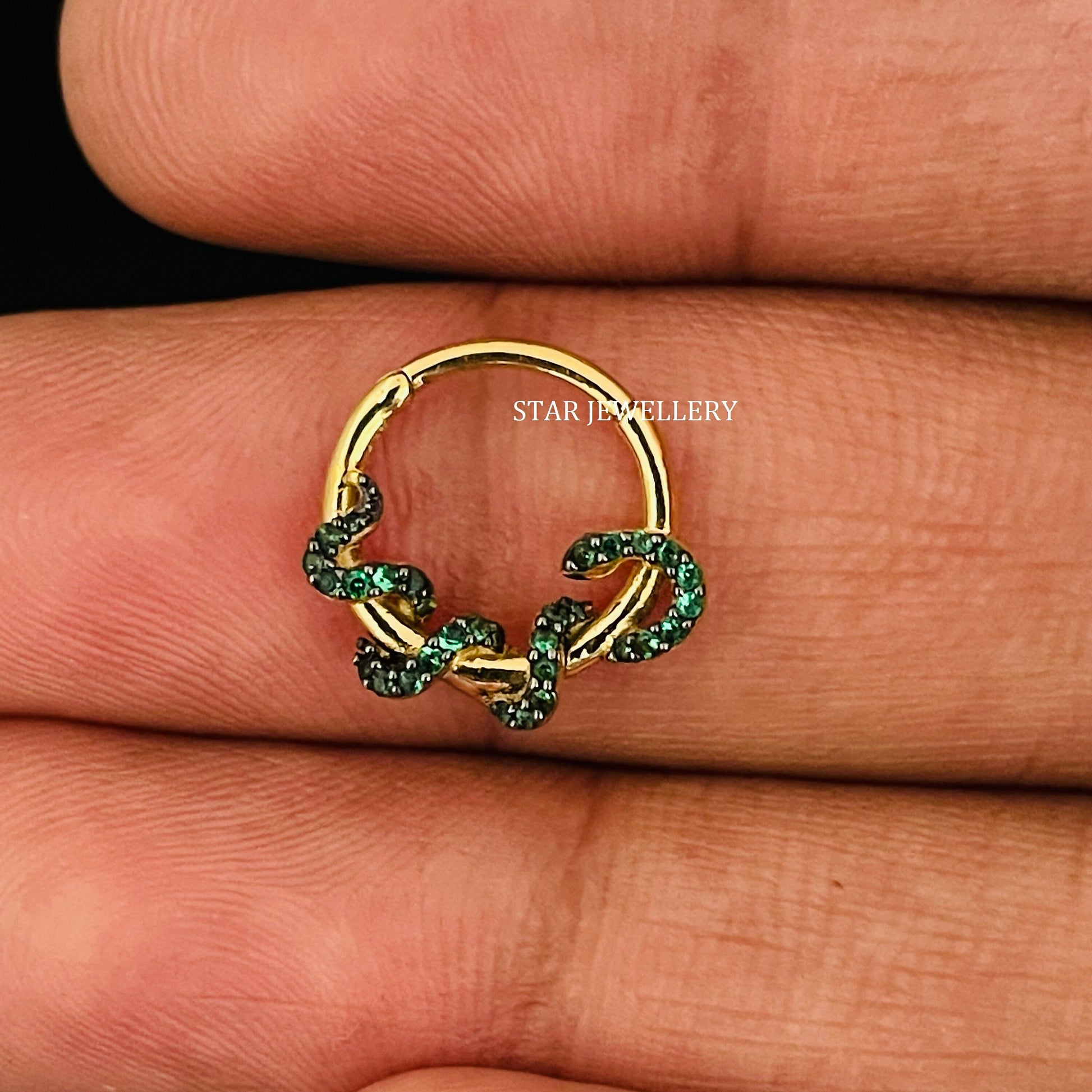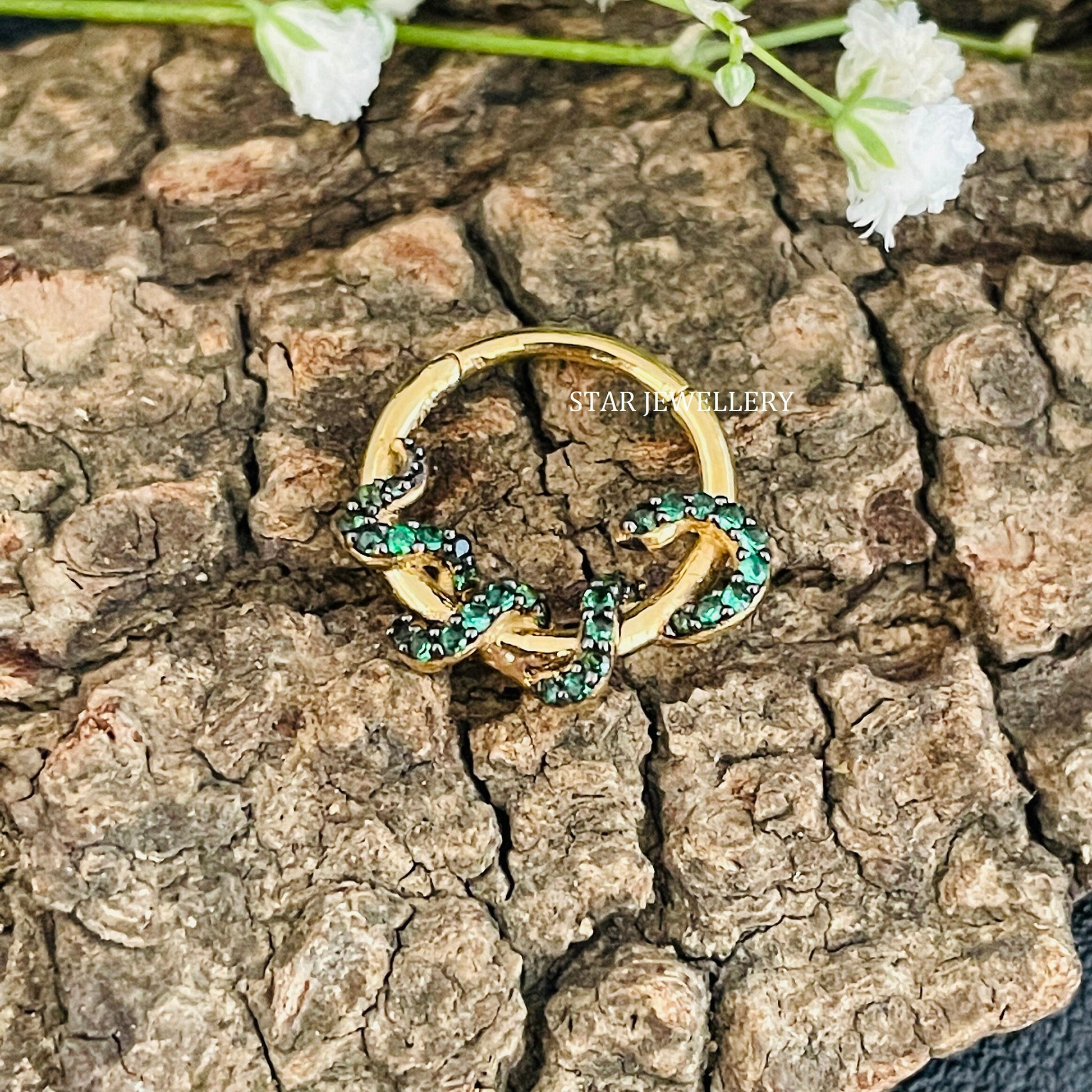 14K Solid Gold CZ Green Diamond Snake Daith Piercing for her, 10K Gold Snake Daith Clicker with Green CZ Stone,Diamond Snake Septum Piercing
