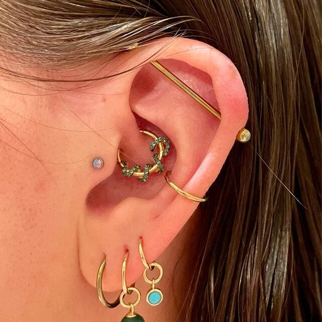 14K Solid Gold CZ Green Diamond Snake Daith Piercing