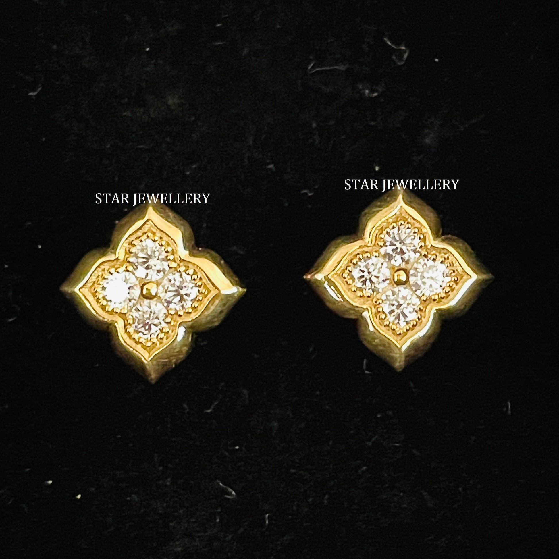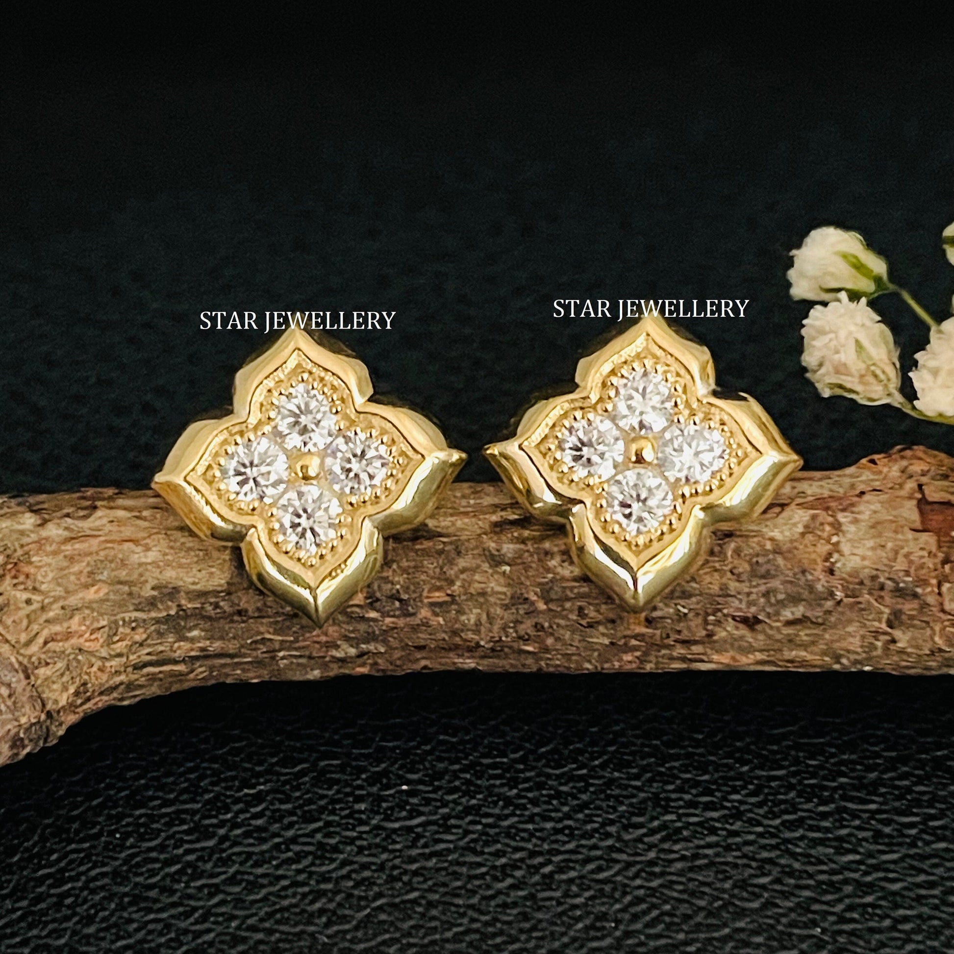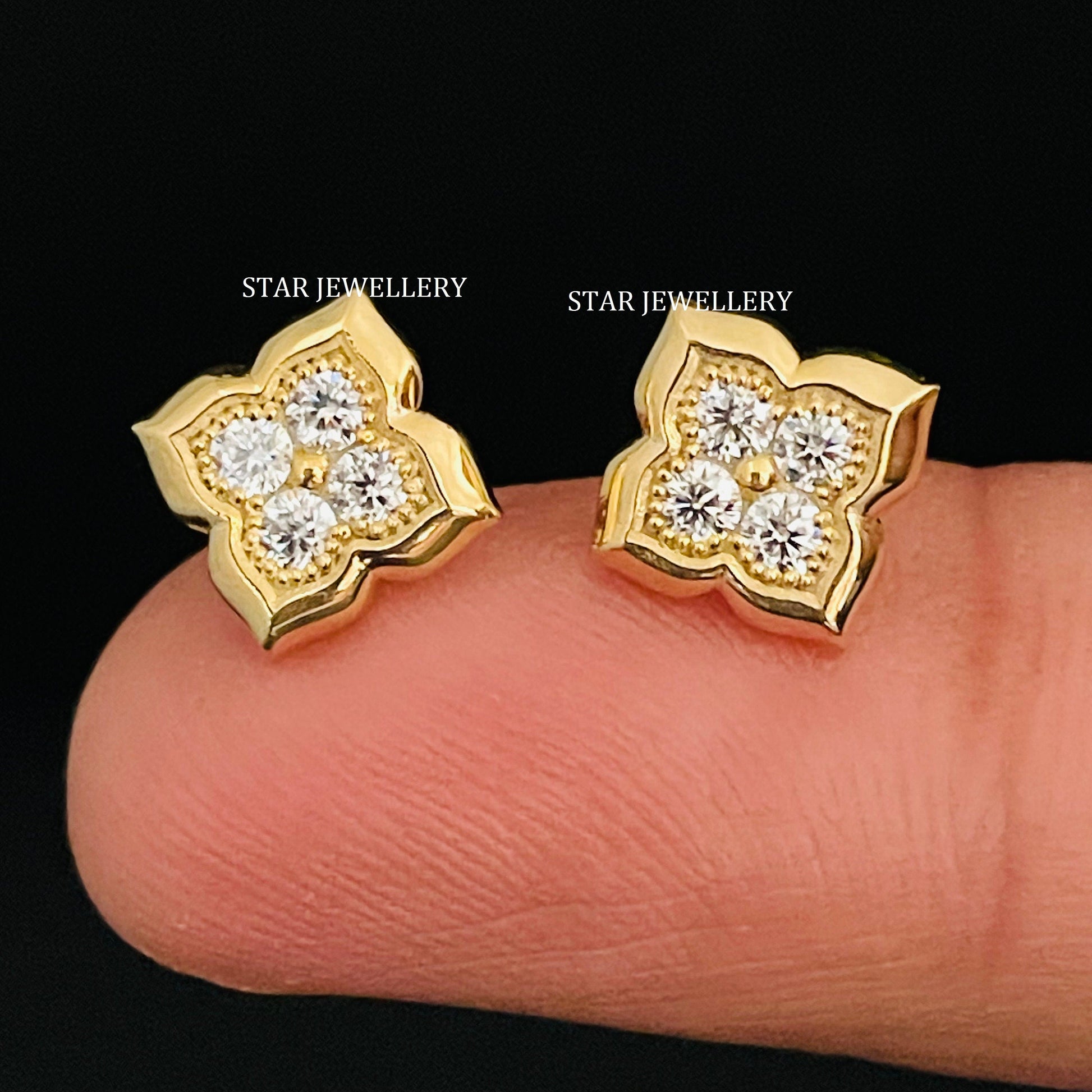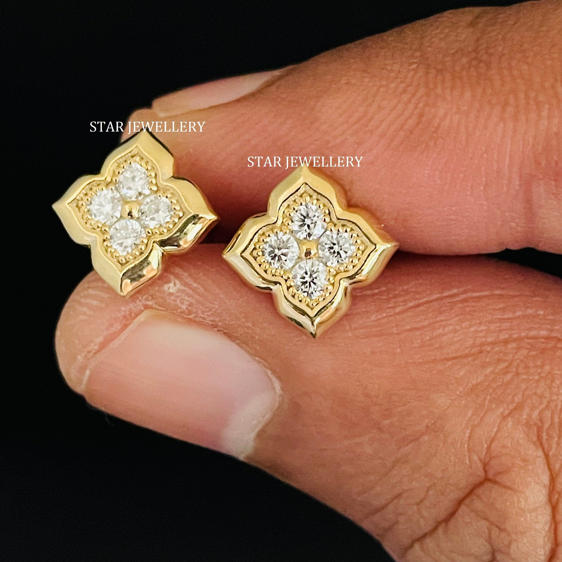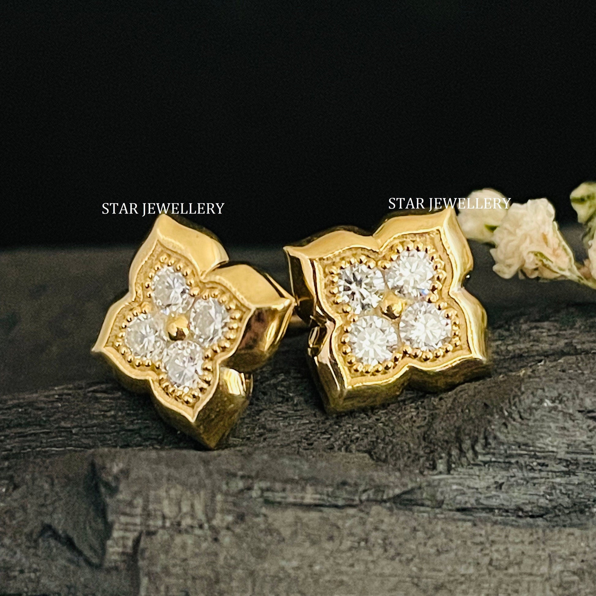 14K Solid Gold Four Stone Natural Diamond Earring, Lab Grown Diamond Clover Earring, Four Stone Moissanite Clover Earring Sold as a Pair