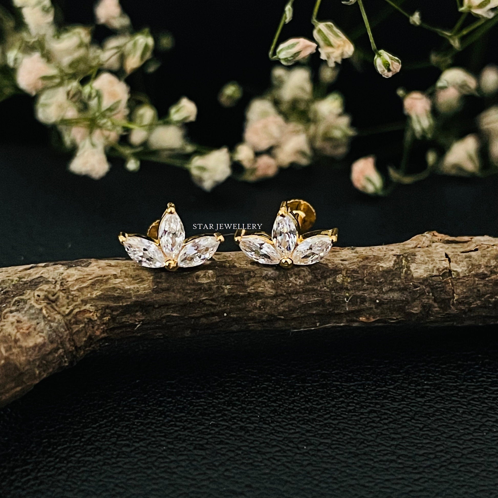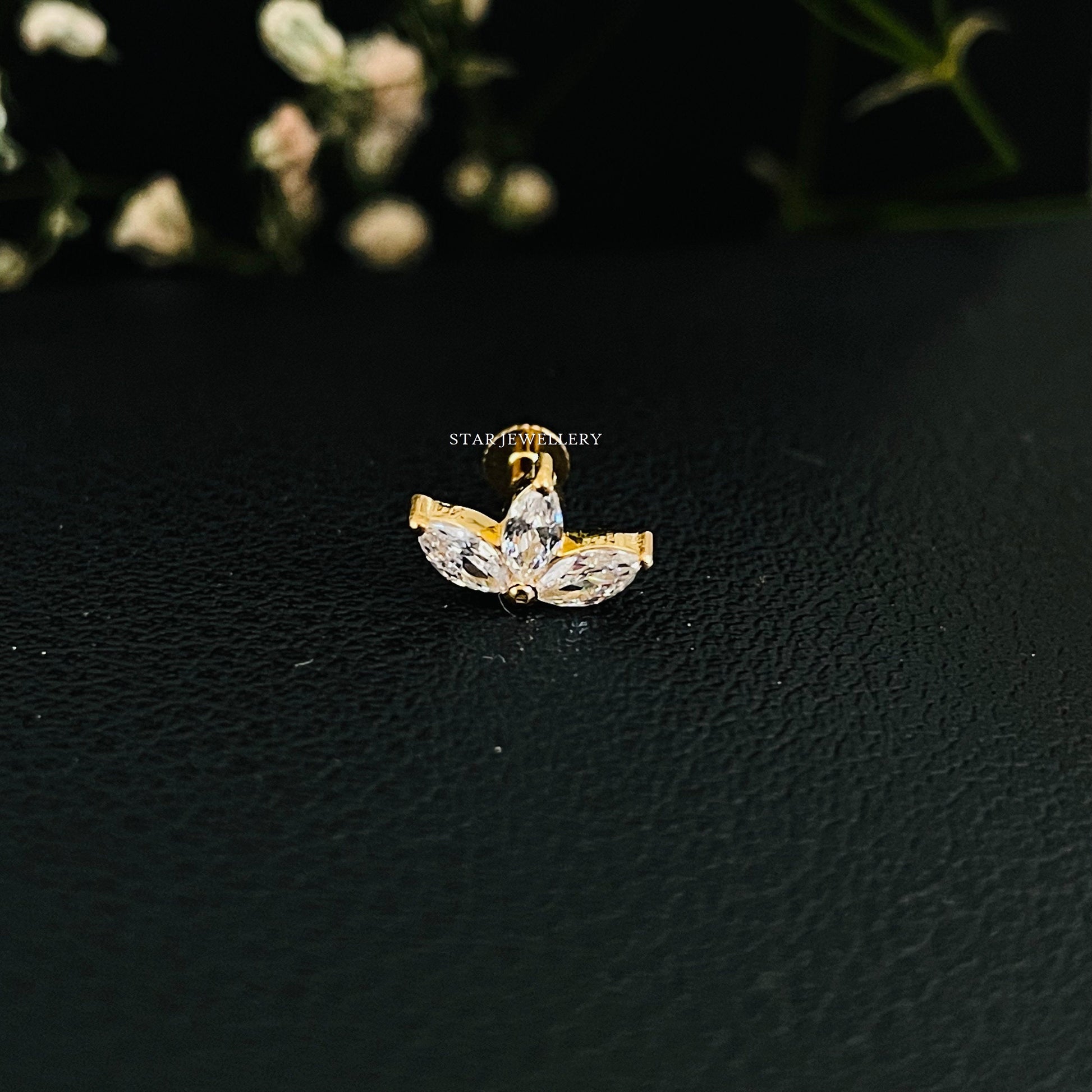 14K Solid Gold Leaf Stud Diamond Piercing, Tiny Leaf Lotus Piercing for Earlobe, Tragus, Helix & Conch, Leaf Piercing with Natural Diamonds