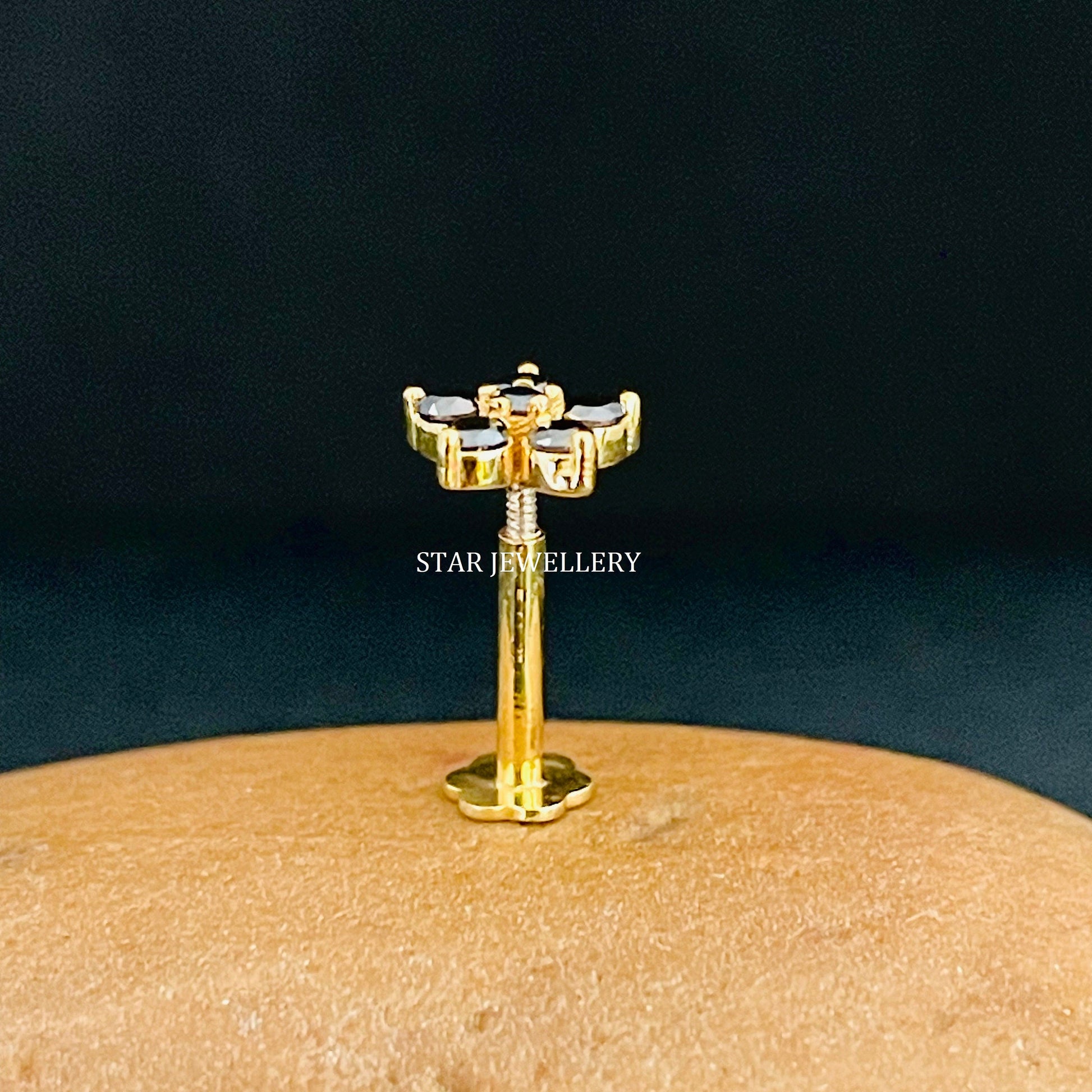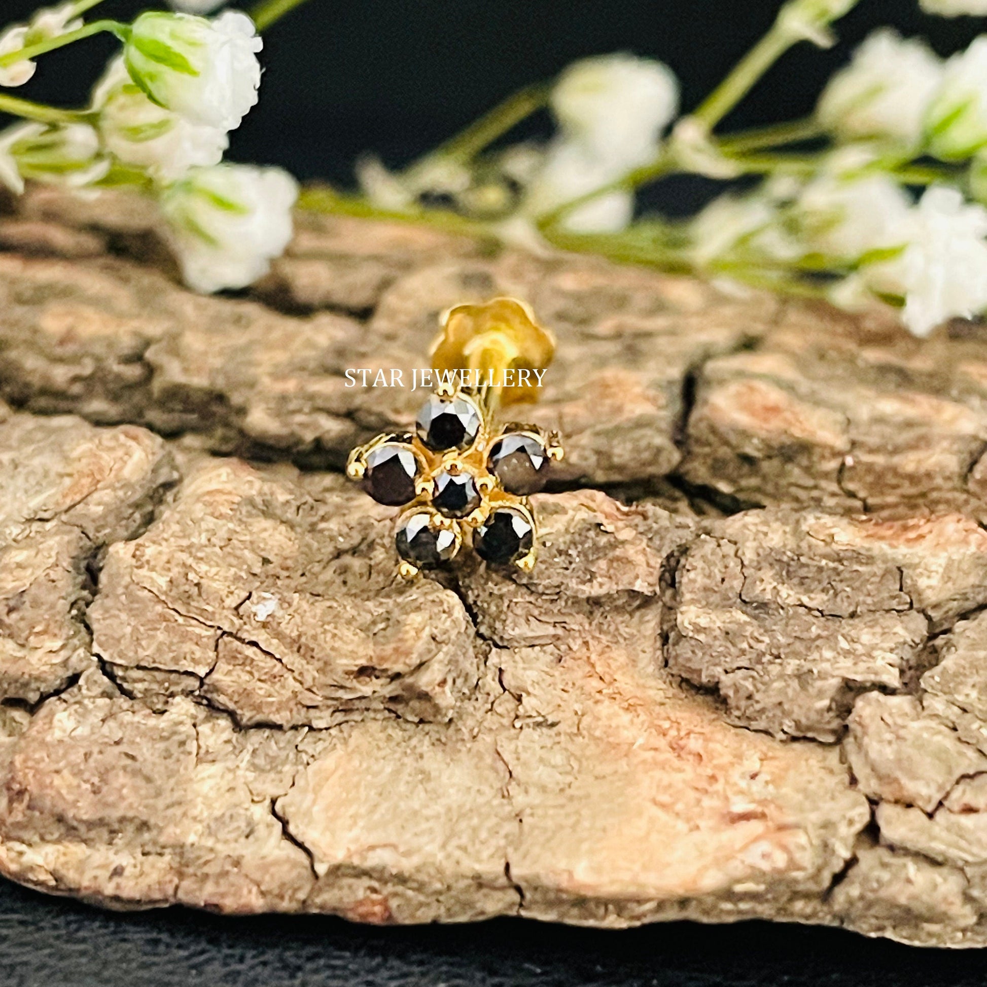 14K Solid Gold Natural Black Diamond Cluster Floral Ear Piercing