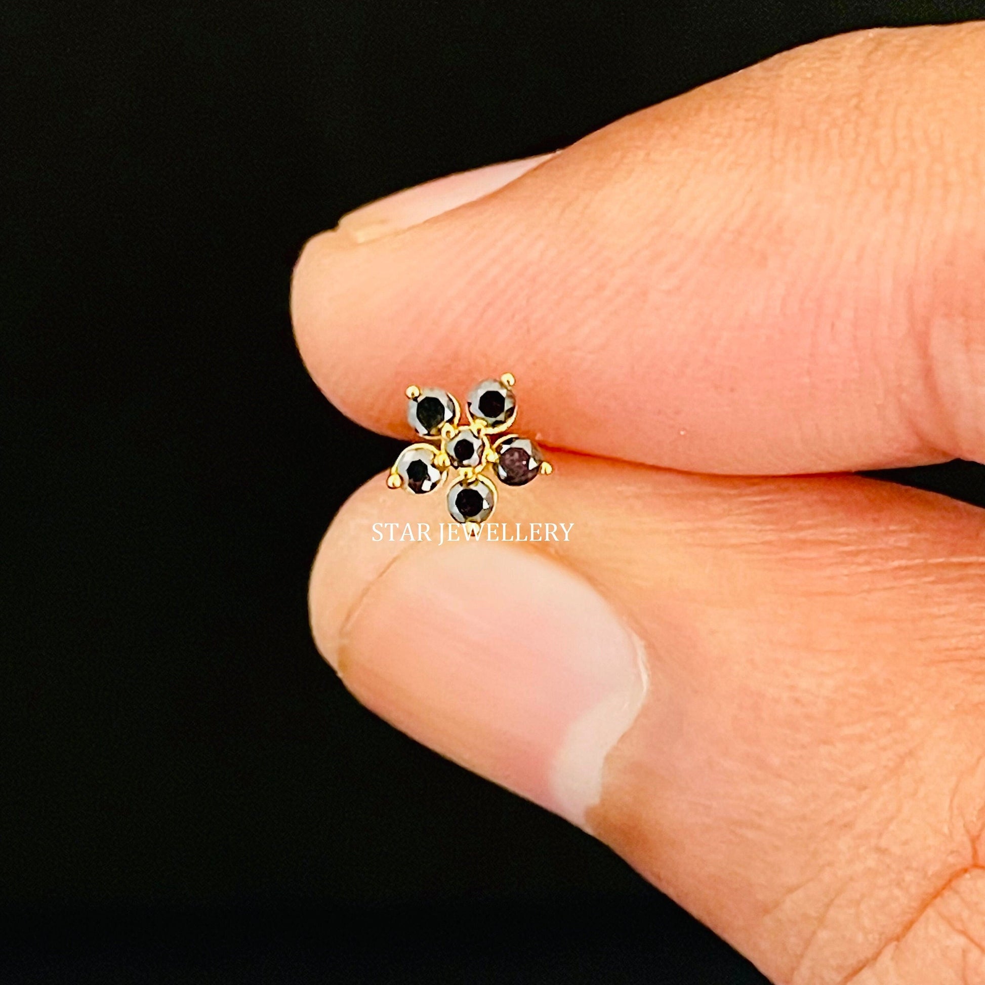 14K Solid Gold Natural Black Diamond Cluster Floral External Threaded Pin, Natural Black Diamond Flower Stud for Tragus, Lobe, Conch, Lobe