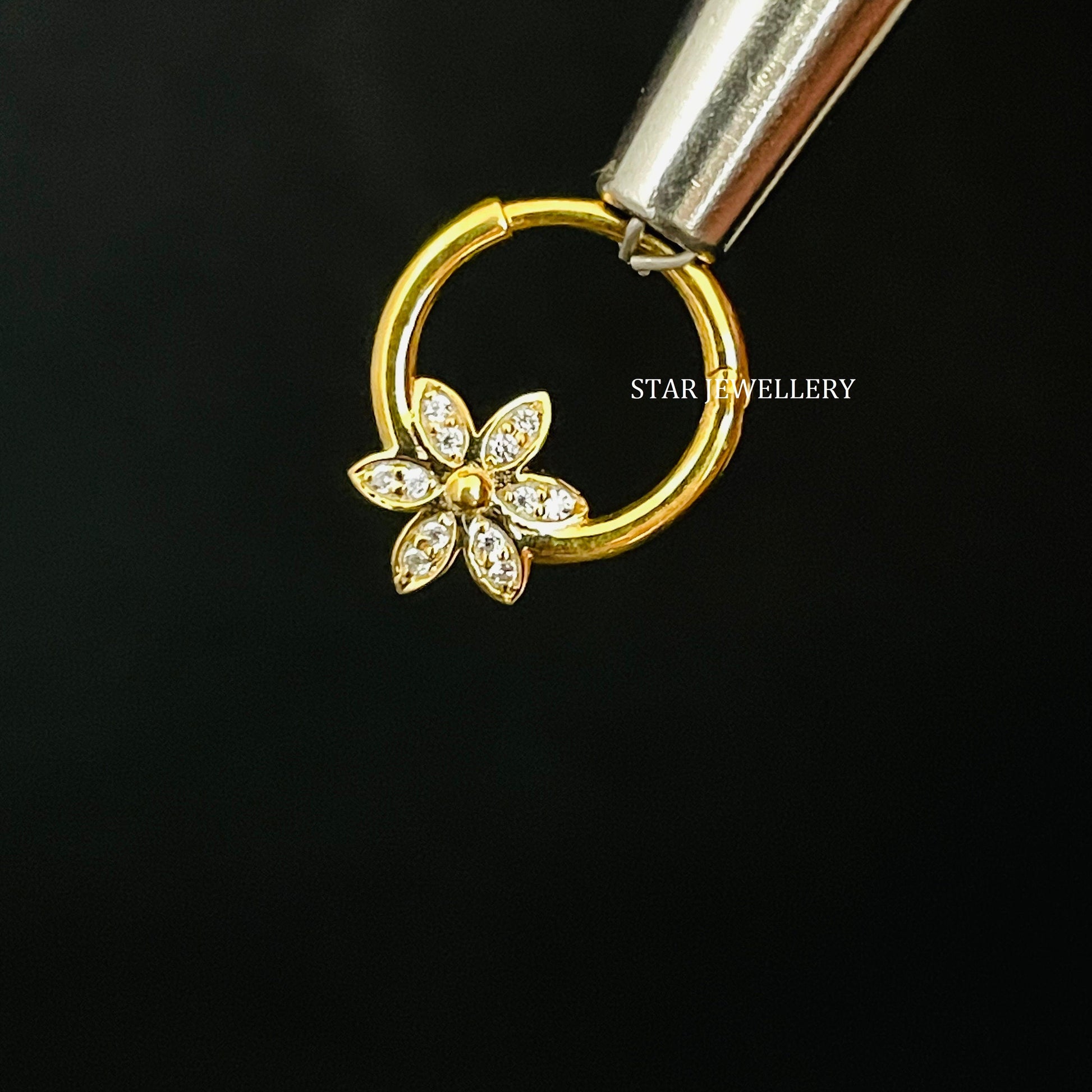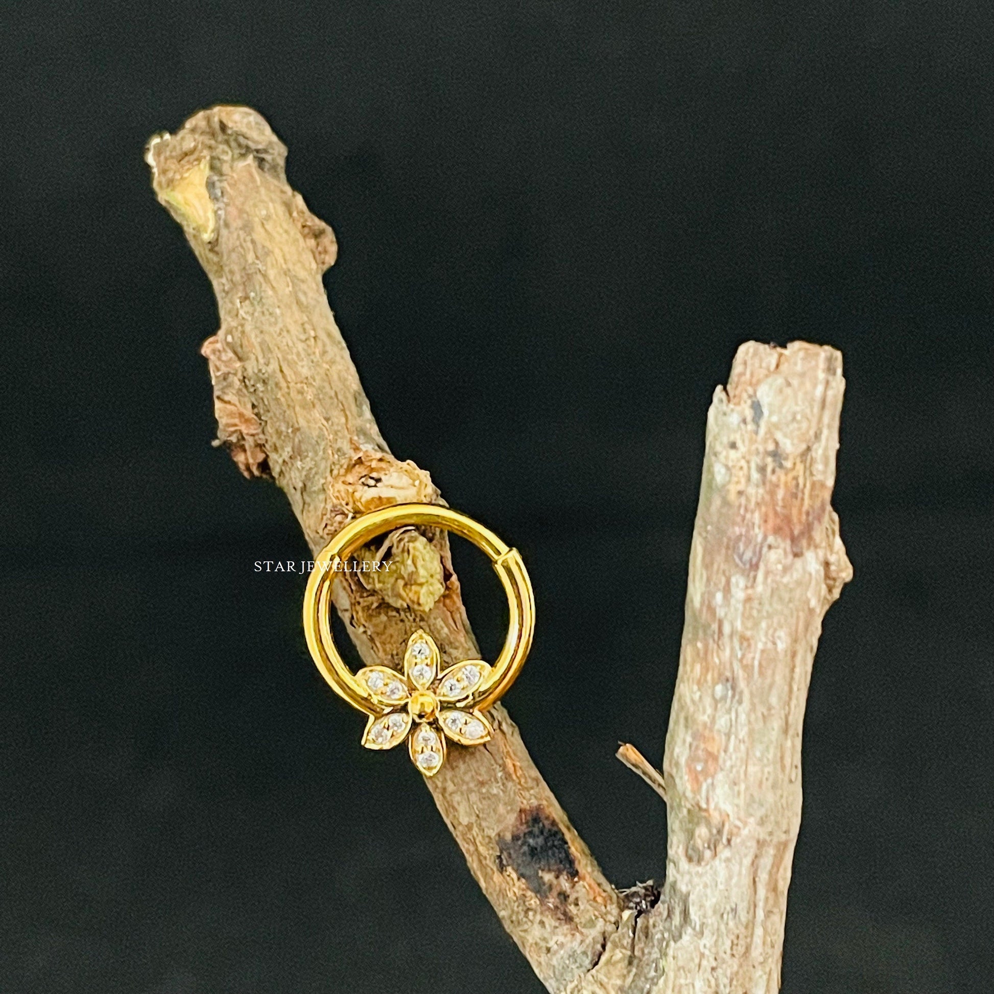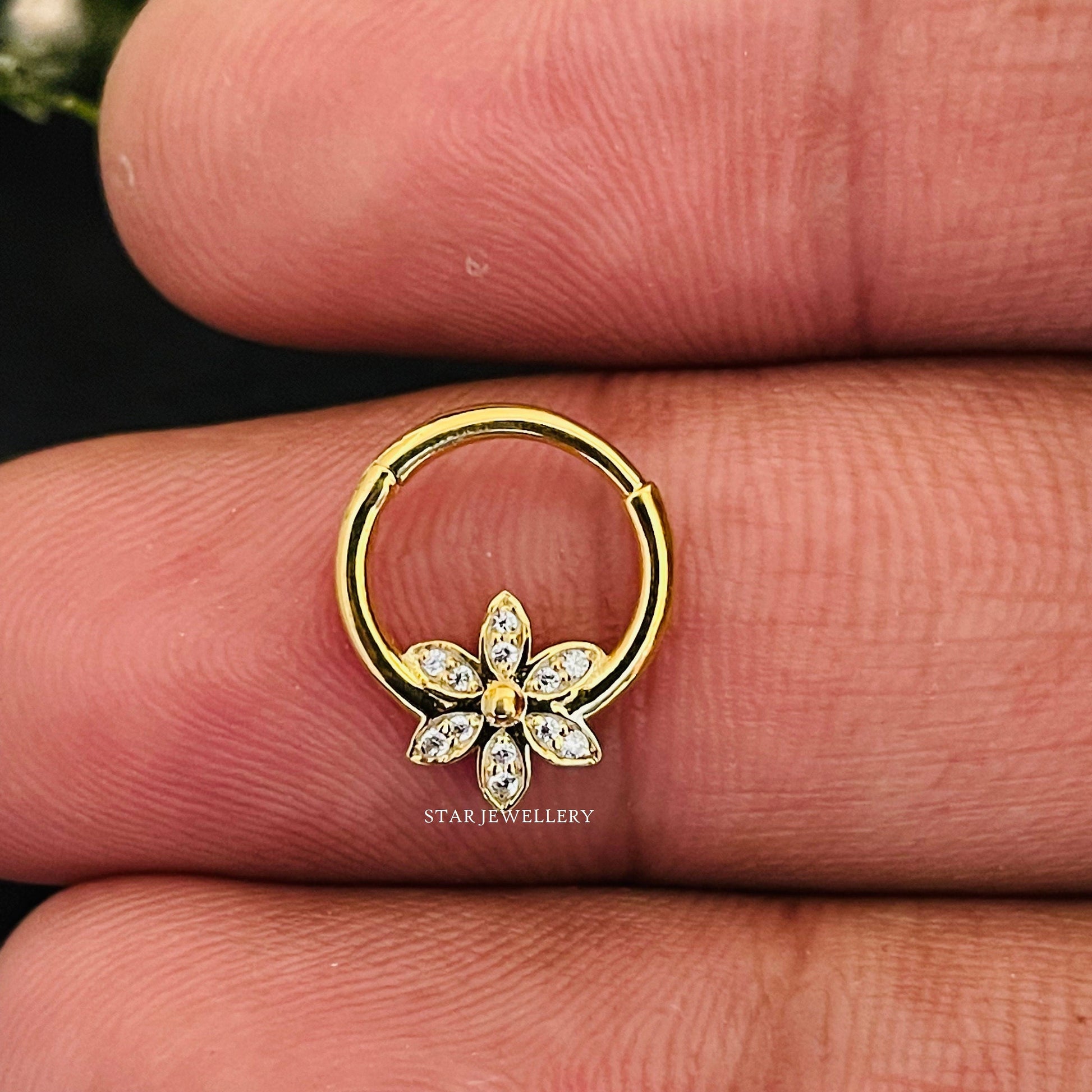 14K Solid Gold Natural Diamond Floral Daith Piercing, Diamond Septum Clicker, Floral Daith Jewelry, Diamond Helix Piercing, Septum Nose Ring
