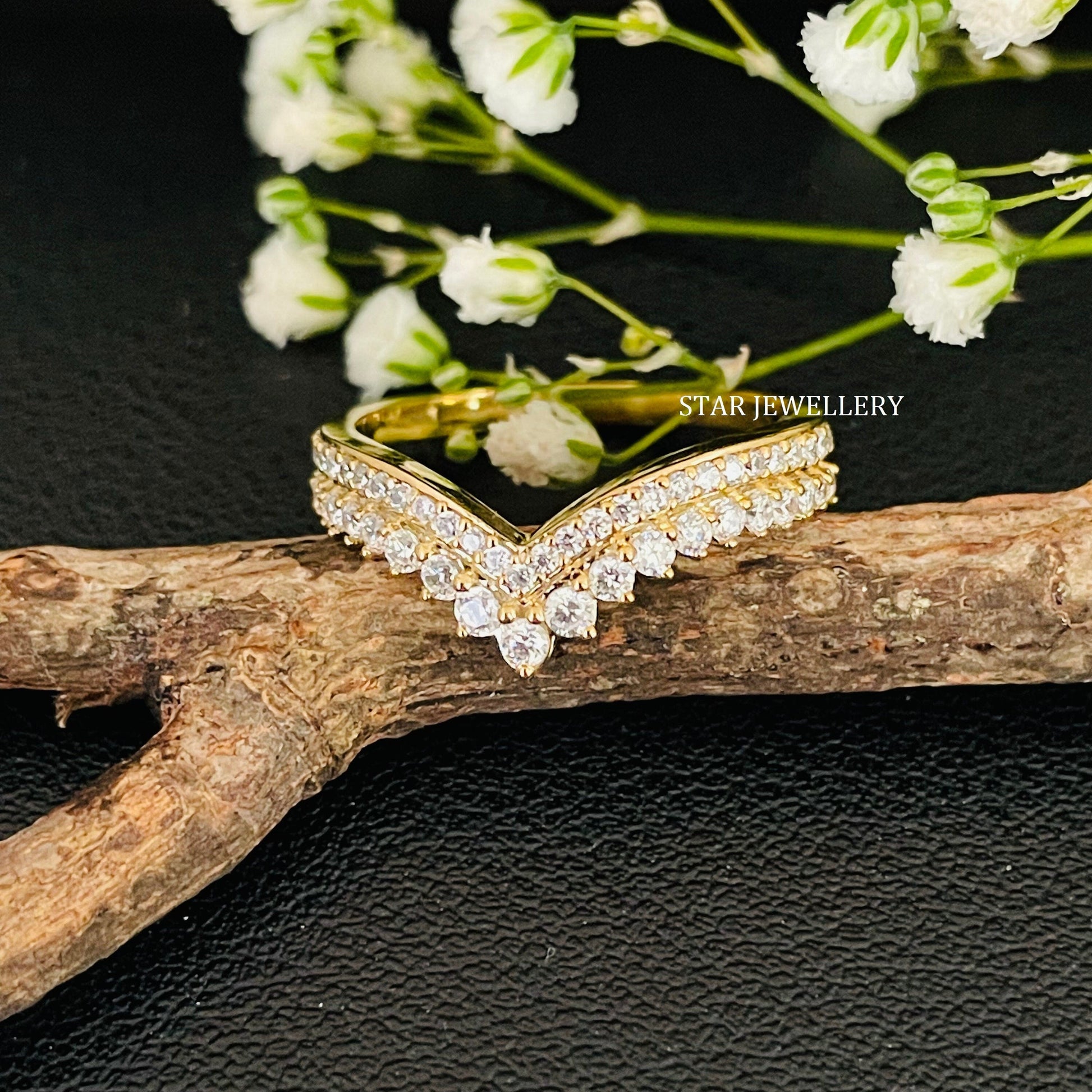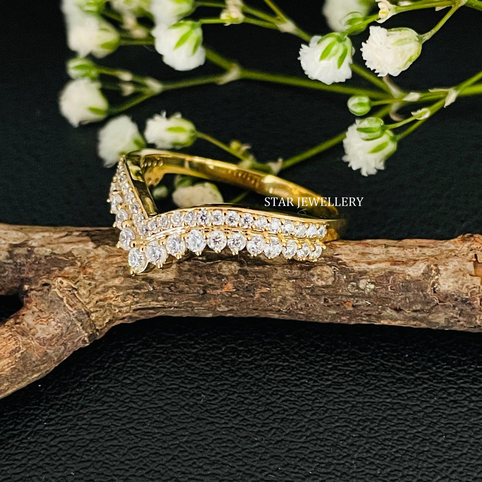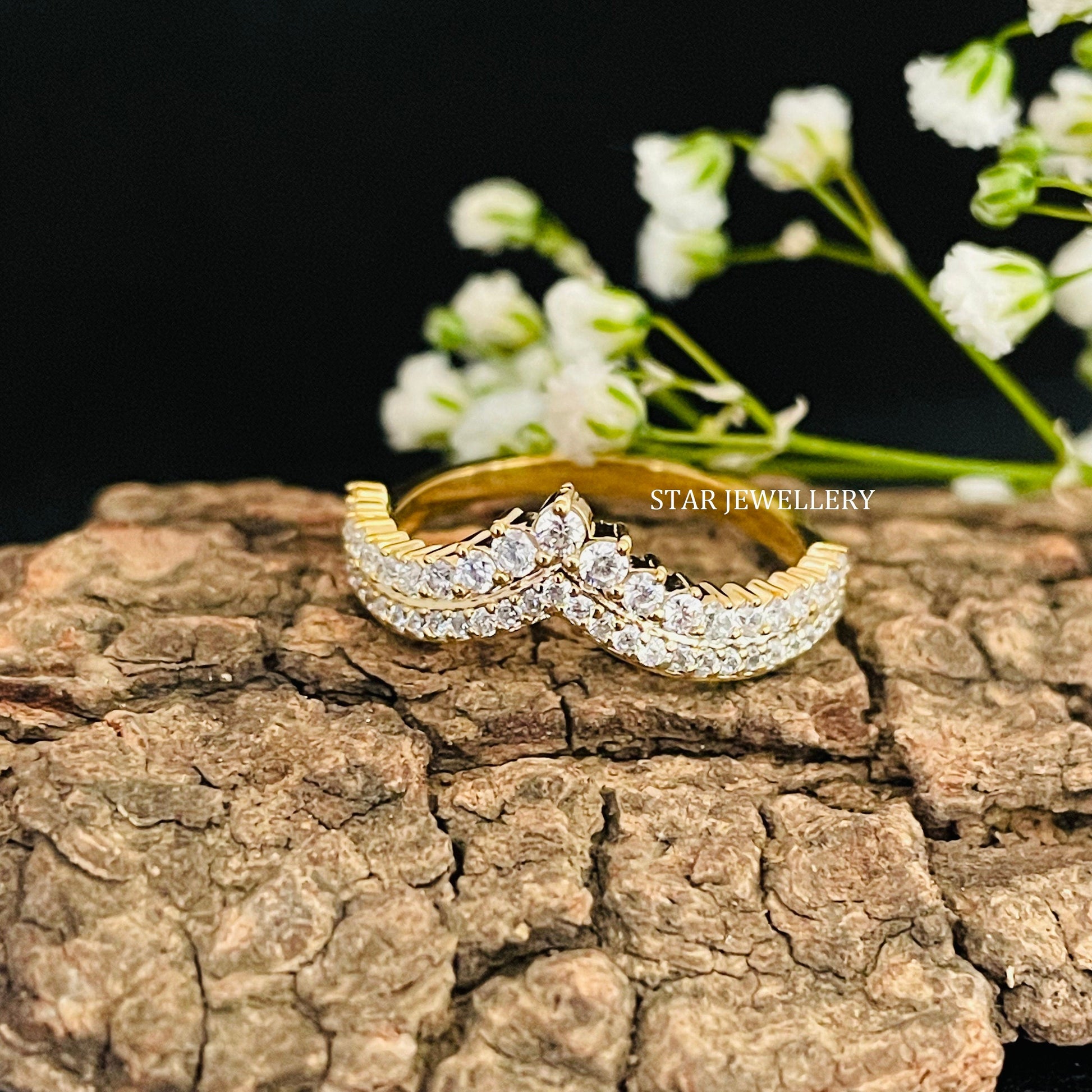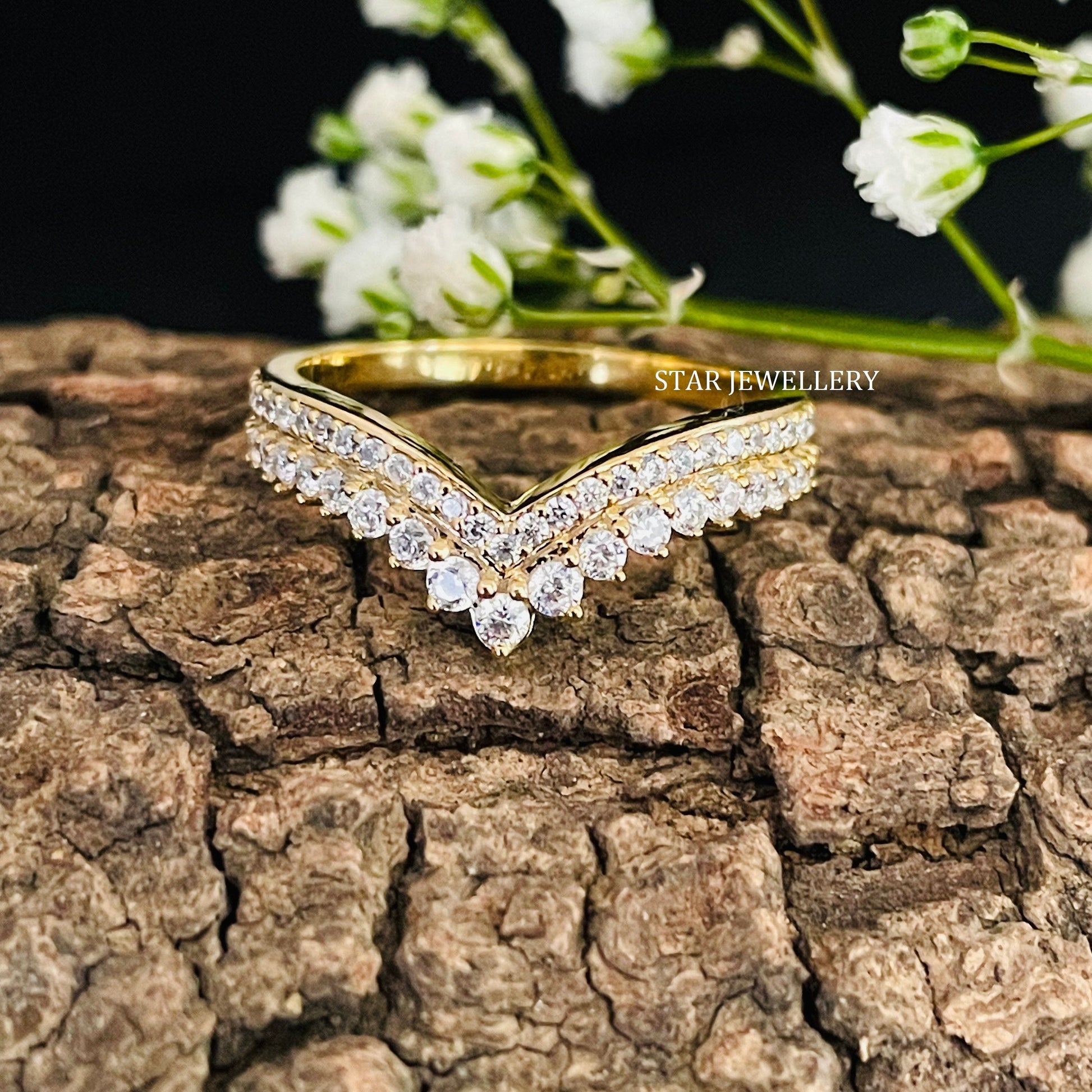 14K Solid Gold Natural Diamond Matching Band for Solitaire Engagement Ring, Chevron Stackable Wedding Band Ring, Diamond Tiara Promise Ring