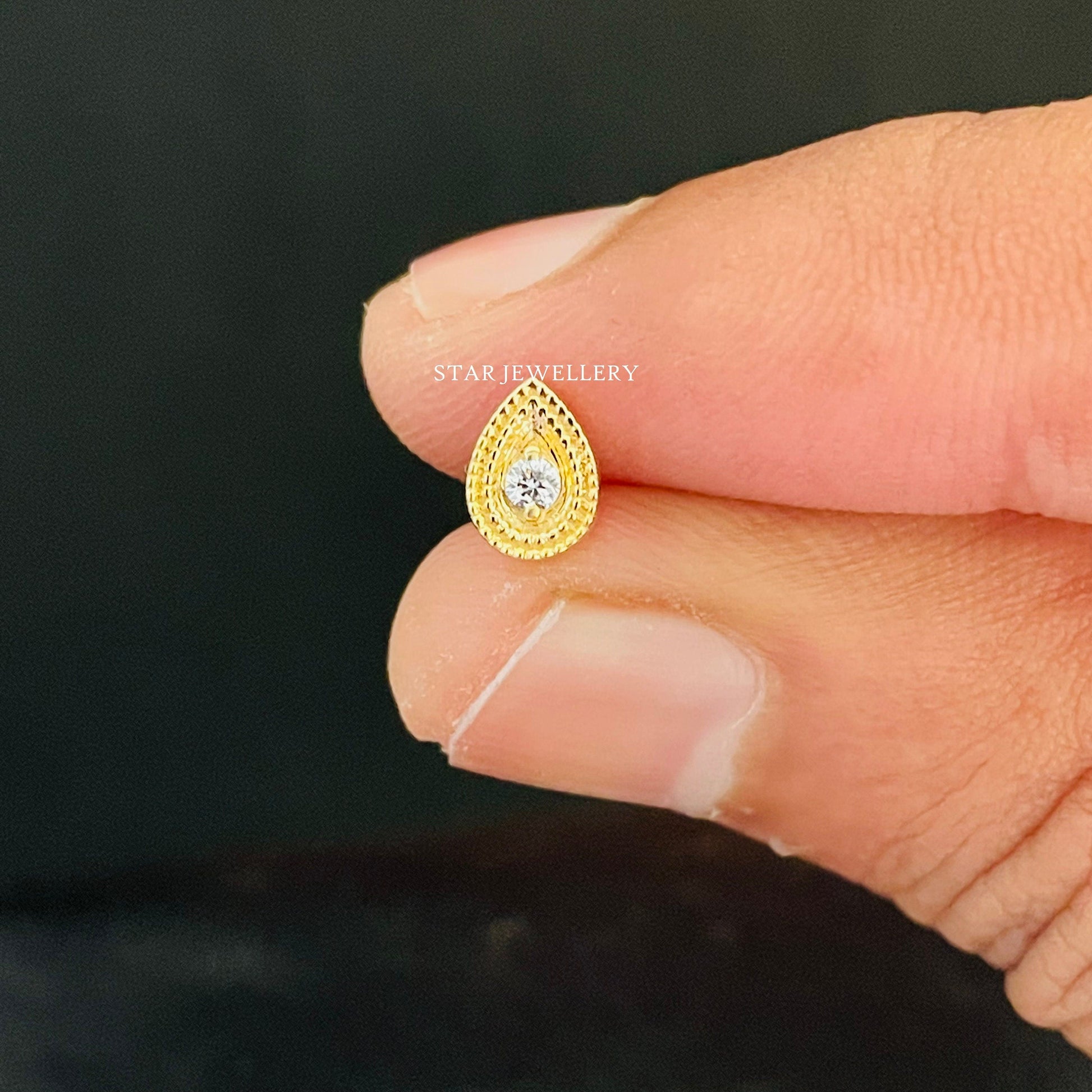14K Solid Gold Natural Diamond Pear Stud, Double Miligrain Natural Diamond Stud, Pear Shape Natural Diamond Stud for Rook, Tragus, Helix