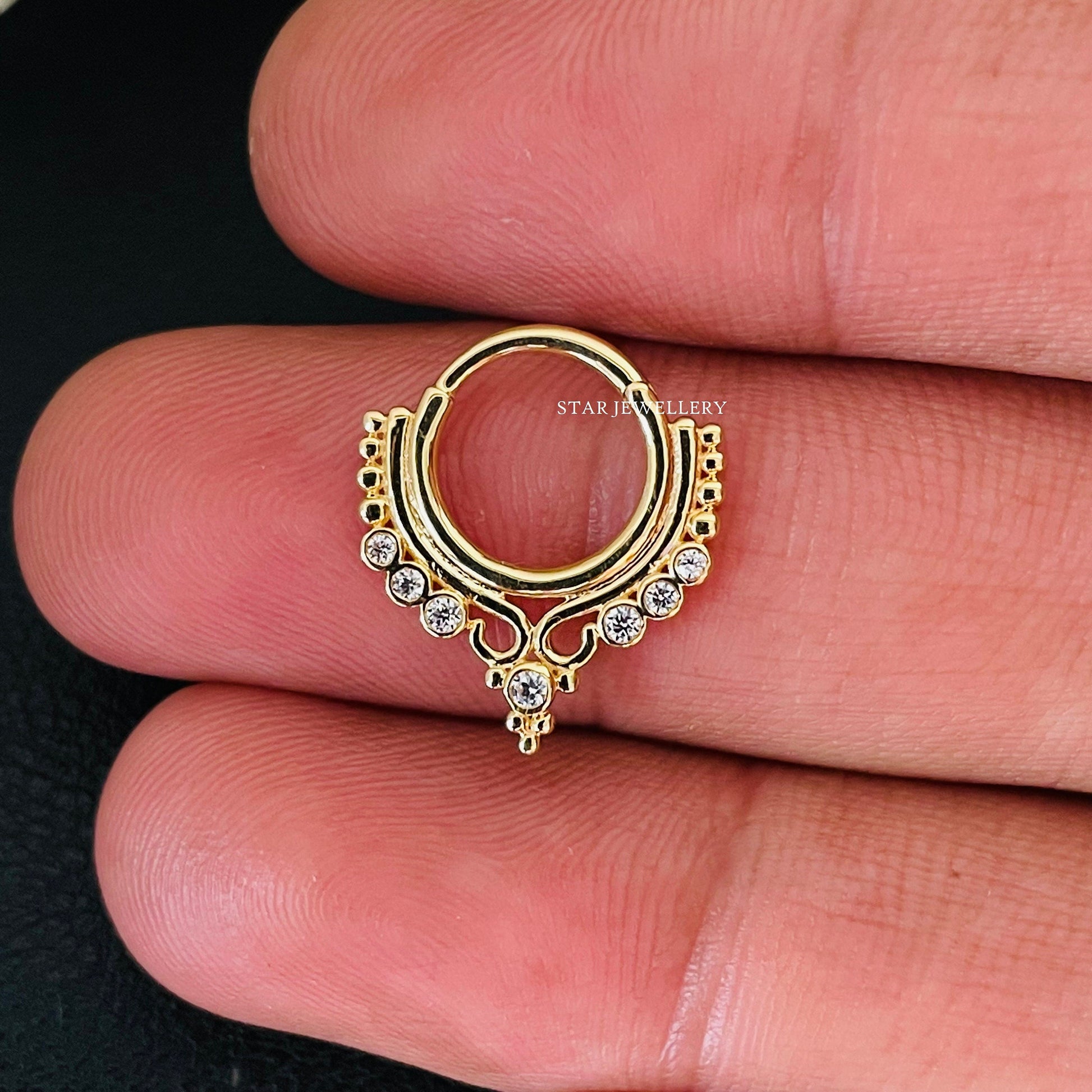 Bezel Set Diamond Daith Clicker, 14K Solid Gold Septum Ring for her, Lab Grown Diamond Daith Piercing, Helix Daith Piercing, Septum Nose Ring
