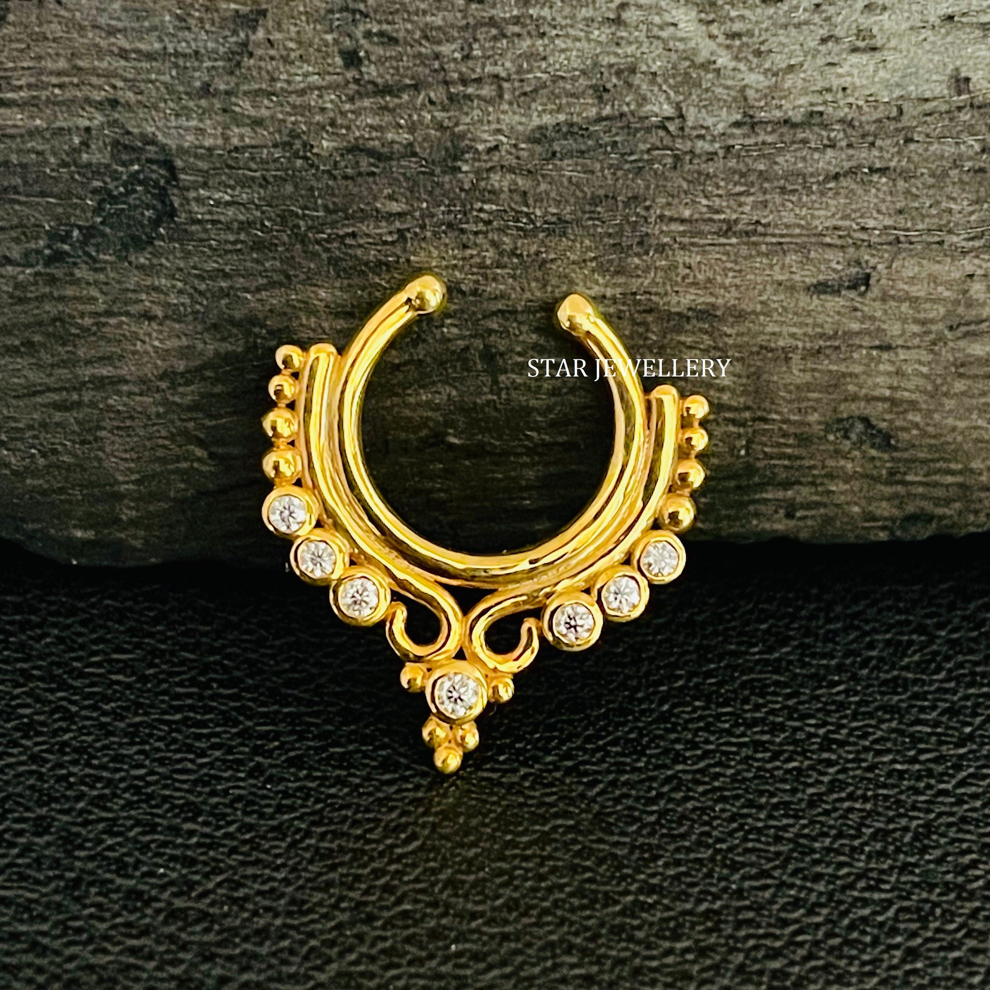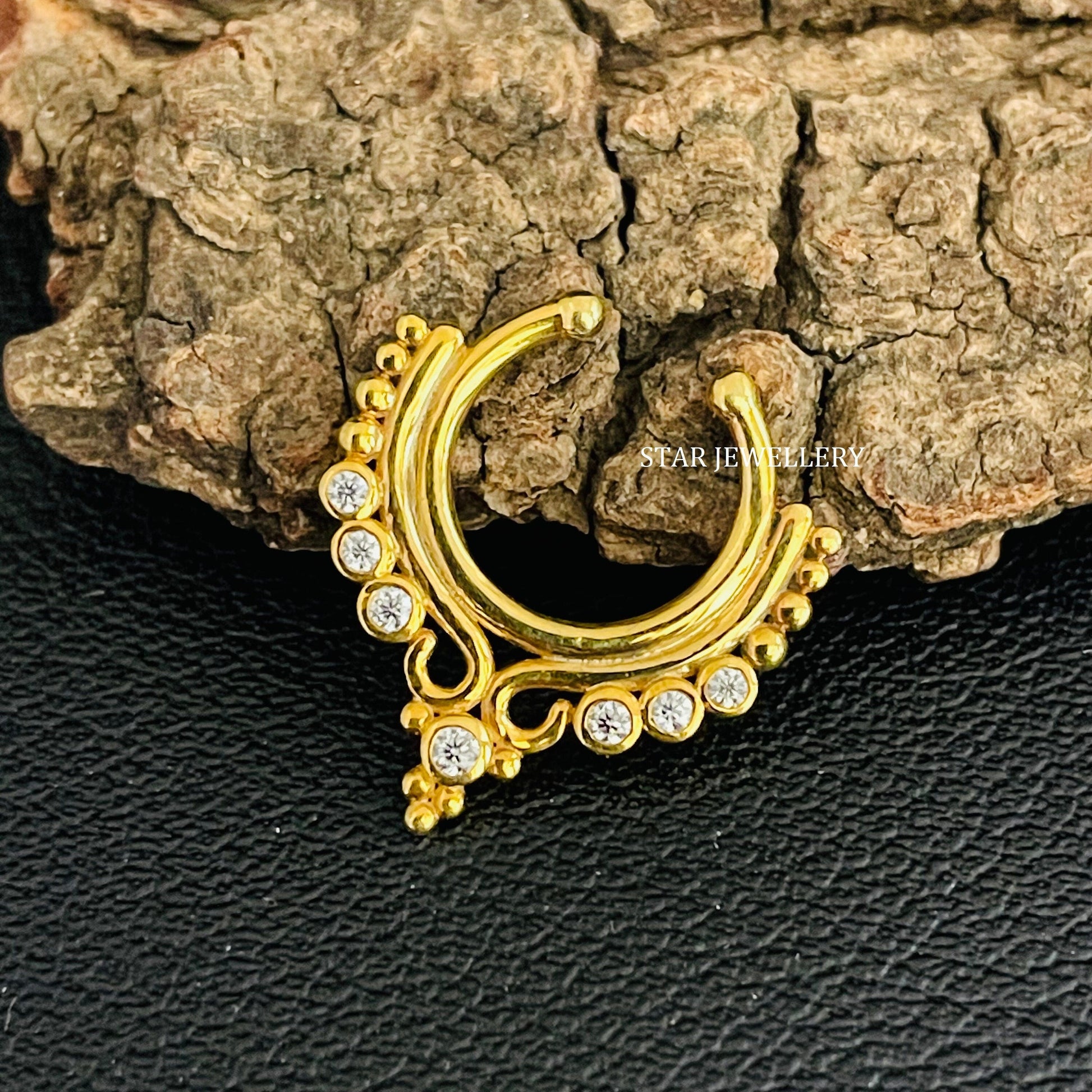 Bezel Set Diamond Fake Daith Clicker, 14K Solid Gold Fake Septum Ring for her, Natural Diamond Fake Daith Piercing, Helix Daith Piercing