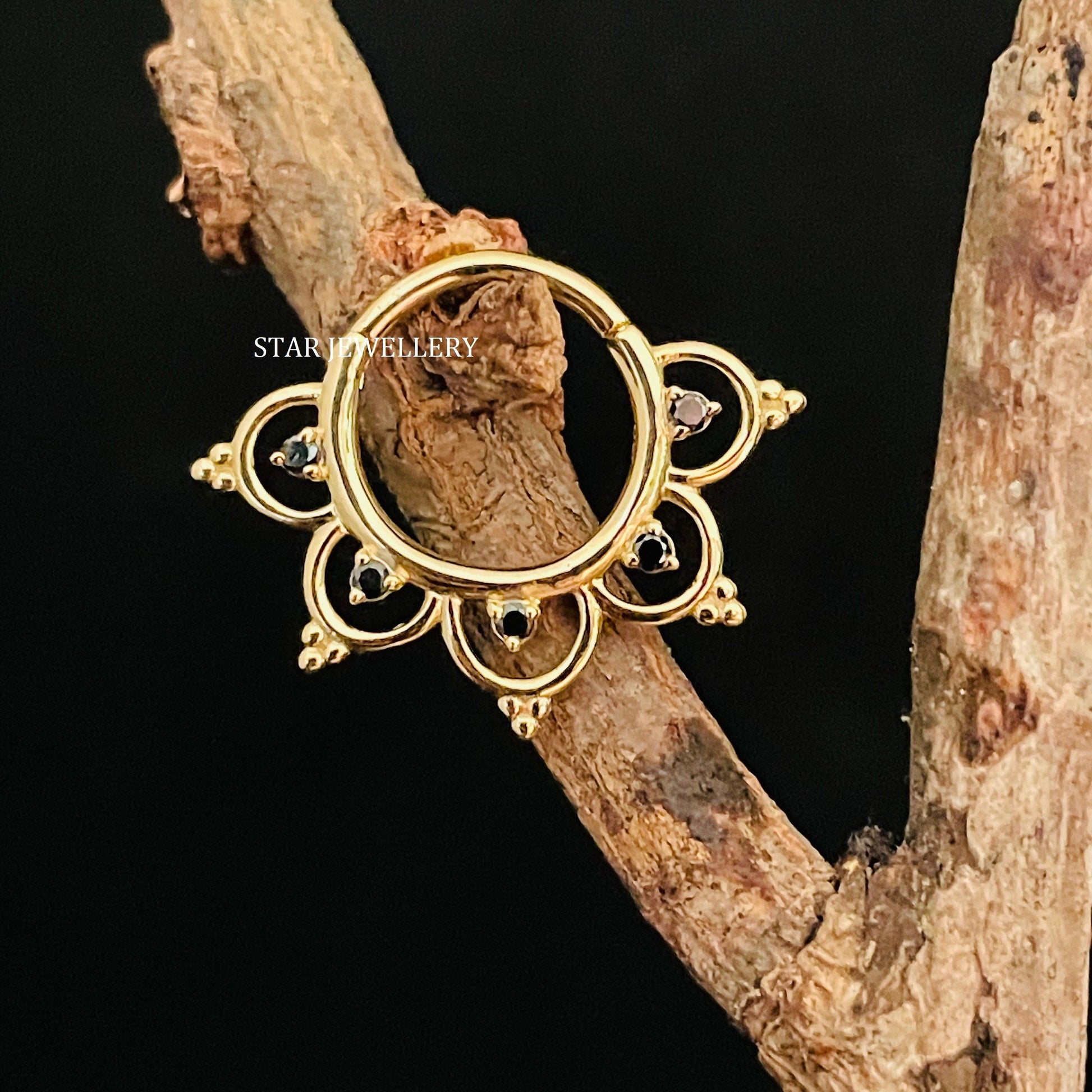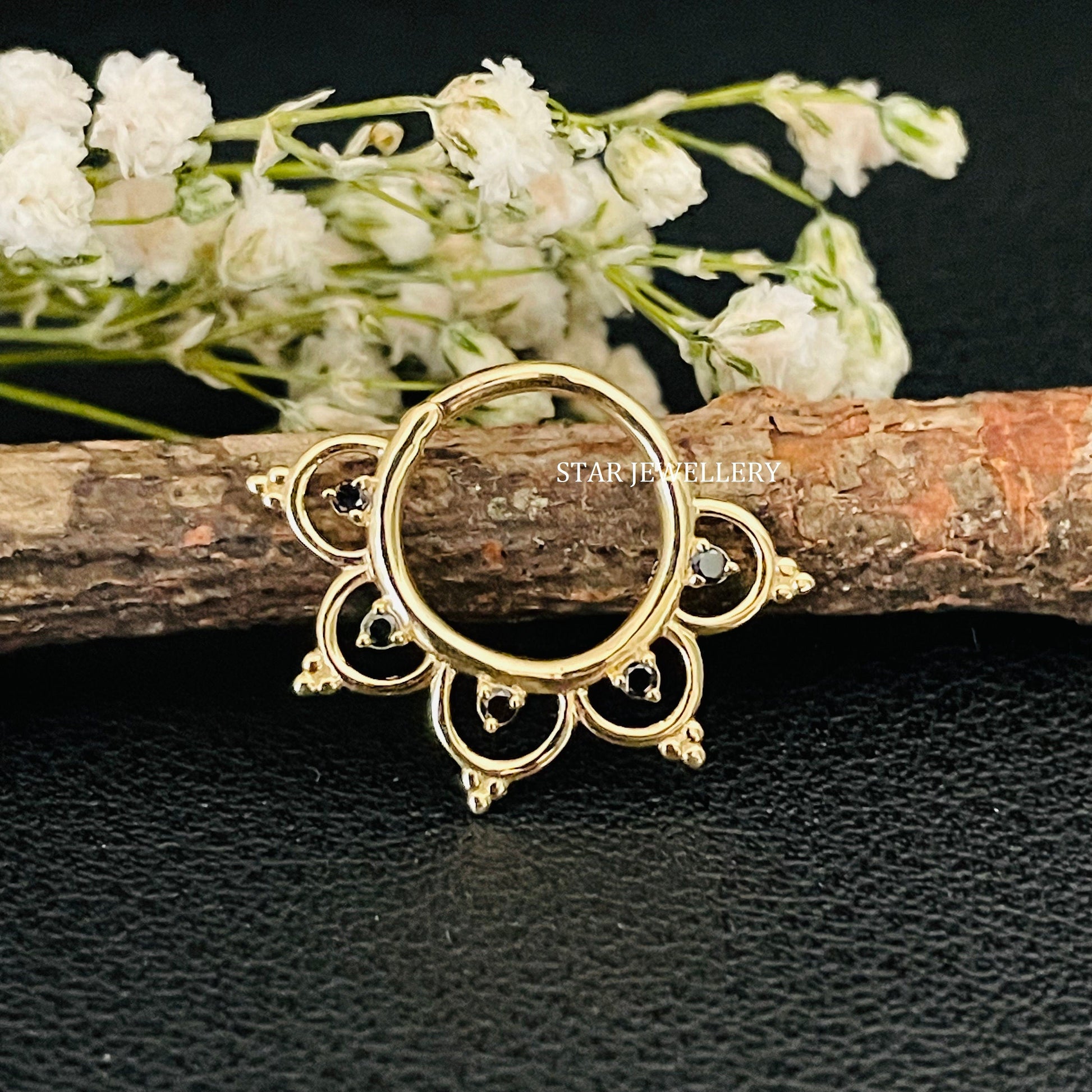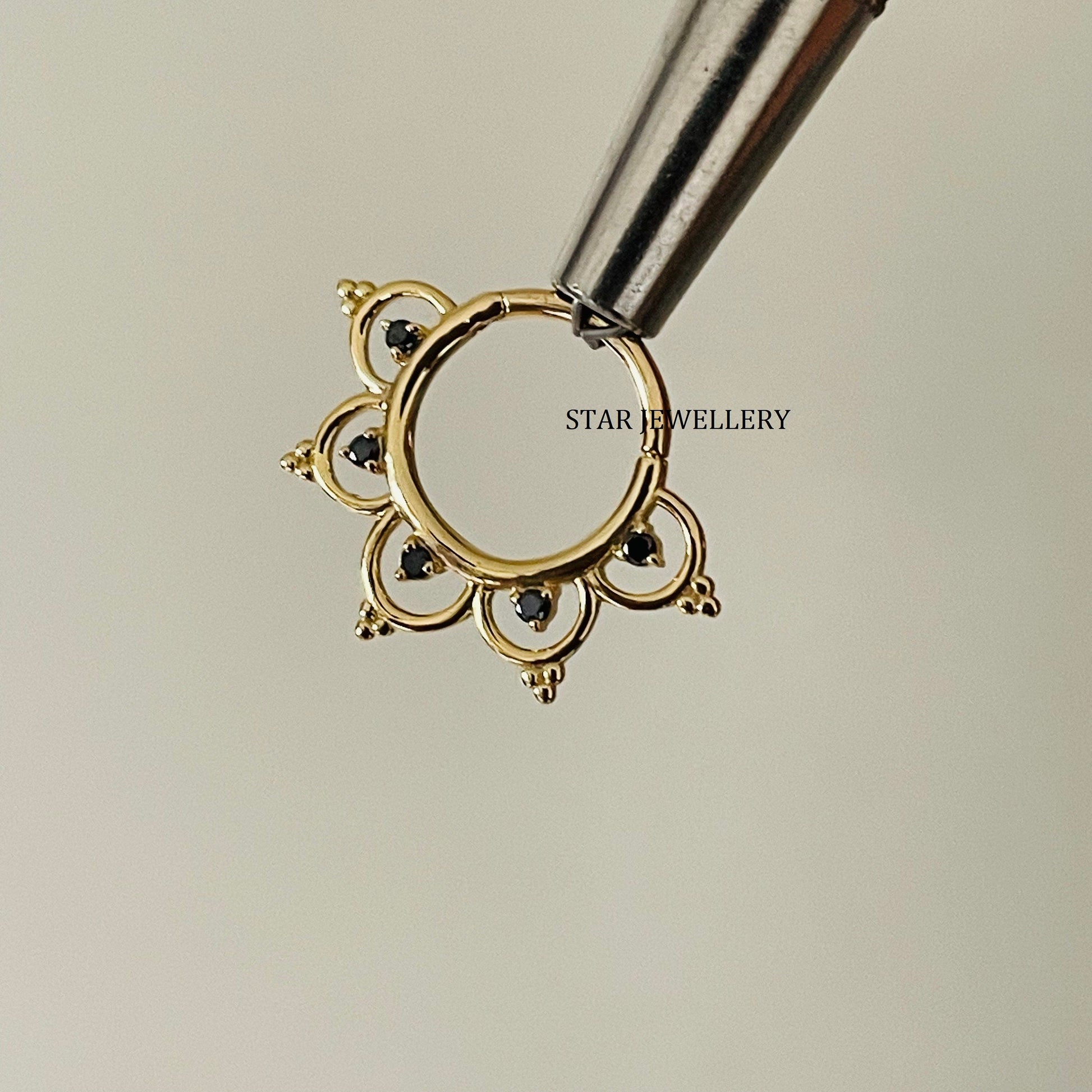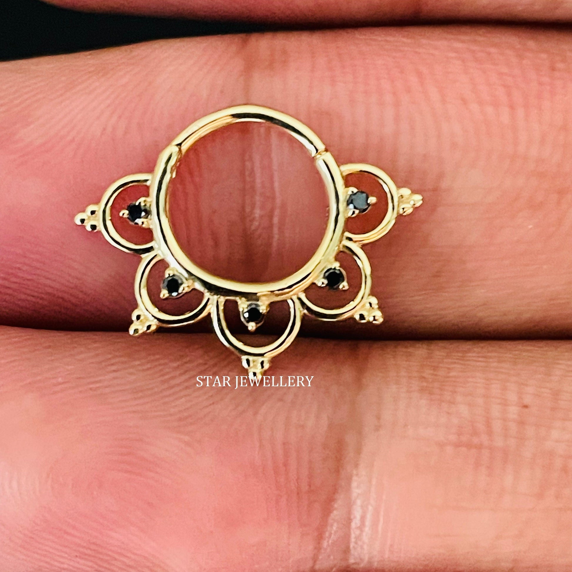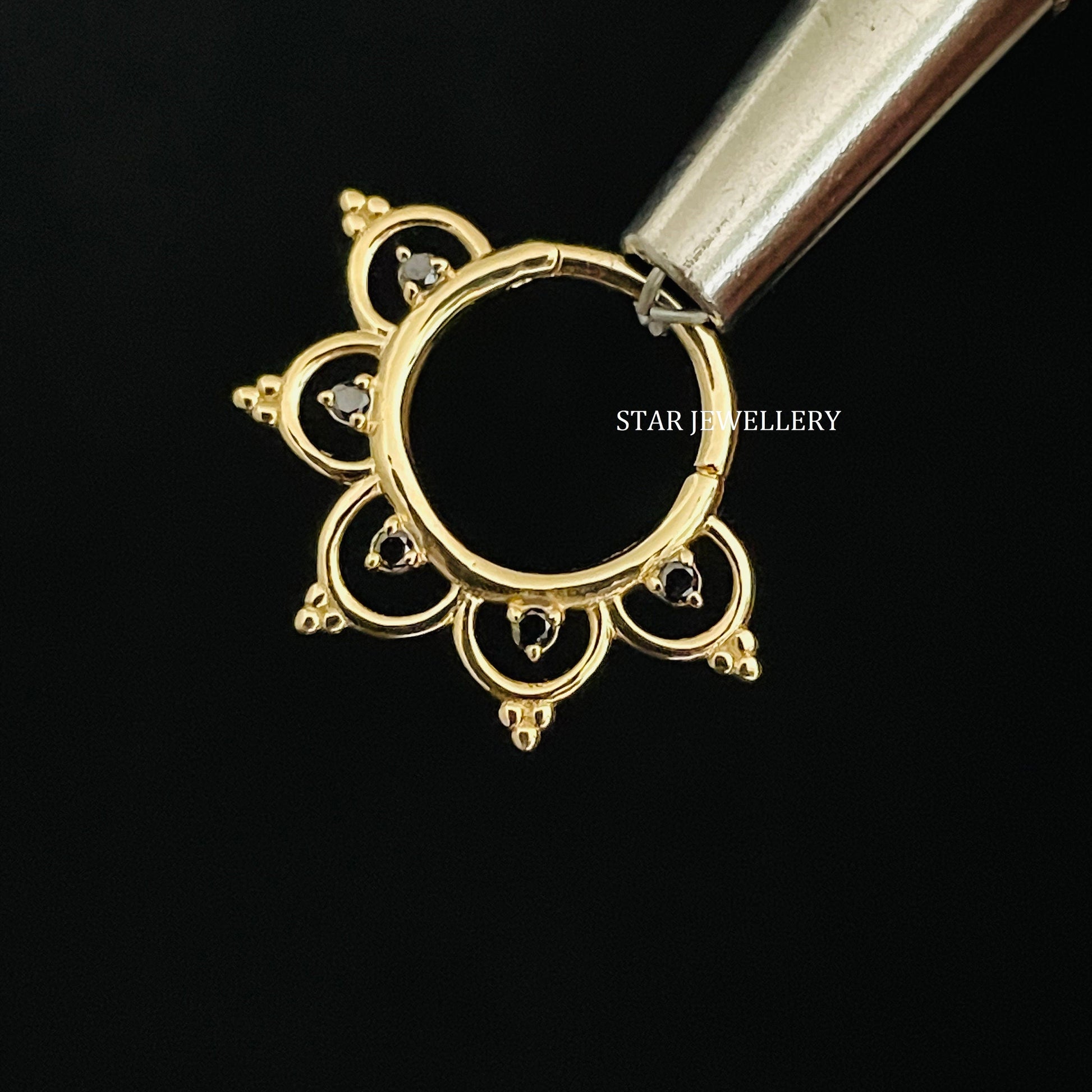 Black Diamond Septum Nose Ring, 14K Solid Gold Natural Black Diamond Daith Piercing, Diamond Clicker Daith Piercing, Diamond Septum Clicker
