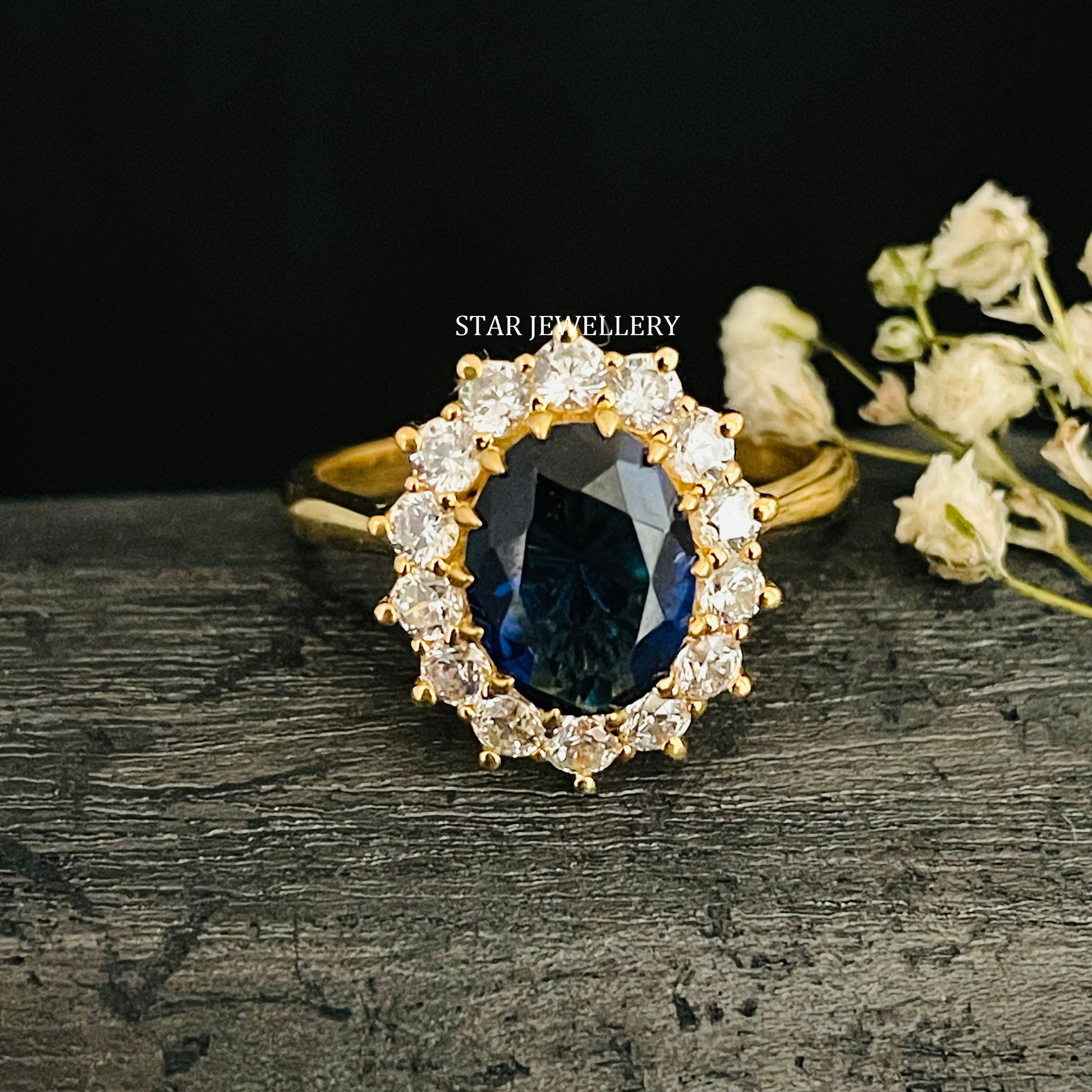Blue Sapphire Diamond Halo Ring, 14 K Gold Blue Sapphire Halo Diamond Ring, 14K Solid Gold Sapphire Diamond Halo Bridal Ring for her