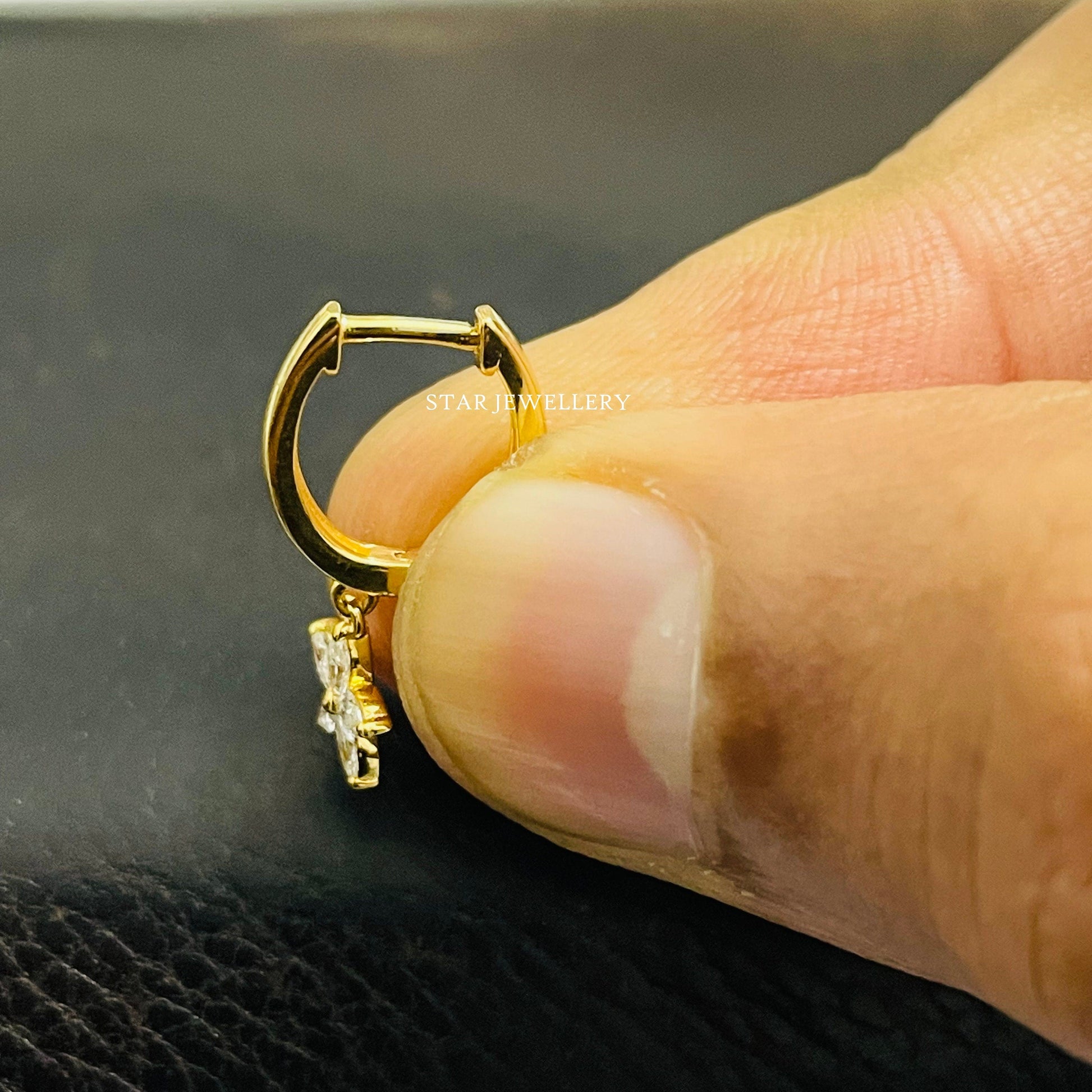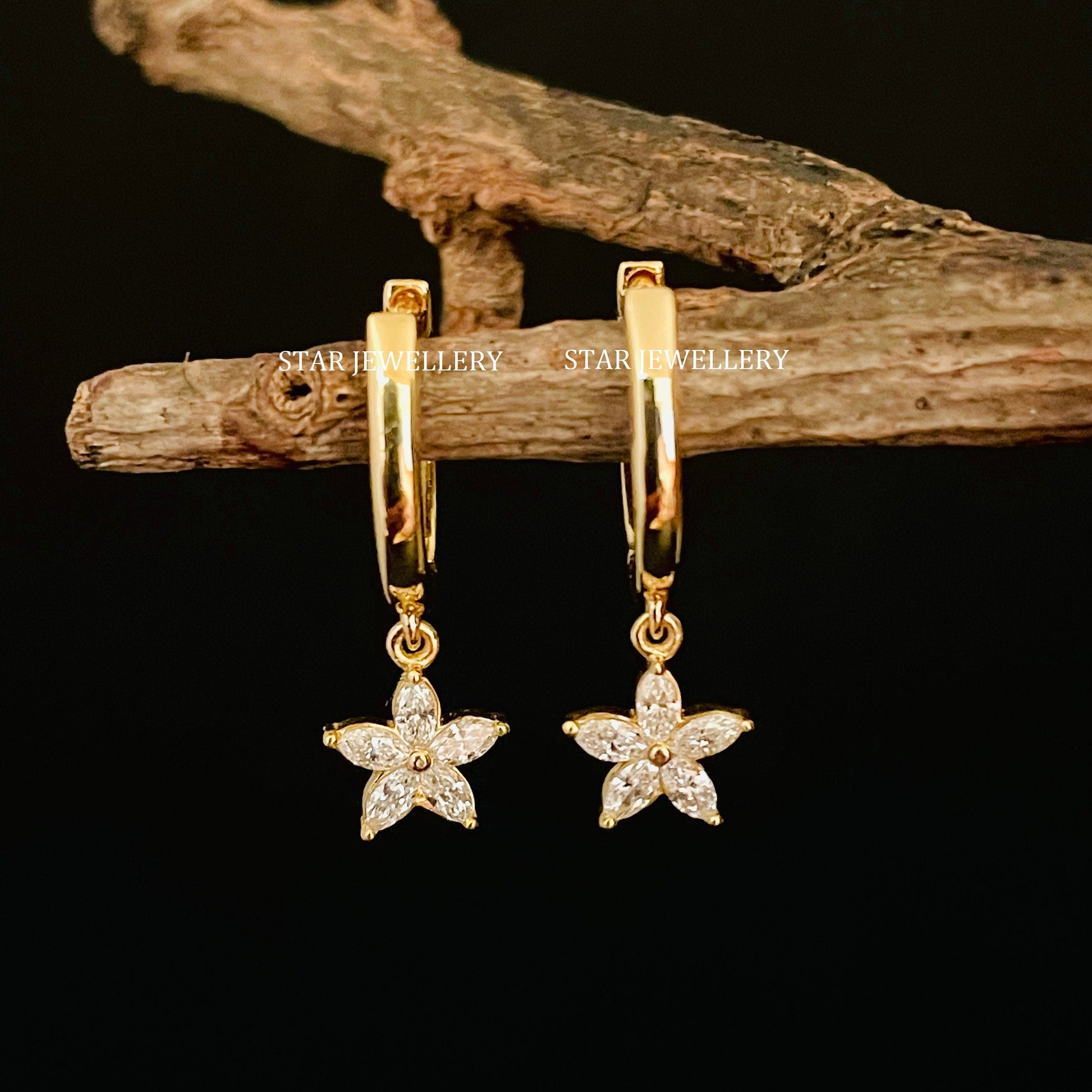 Dangle Drop Diamond Flower Huggie Hoop, Marquise Cut Diamond Flower Drop Hoop Earring, 14K Solid Gold Dangle Drop Flower Hoop Earring