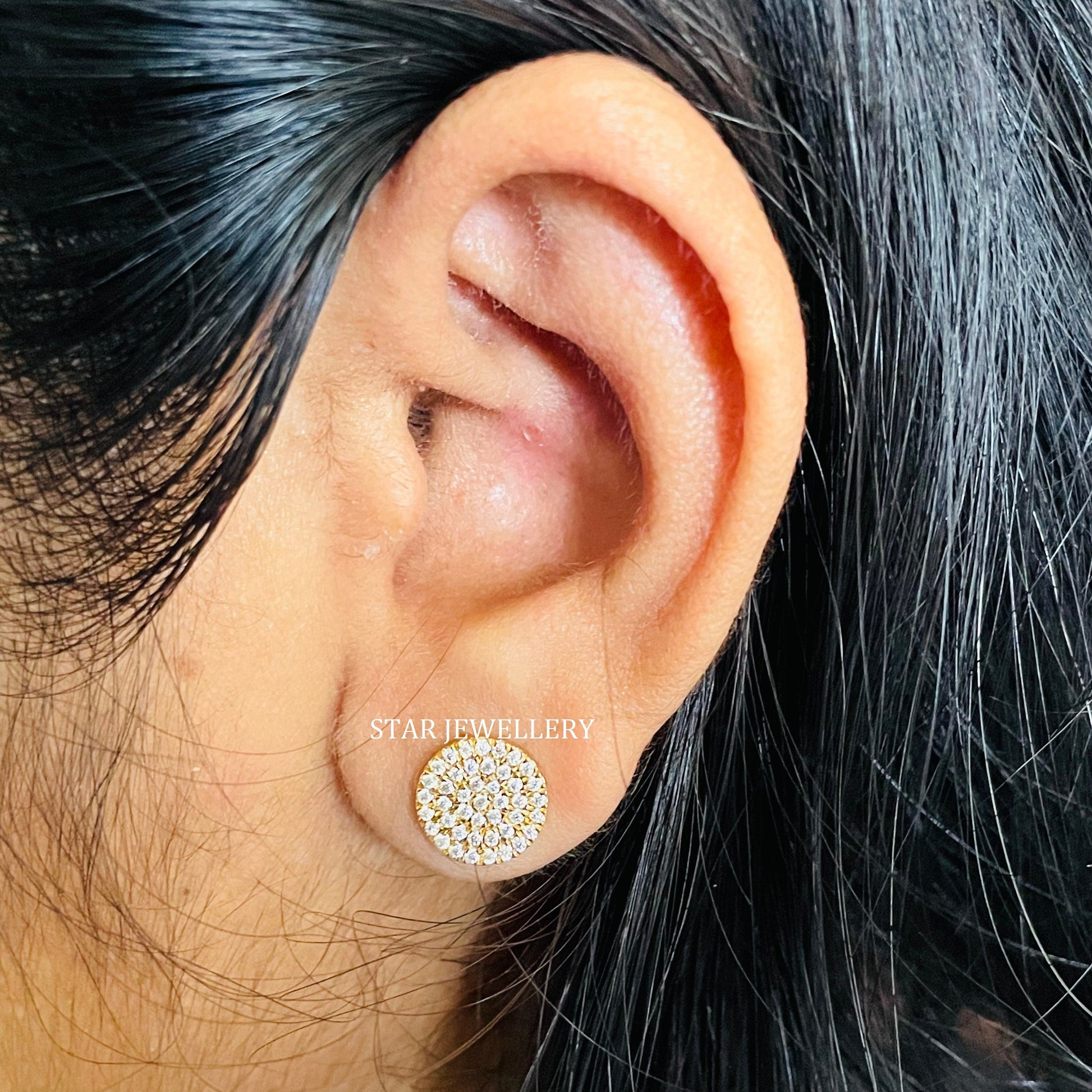 Diamond Disc Earring, 14K Solid Gold Pave Set Diamond Circle Earring, Graduation Gift Earring for her, White Gold Bridal Disc Earring, Solid Gold Geometric Earrings.