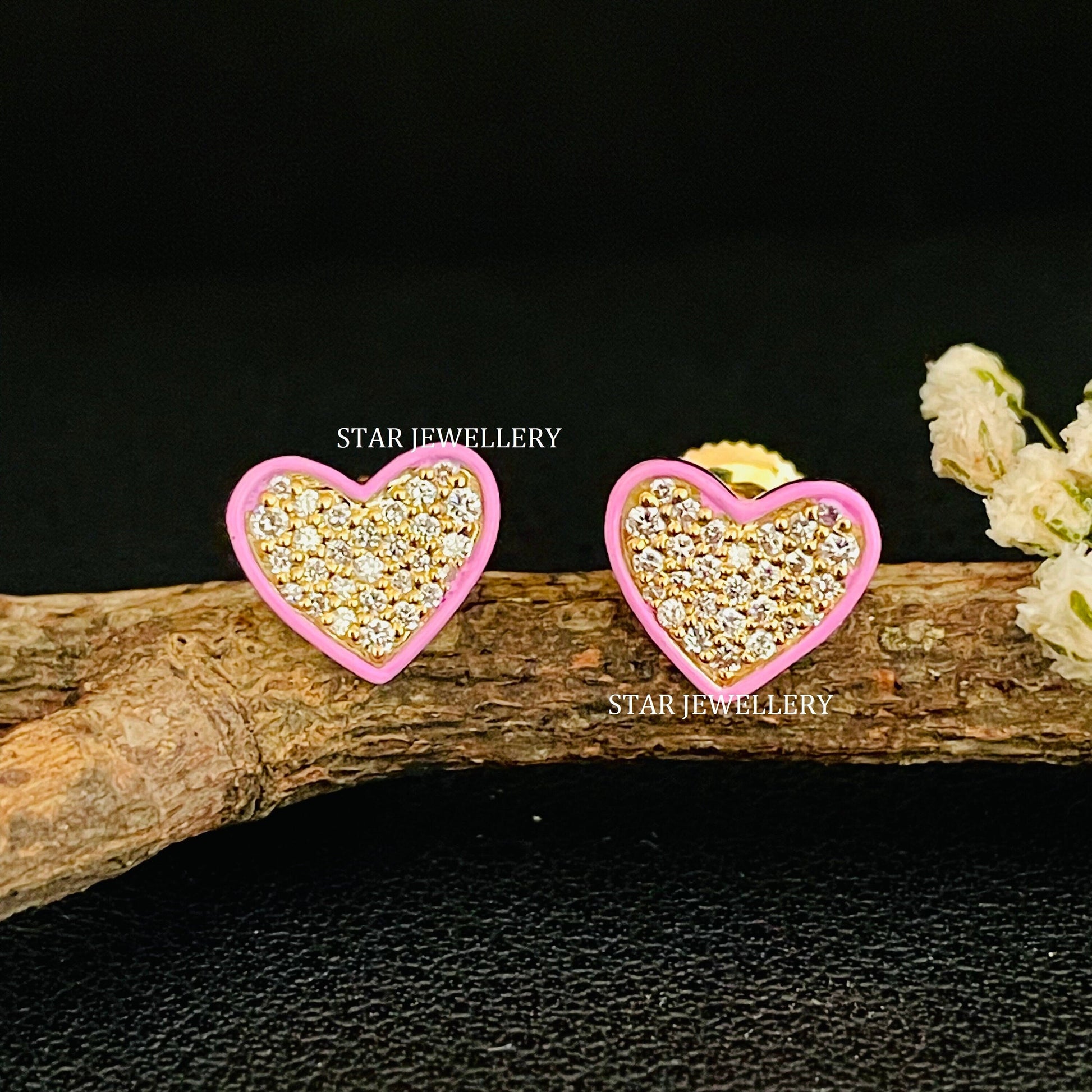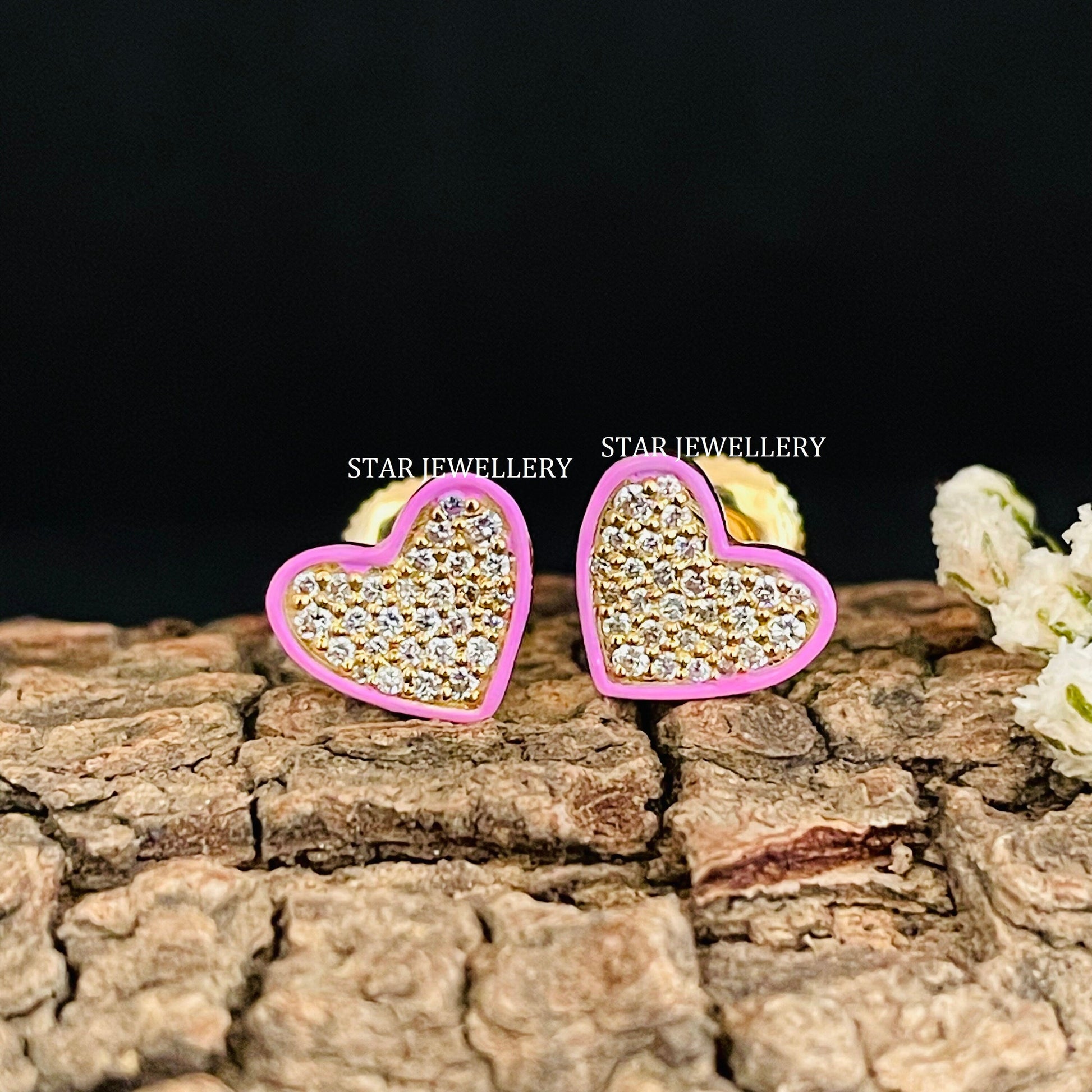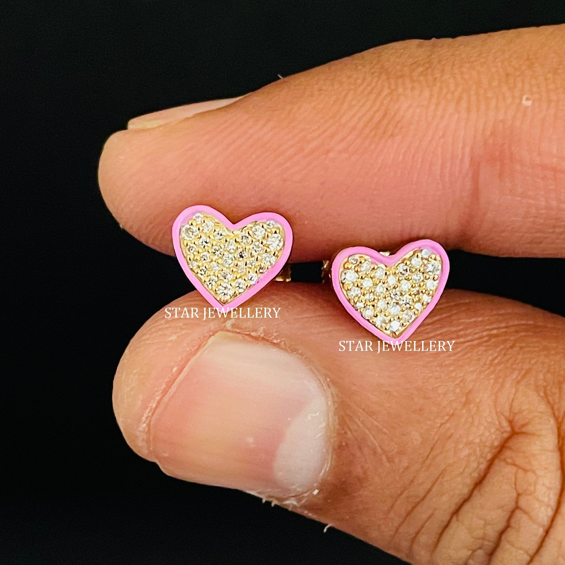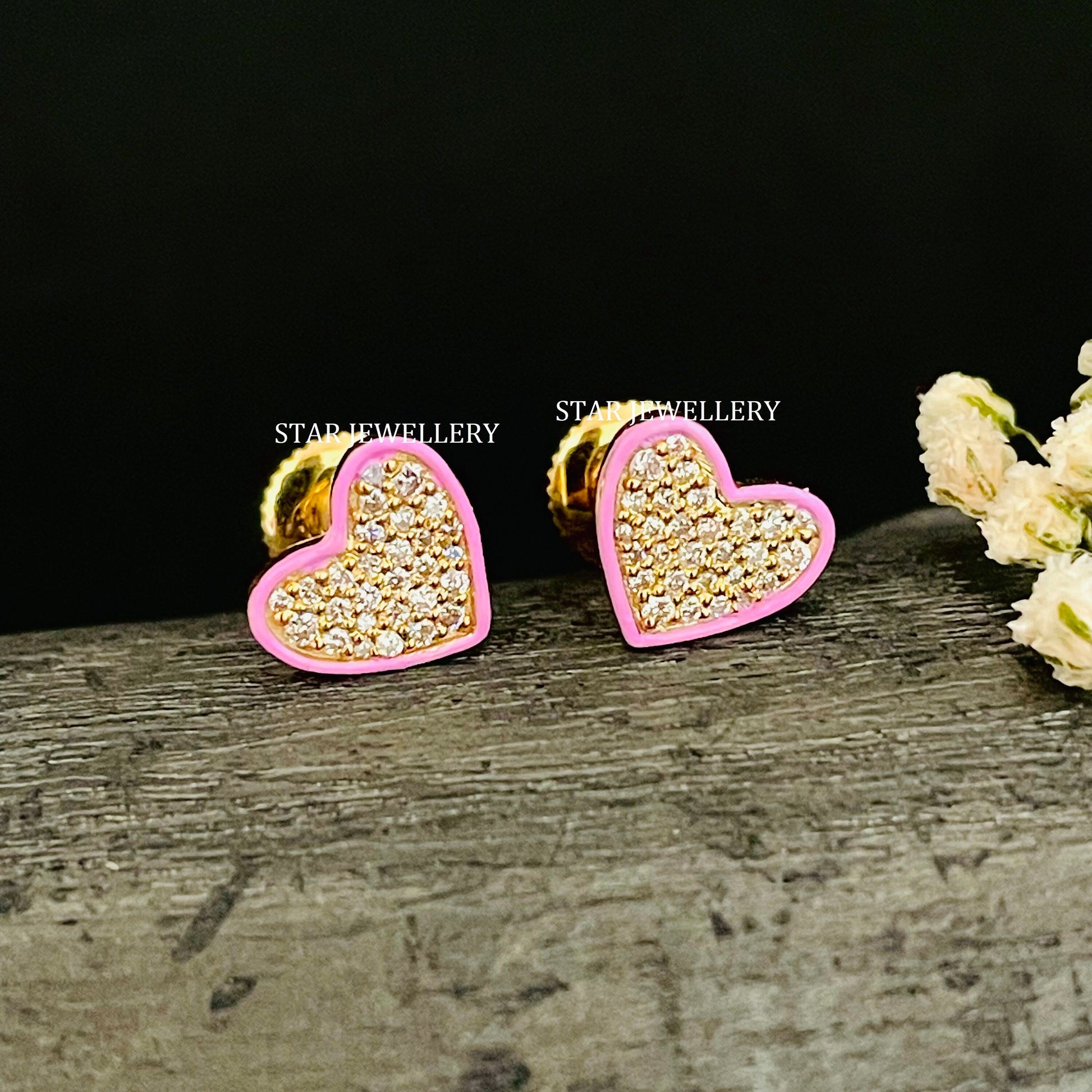 Diamond Heart Stud Piercing with Pink Enamel for Tragus, Lobe, Conch, 14K Gold Diamond Heart Piercing with Enamel, Enamel Heart Piercing, Piercing Jewelry, Body Heart Jewelry