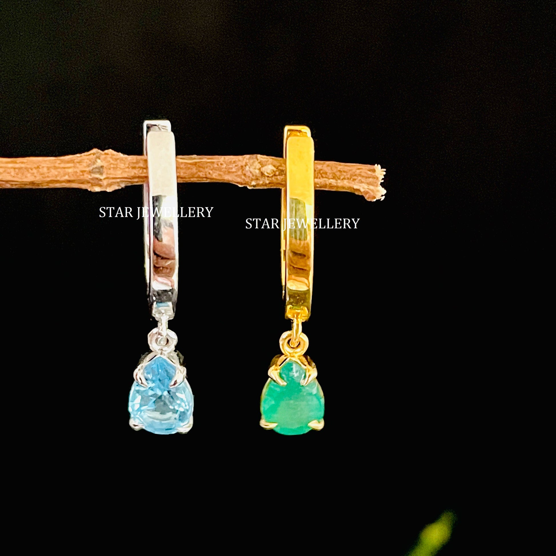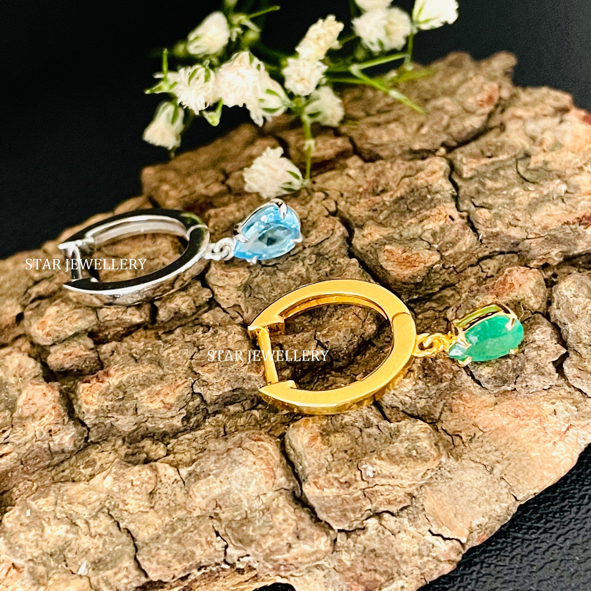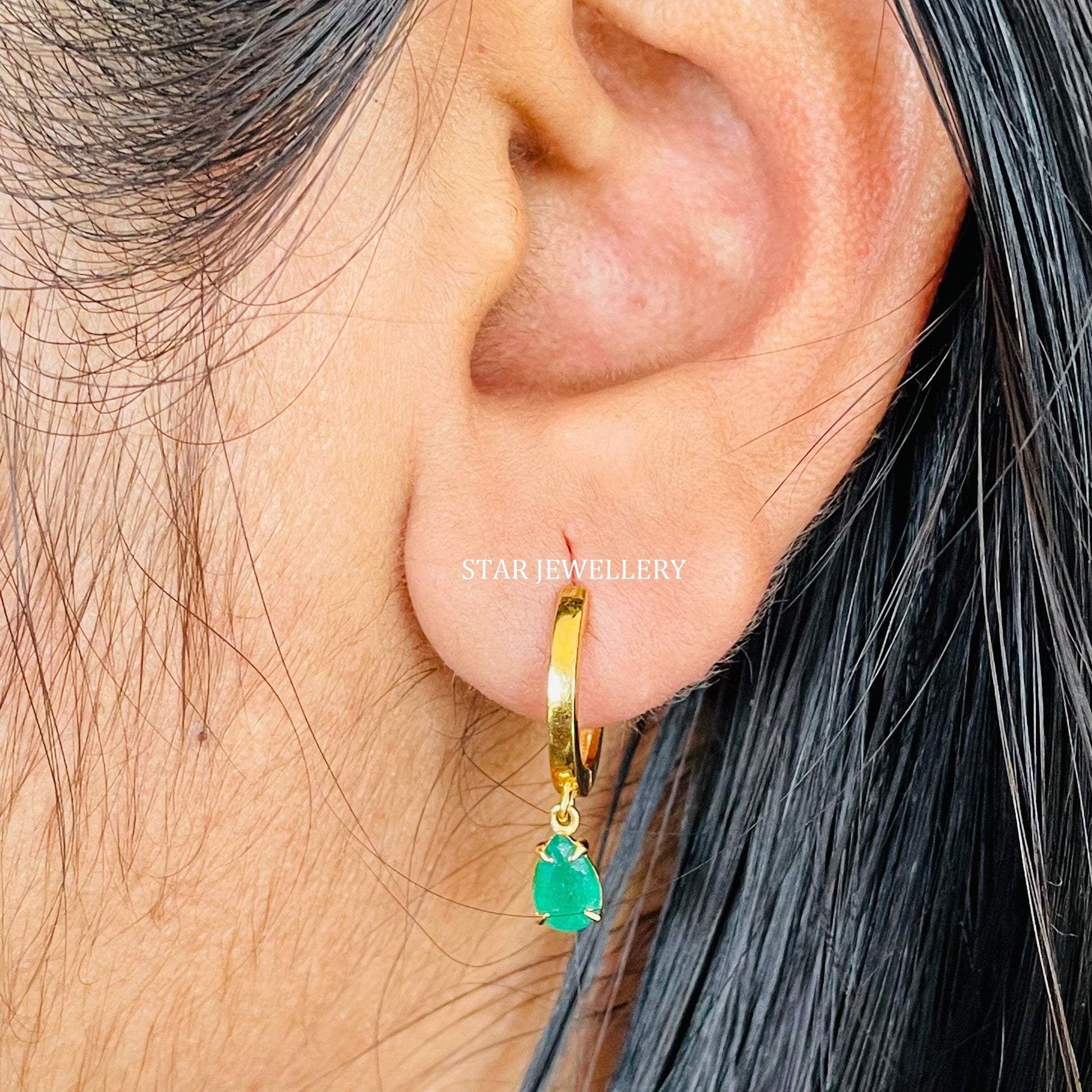 14K Solid Gold Huggie Hoop with Natural Pear Cut Emerald. A Perfect piercing for first and second ear lobe, Huggie Hoop with Tear Drop Natural Emerald. The Gold Hoop with gemstone customization. The size of the gemstone will be customized according to need of buyer.