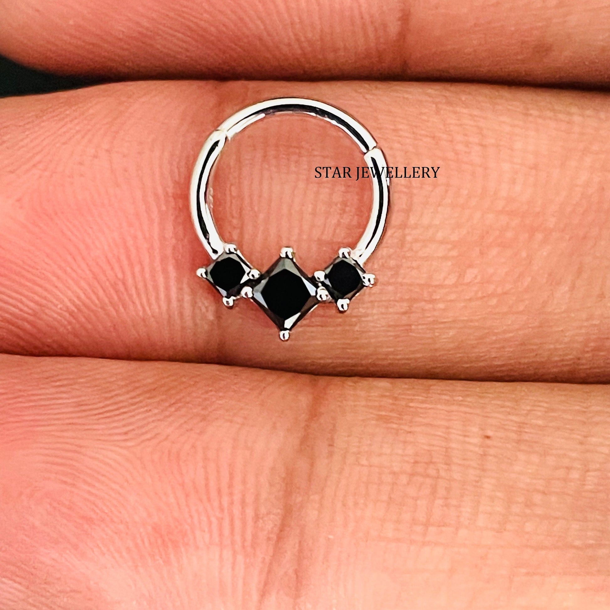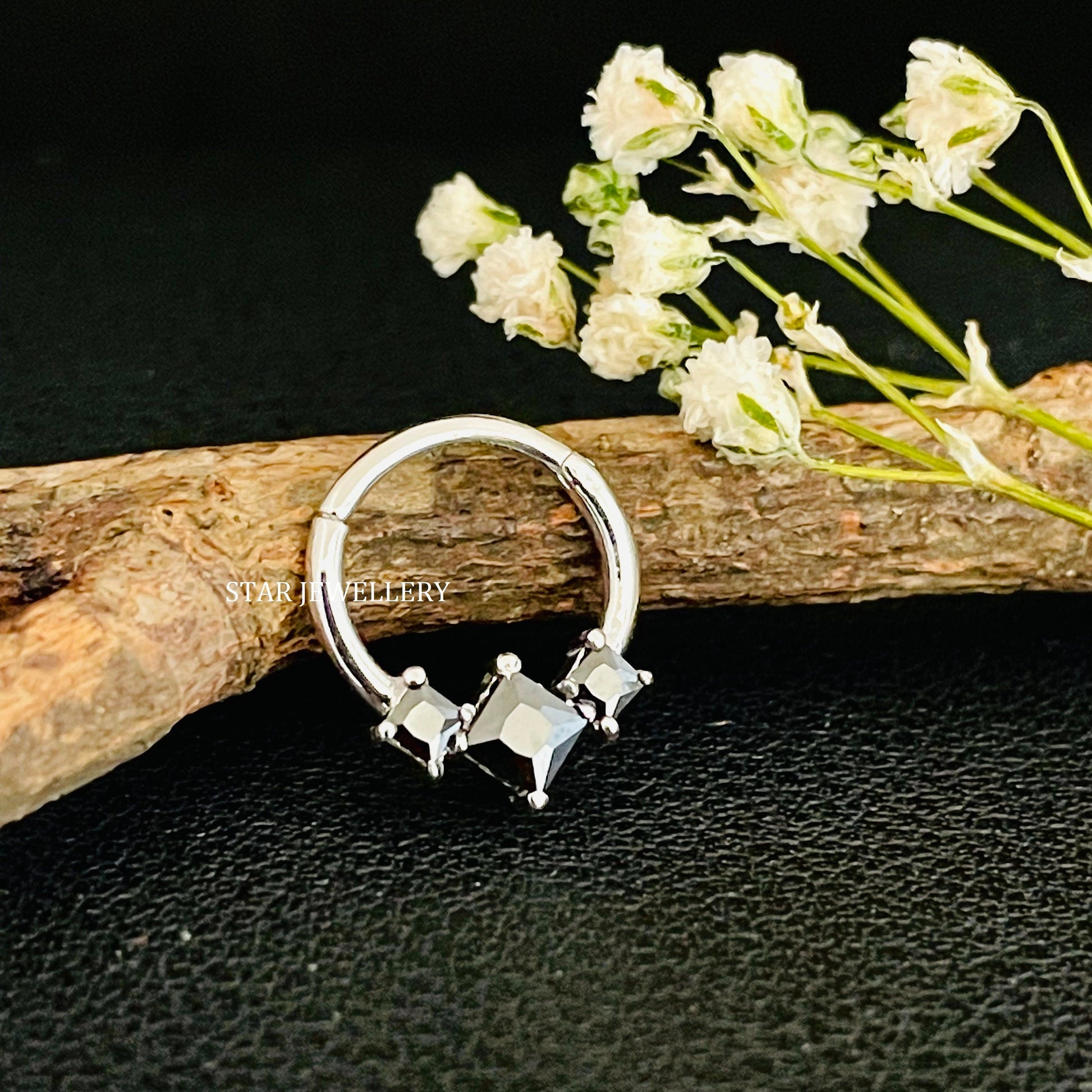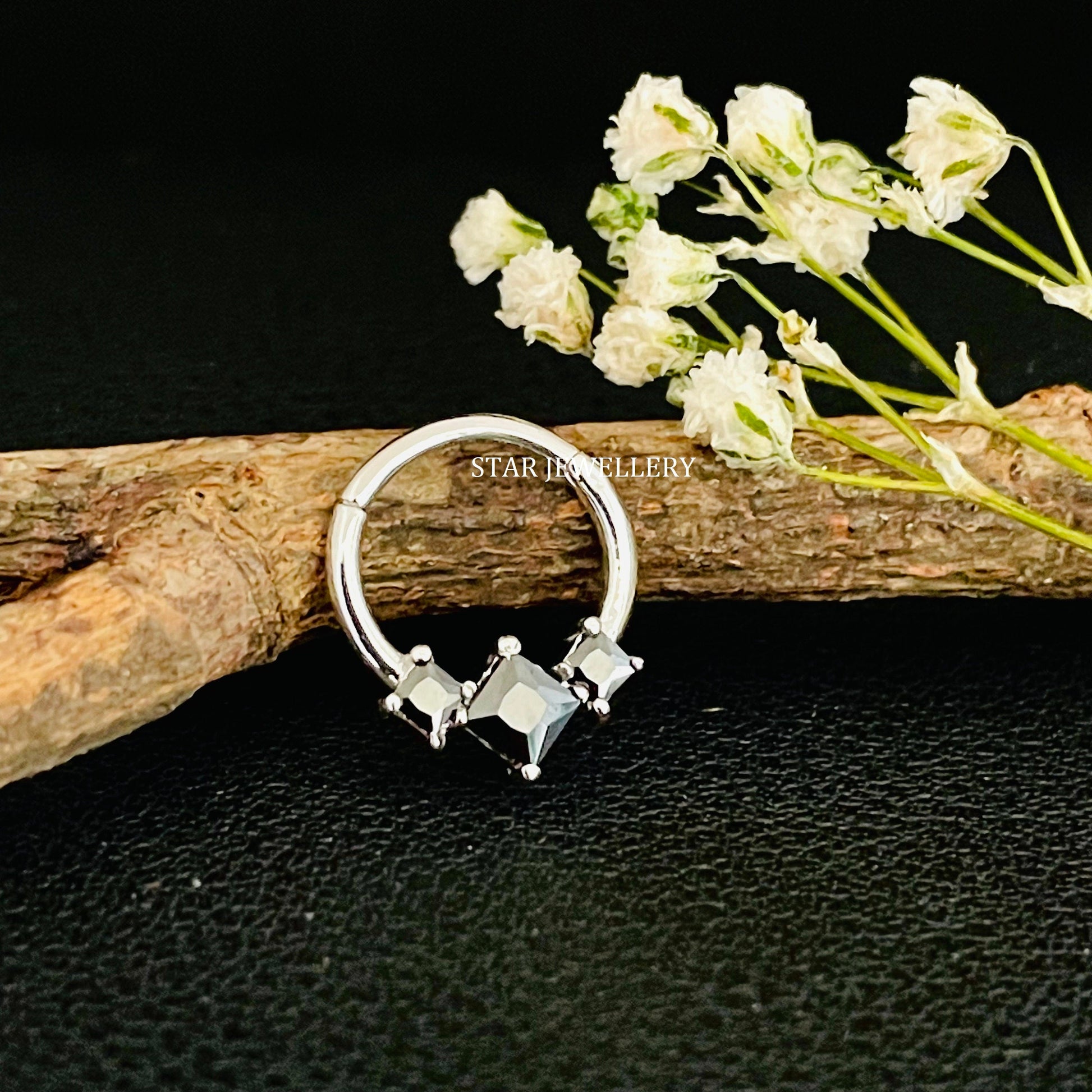 Genuine Princess Cut Black Diamond Trio Stone Septum Clicker, Three Stone Princess Cut Diamond Daith Clicker, Black Diamond Septum Piercing