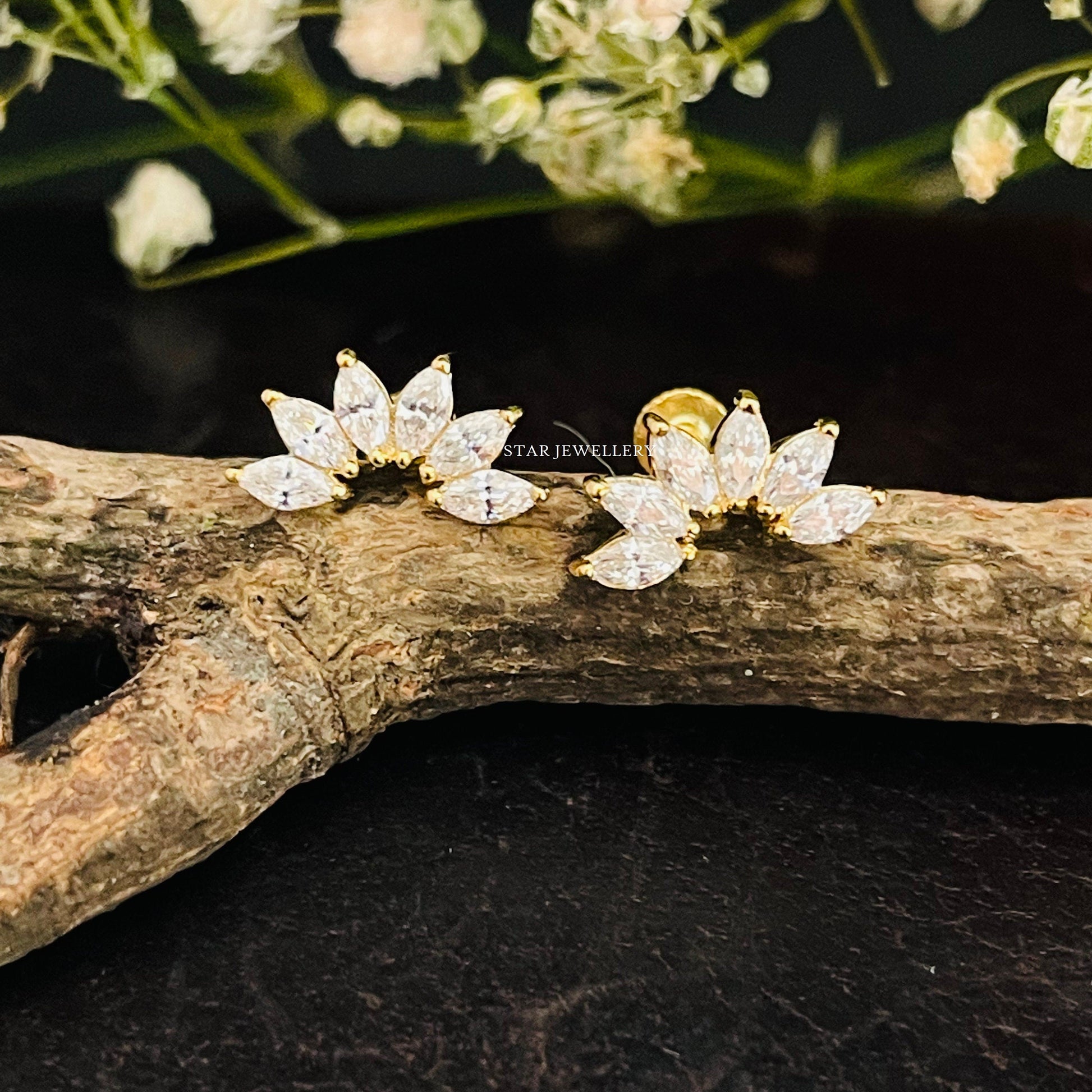 Lotus Flower Piercing for Ear Lobe, 14K Solid Gold Lotus Stud Diamond Piercing, Tragus, Helix and Conch, Lotus Flower Piercing with CZ