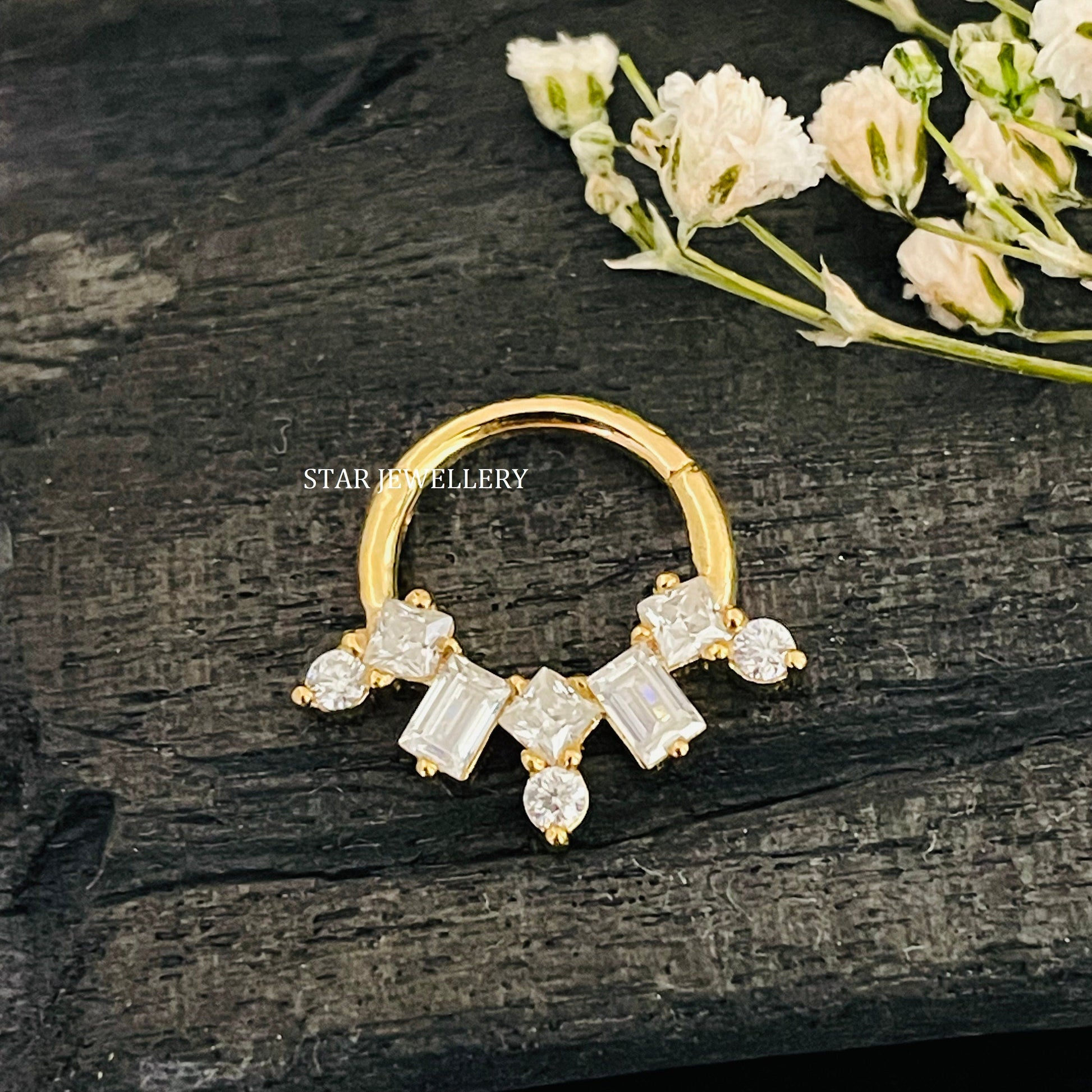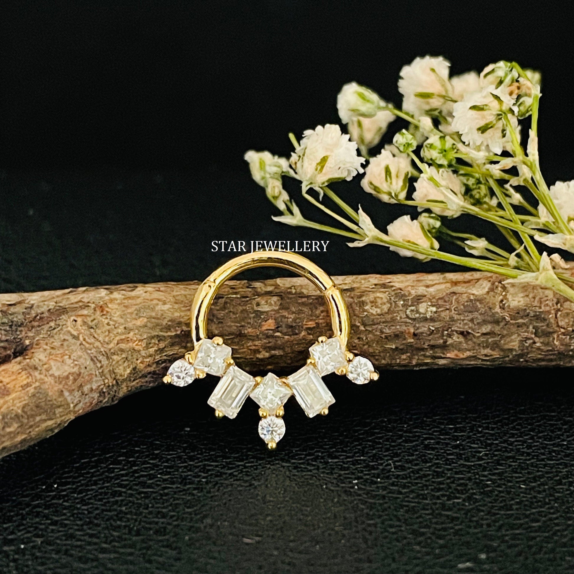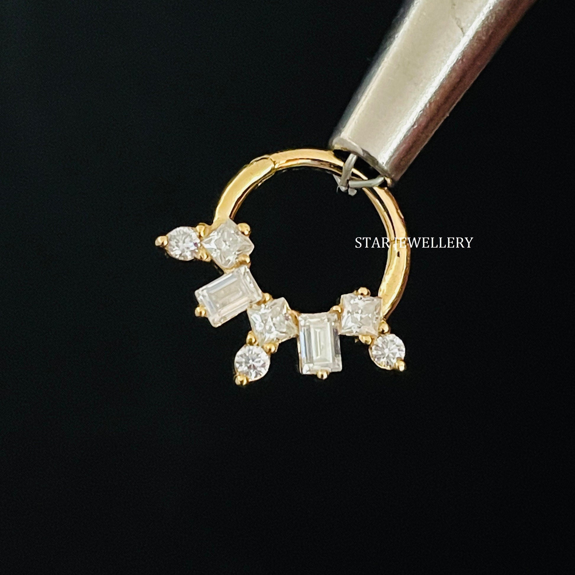 Multi Stone Diamond Septum Clicker, Round and Baguette Cut Moissanite Daith Clicker, 14K Solid Gold Septum Piercing, Moissanite Septum