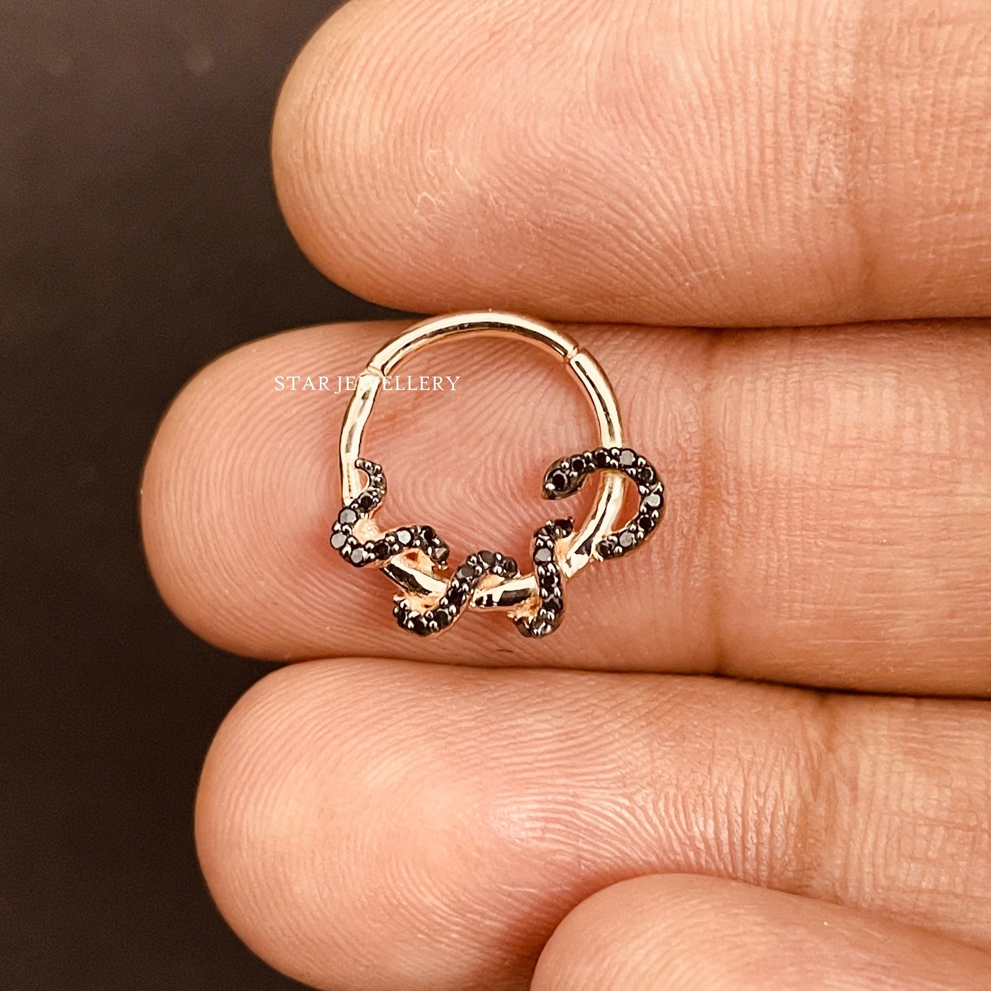 Natural Black Diamond Snake Septum Piercing, 14K Solid Gold Black Diamond Snake Daith Piercing for her, Solid Gold Snake Daith Clicker