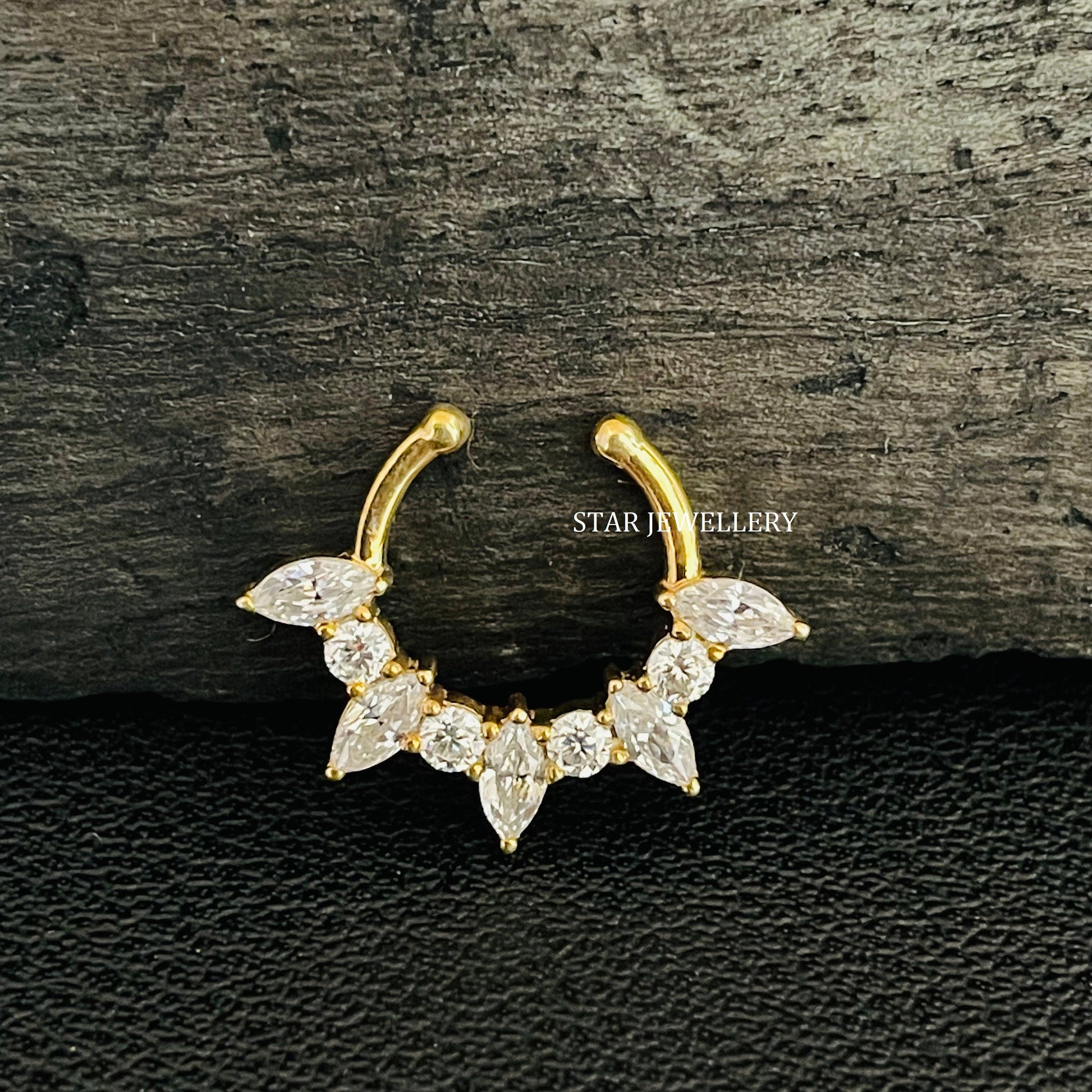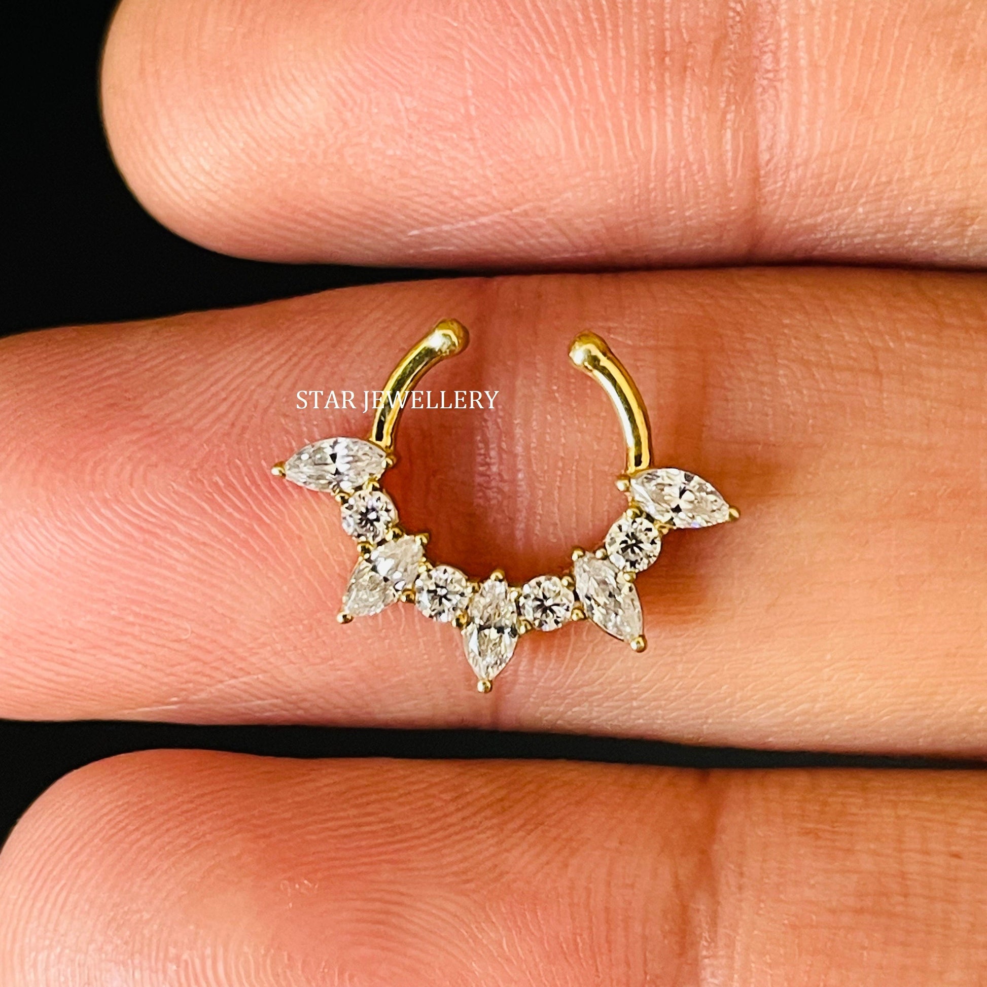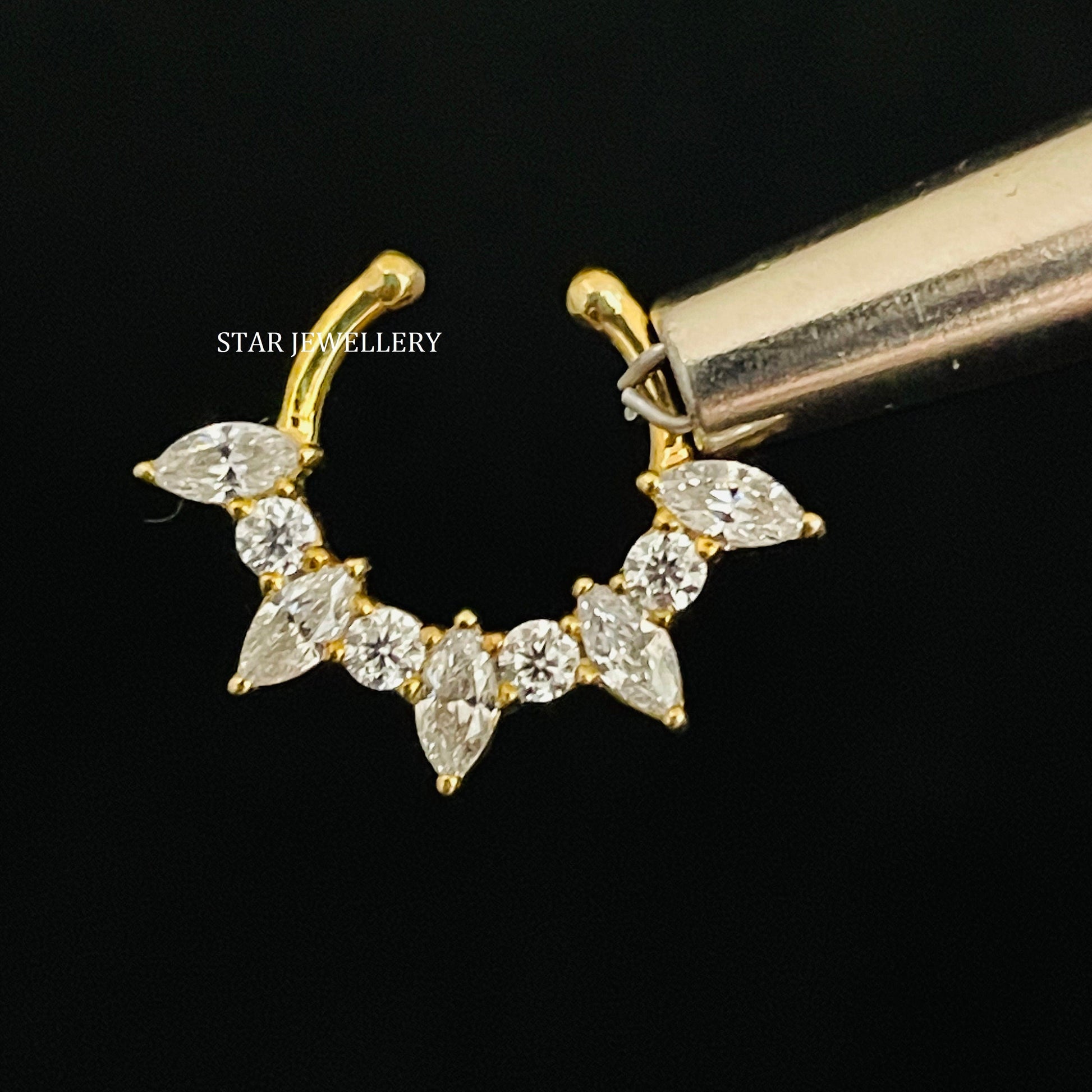 Natural Diamond 14K Solid Gold Fake Daith Piercing, 14k Solid Gold Marquise Diamond Fake Septum Nose Ring, Marquise Diamond Fake Septum Clicker for her