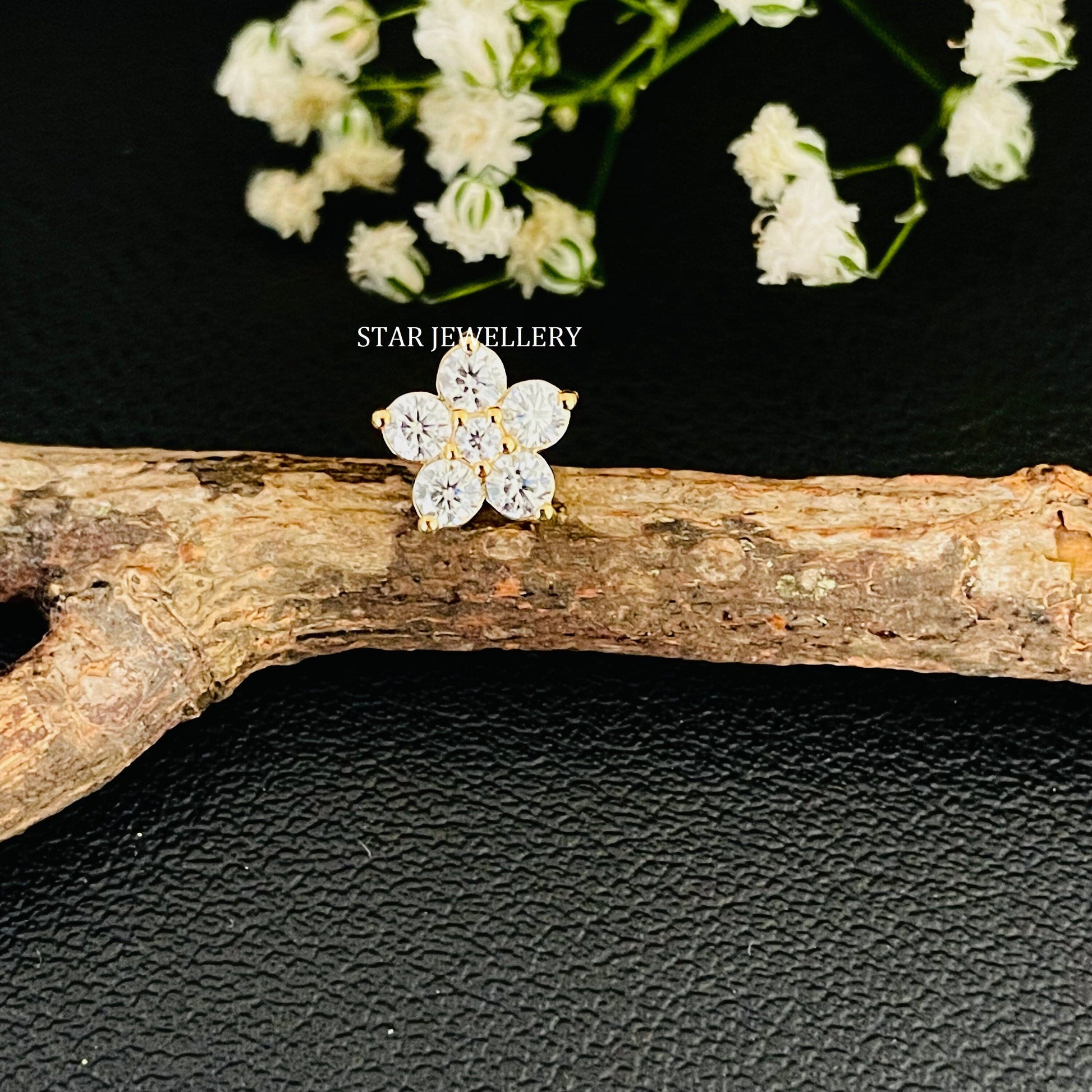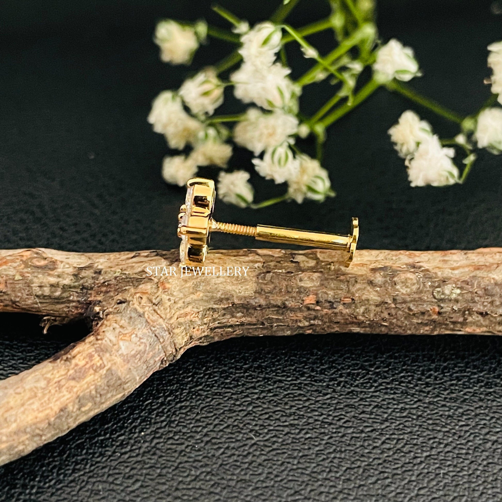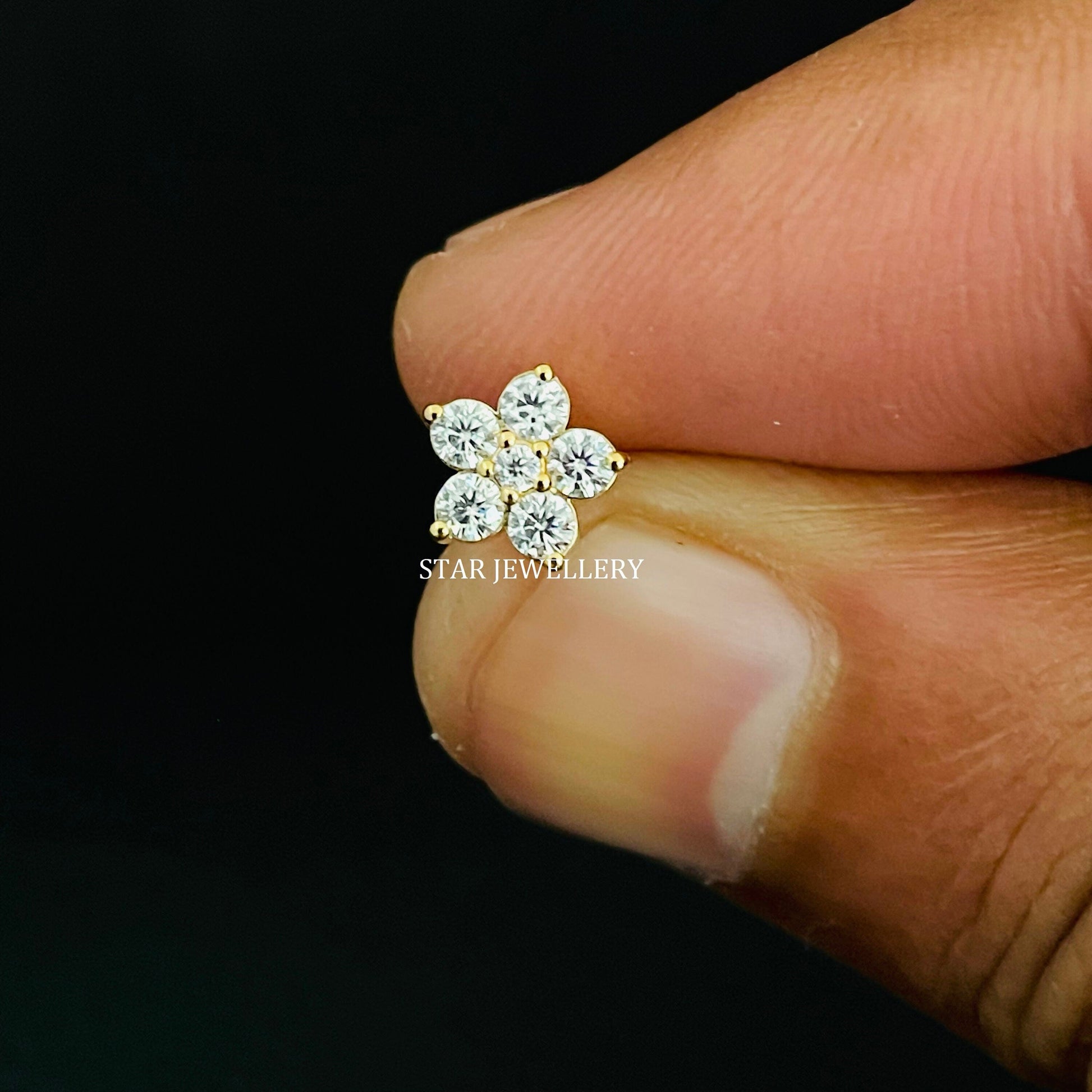 â–¶ Natural Diamond Flower Stud for Ear Piercing, 14K Solid Gold Diamond Cluster Earring, Prong Set Six Diamond Flower Piercing for earlobe