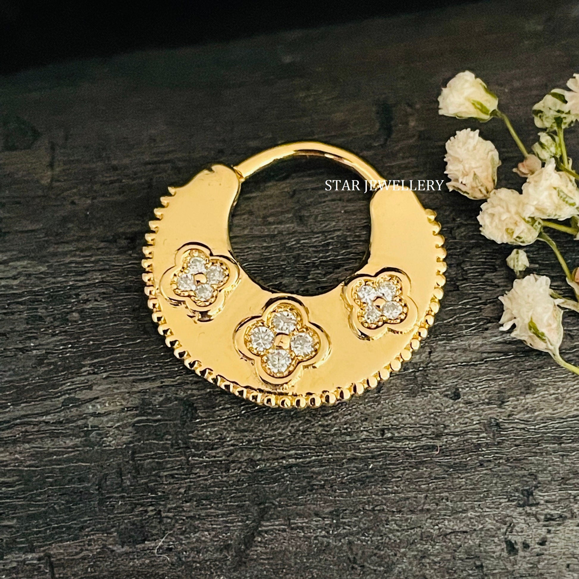 Natural Diamond Solid Gold Septum Clicker Piercing, Solid Gold Four Stone Bridal Septum Piercing, 14K Gold Crescent Septum Earring for Men