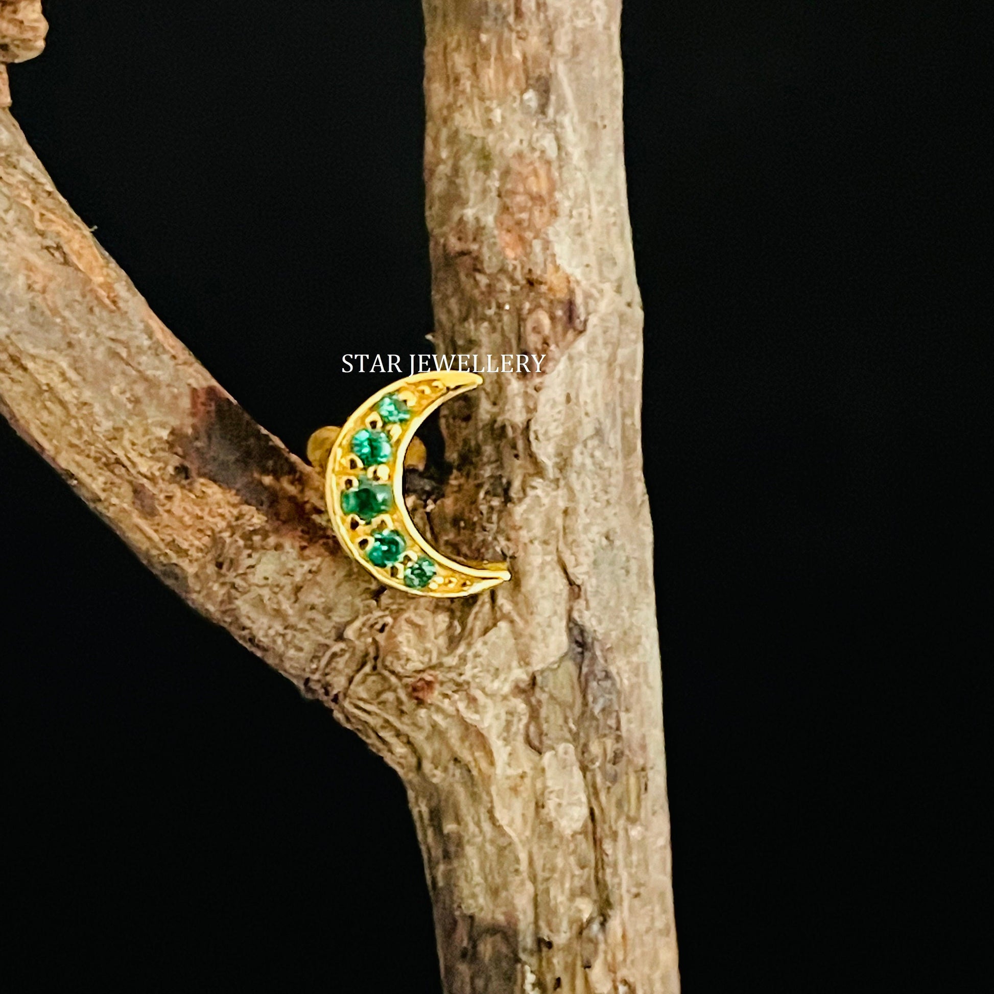 Natural Emerald Moon Helix Earring, Solid Gold Crescent Moon Tragus, Nose, Cartilage, Conch, Helix, Rook, Lobe, Orbital, Lip, Snug Piercing