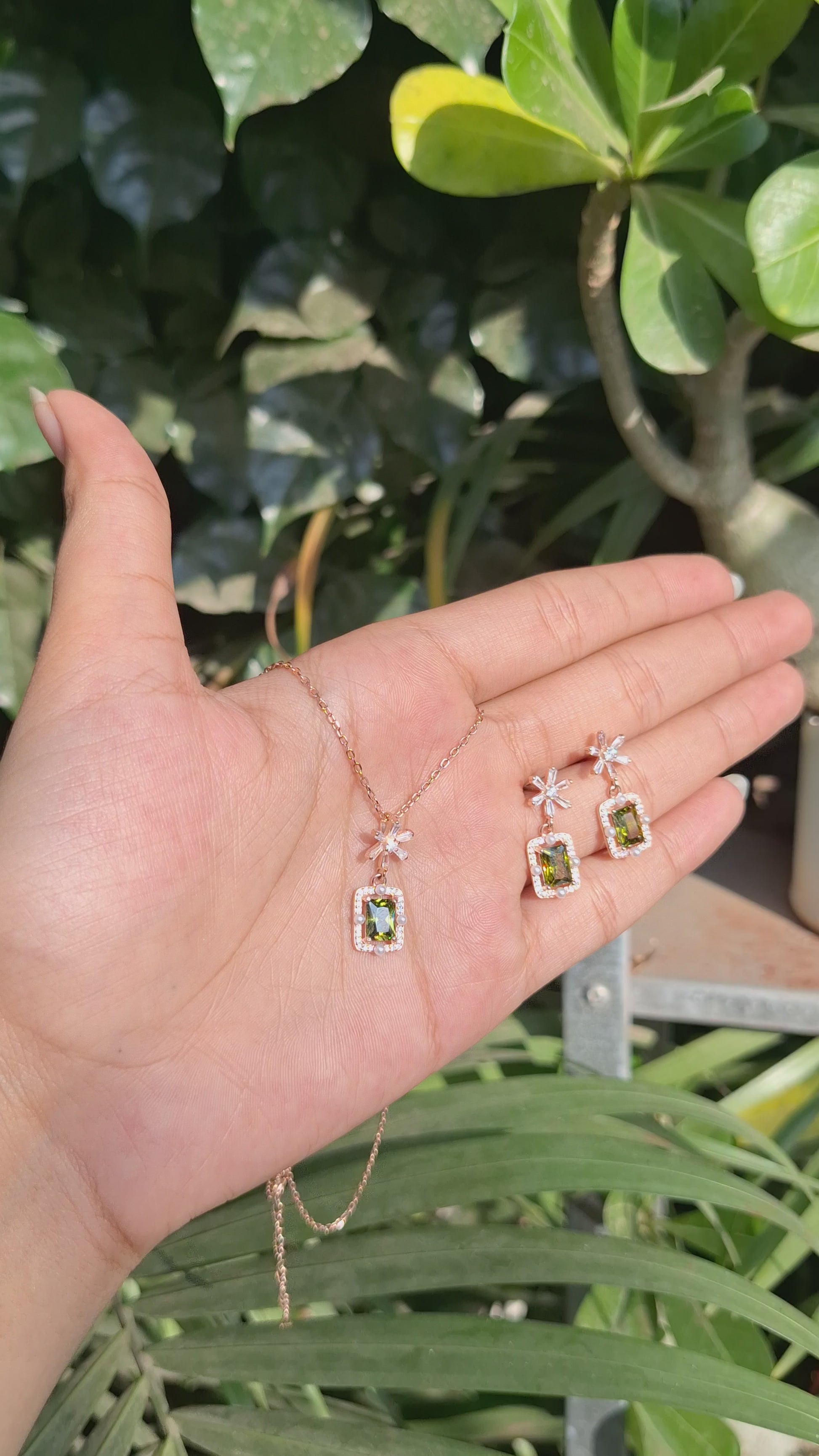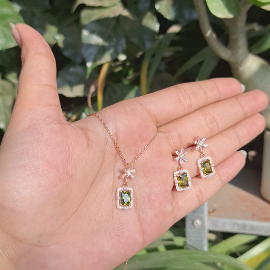 The matching earrings mirror the pendant’s style, featuring the same prism-cut moss green stone with zircon-studded edges, giving you a perfectly coordinated and graceful look.