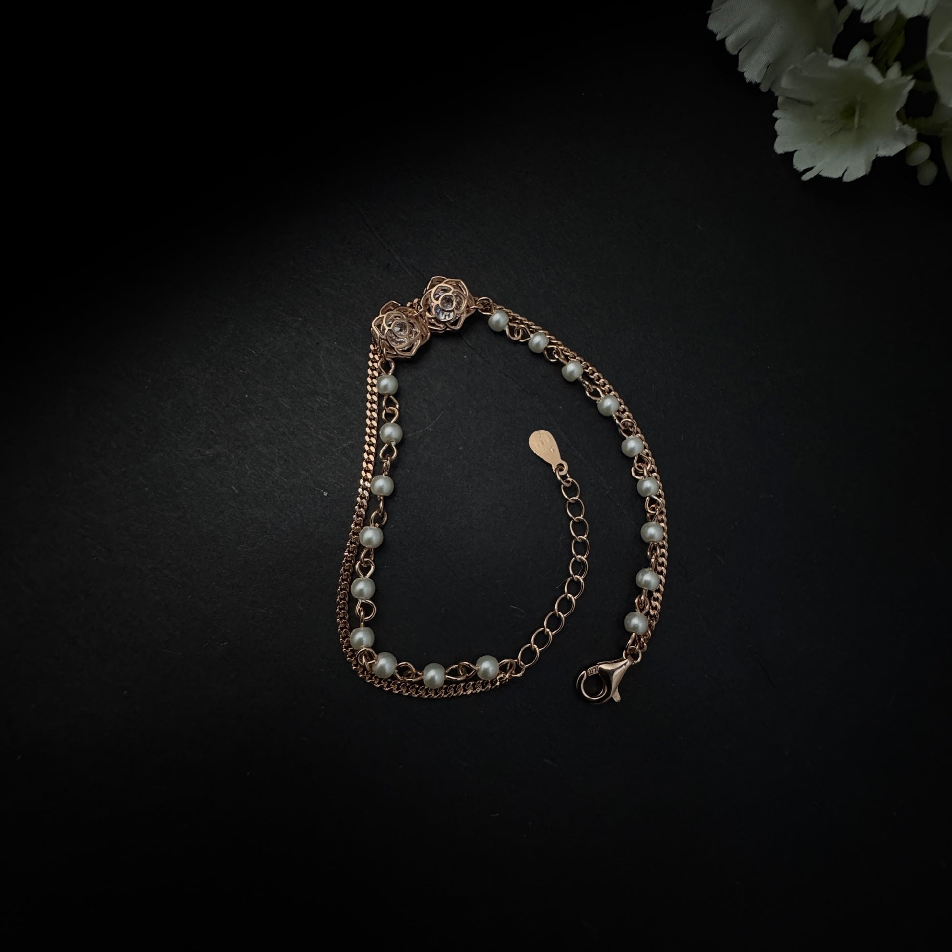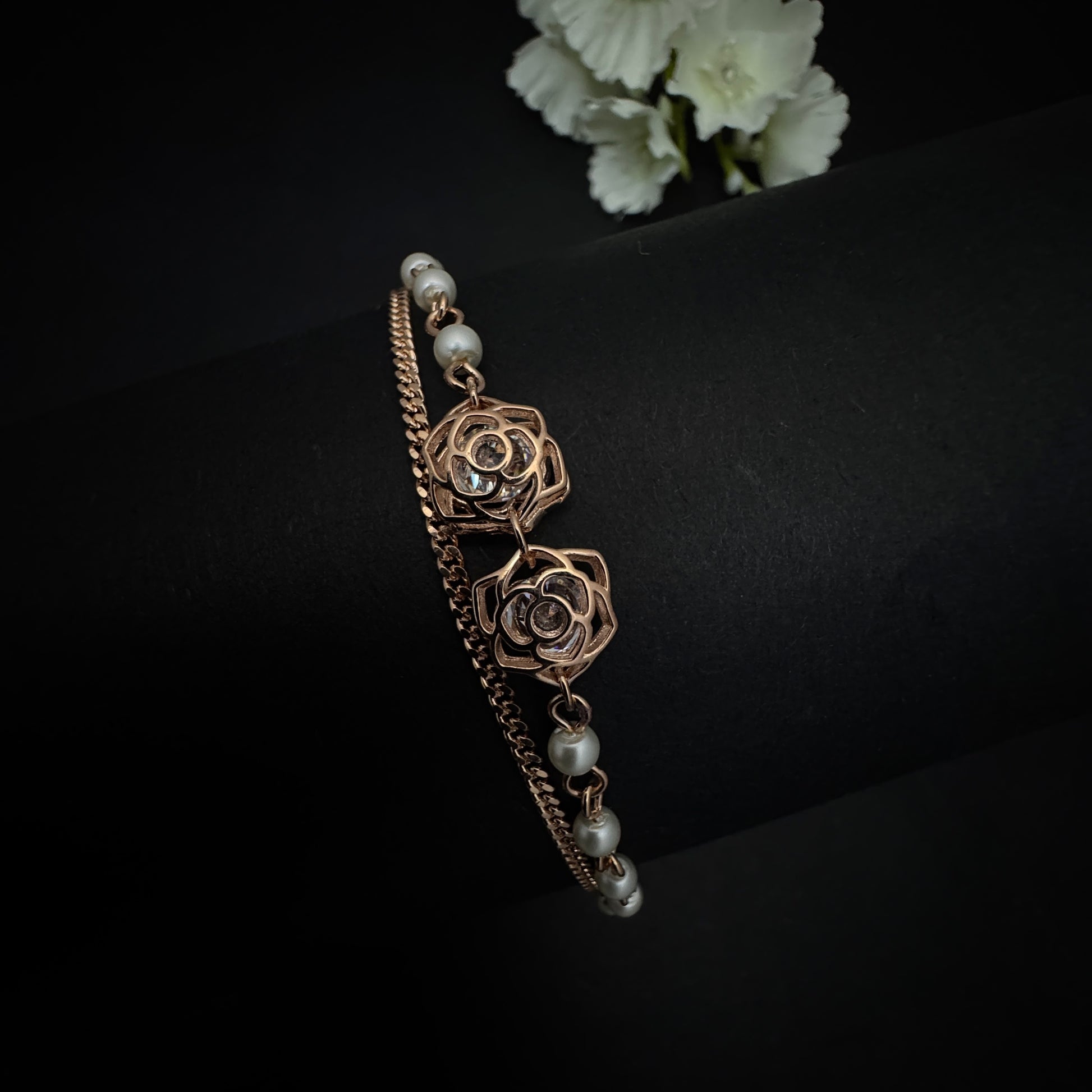 Grace your wrist with the delicate charm of the Rose Gold Plated Silver Rose Bracelet, crafted in 925 sterling silver. Featuring an elegant rose motif at its center, the bracelet is beautifully detailed with small white beads along the front chain, creating a soft, graceful accent that highlights your wrist. Finished in luxurious rose gold plating, this bracelet blends modern sophistication with timeless beauty. Its anti-tarnish finish and skin-friendly design ensure comfort and brilliance for everyday wear or special occasions.