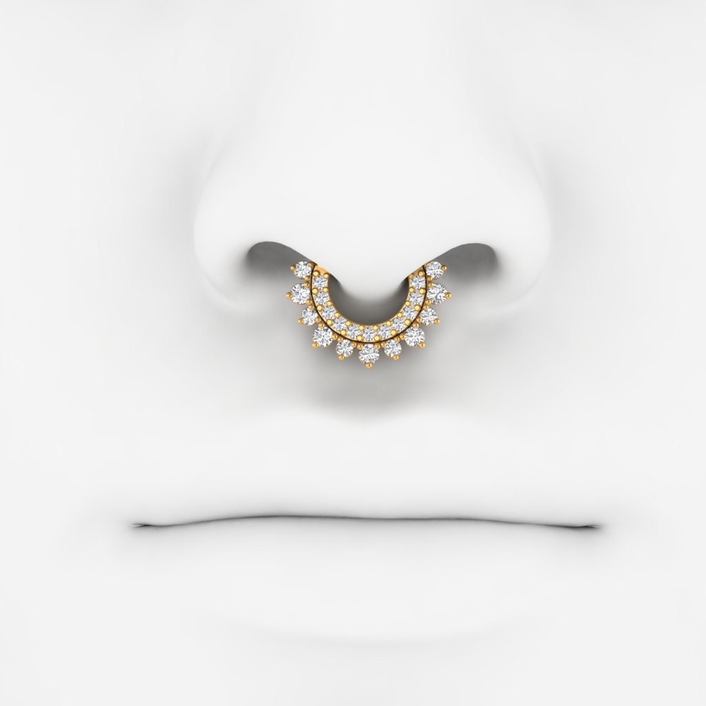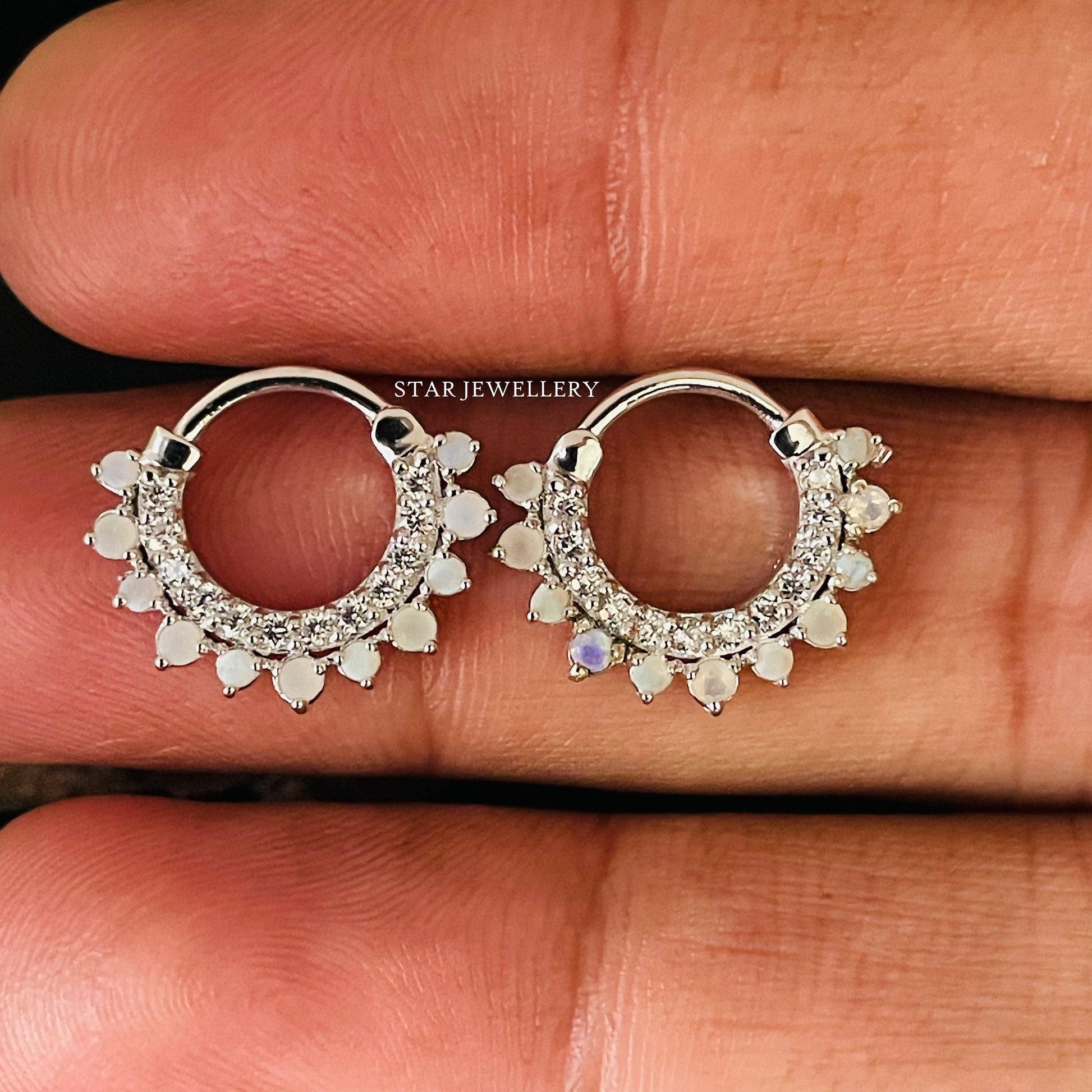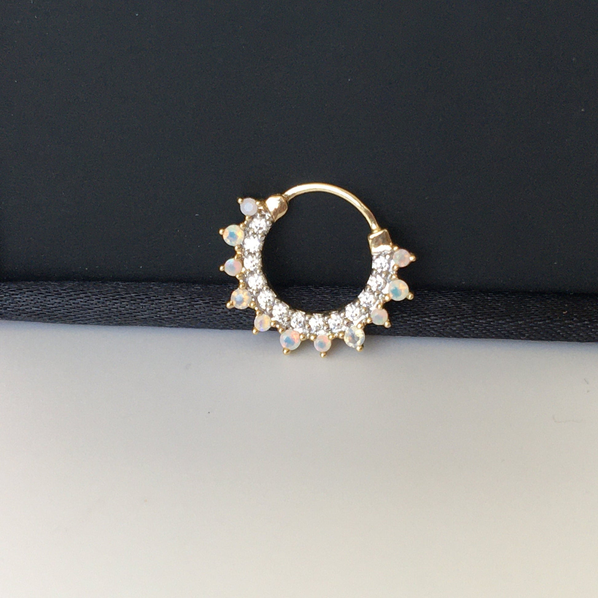 Septum Nose Ring in 14K Gold with Opal Stone, CZ Diamond Daith Piercing, Clicker Daith Piercing With Opal Stone, CZ Diamond Septum Clicker, Septum Clicker with Natural Opal Stone