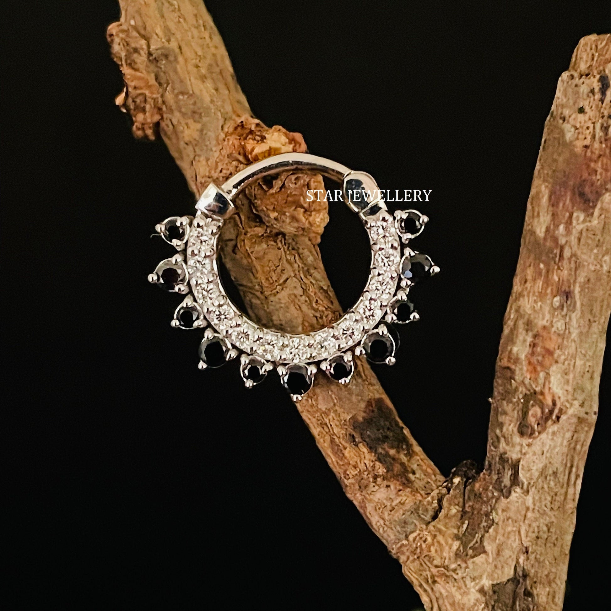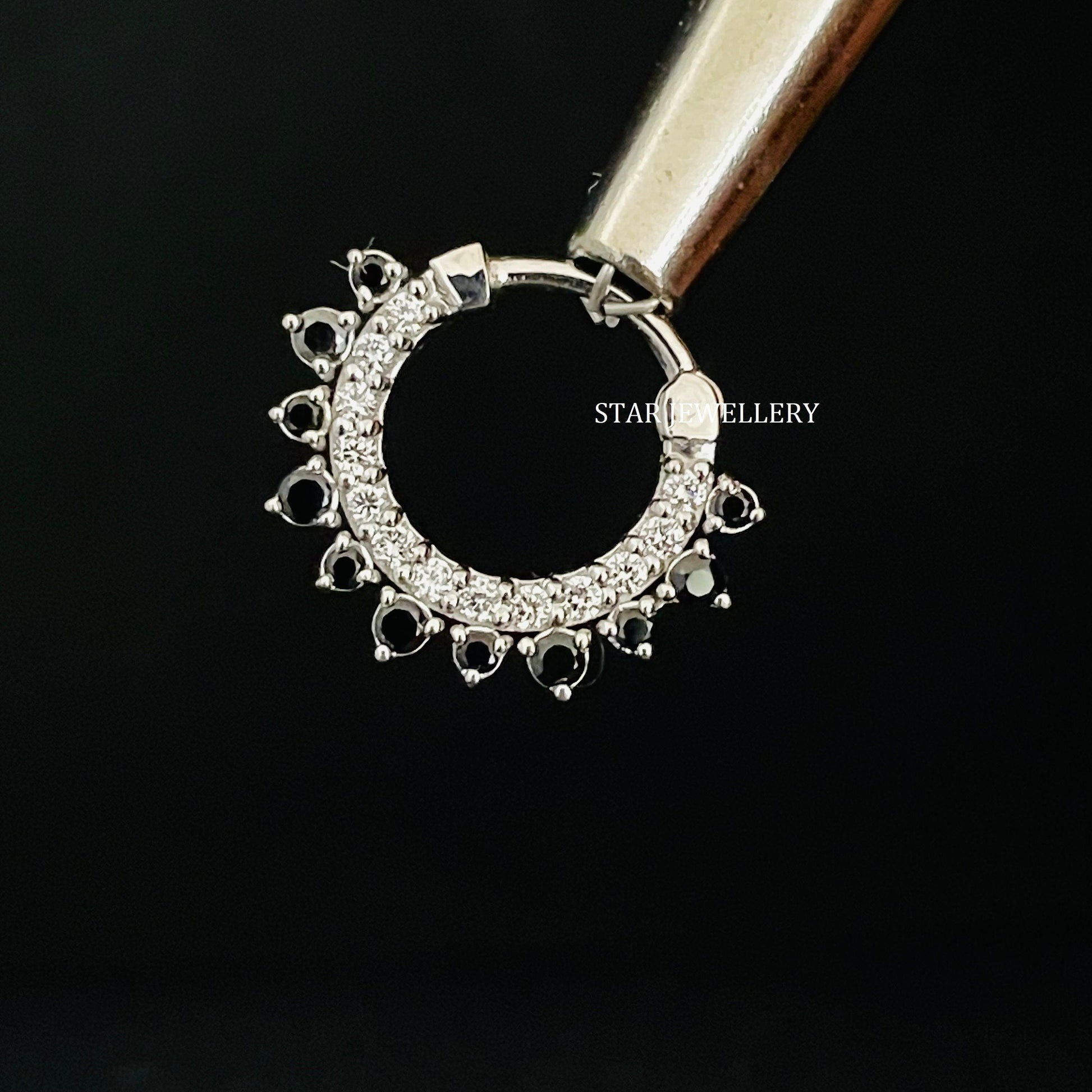 Septum Nose Ring in 14K Solid Gold with Black Diamond, Genuine Natural Diamond Daith Piercing, Clicker Daith Piercing with CZ Black Diamond