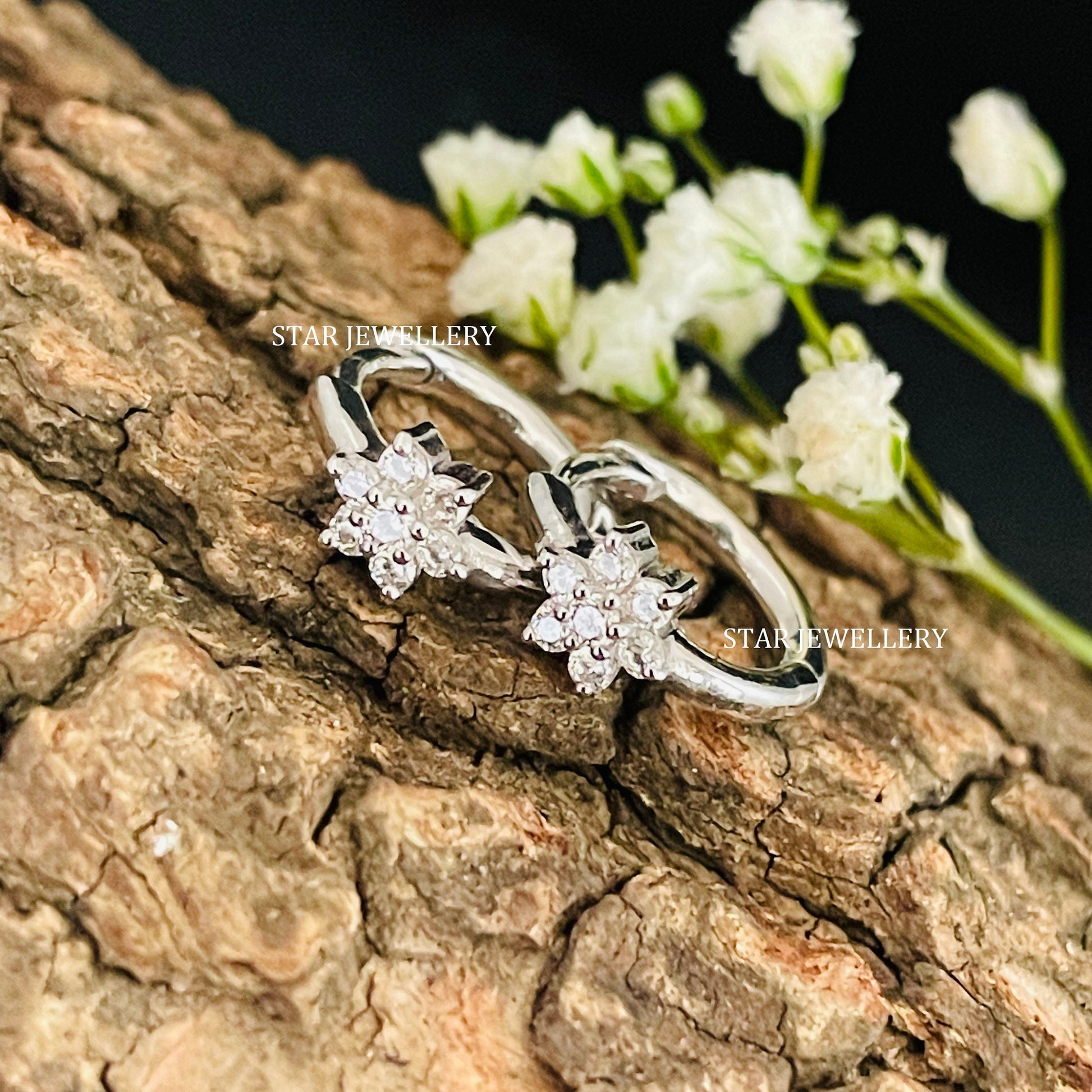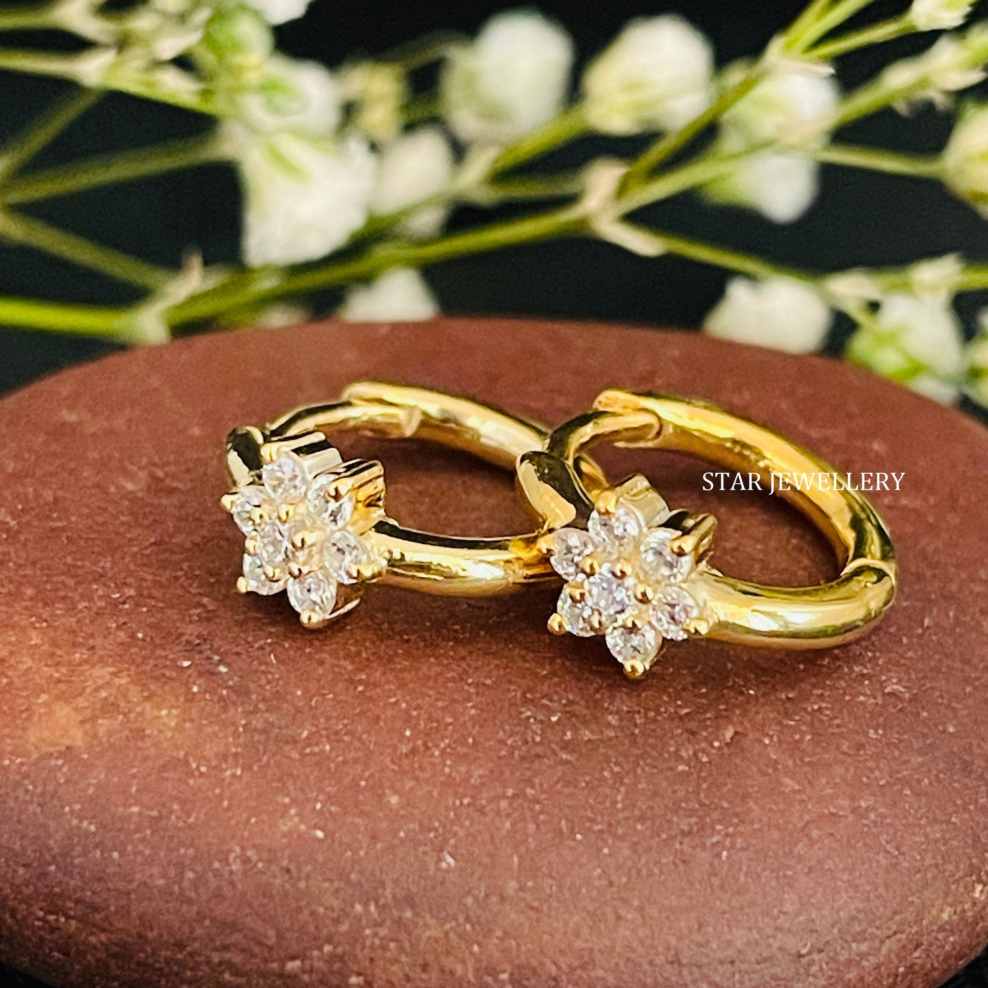 14K Solid Gold Single Flower Diamond Hoop Earring