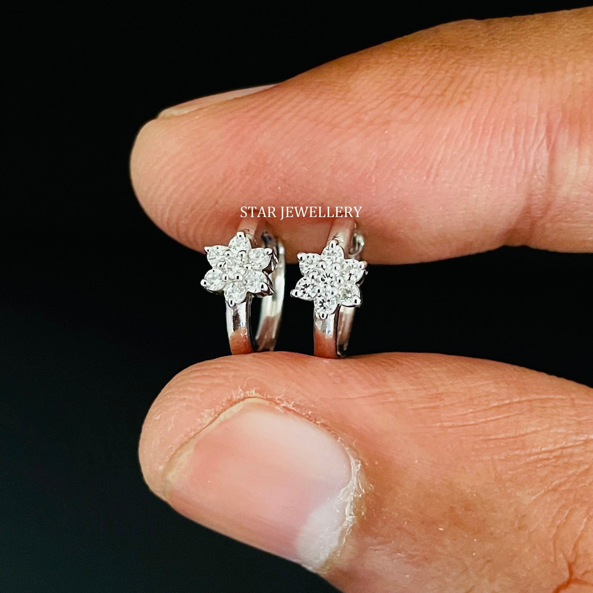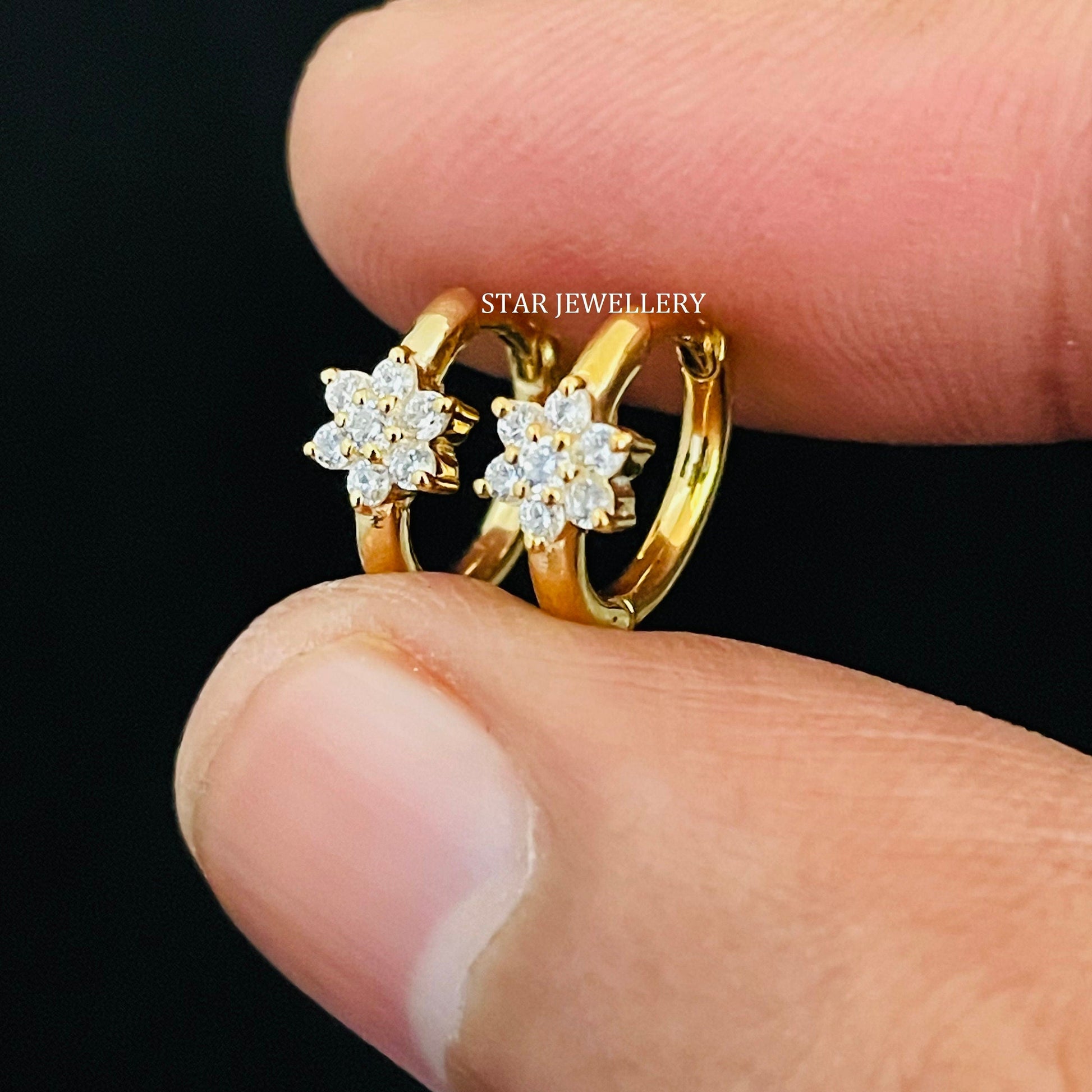 Seven Diamond Huggie Hoop Earring, 14K Solid Gold Single Flower Diamond Hoop Earring, Clover Diamond Baby Hoop Earring, Graduation Gift, Single or Pair