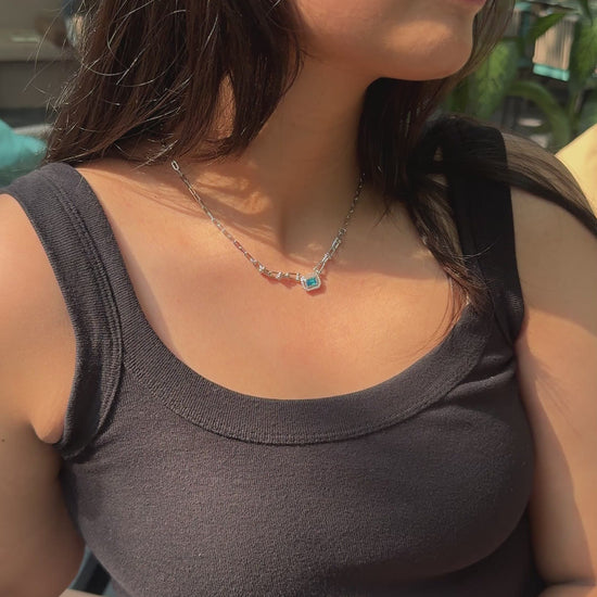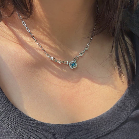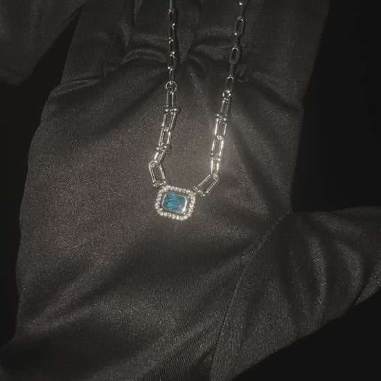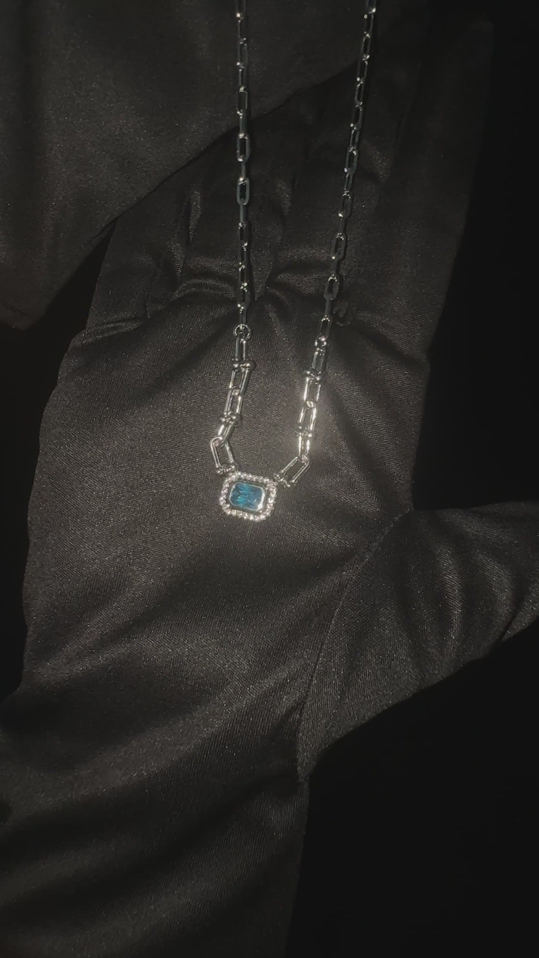 Silver Azure Pendant showcases a radiant cushion-cut azure blue stone as its centerpiece, elegantly elevated by a structured arrangement of sterling silver links. The deep blue gemstone shines brilliantly, framed by the striking silver design for a sophisticated and timeless piece.