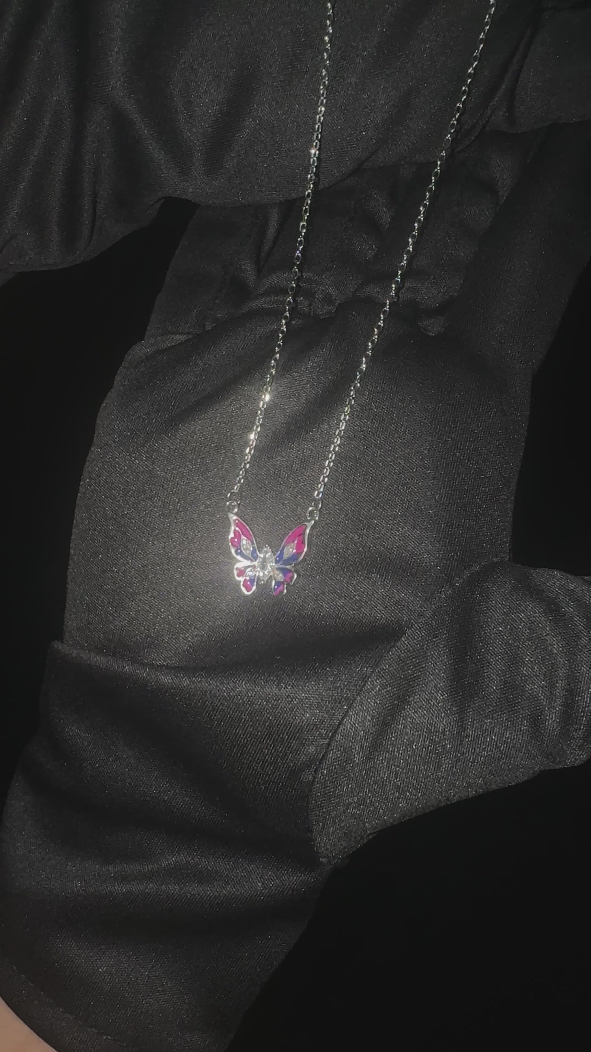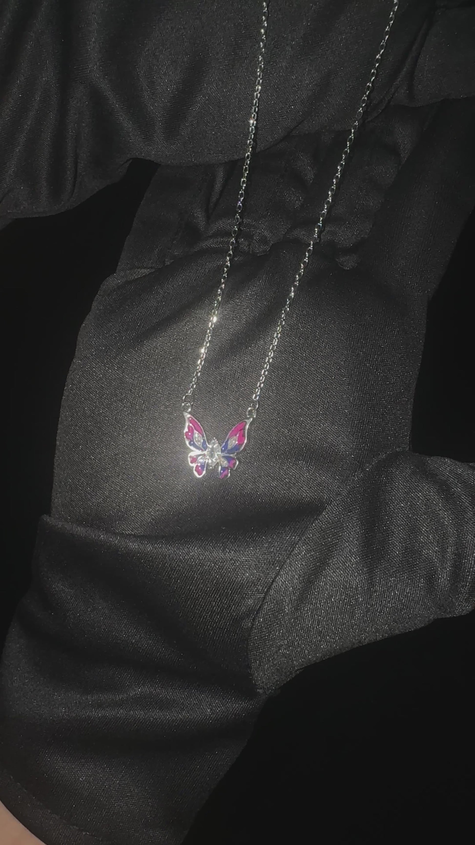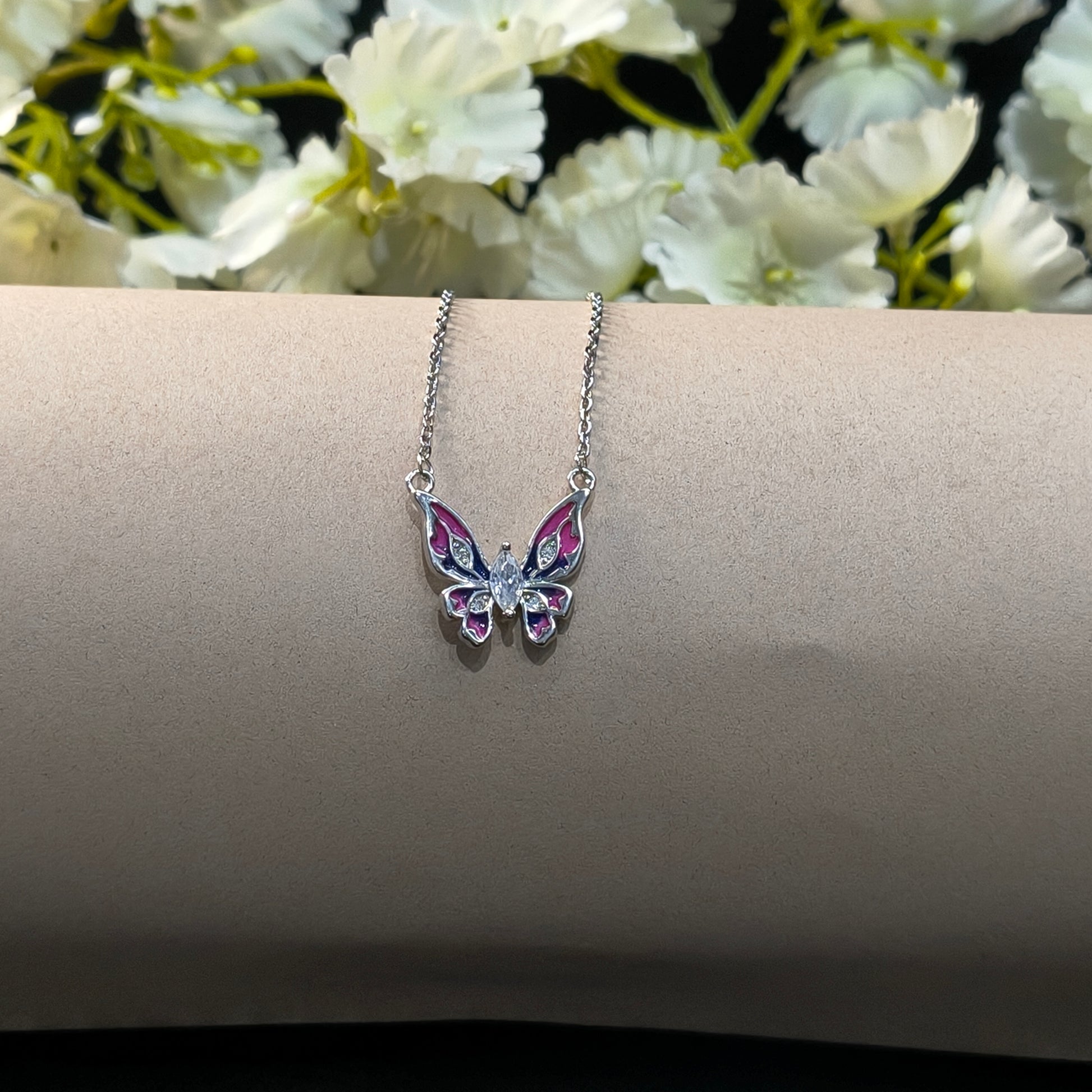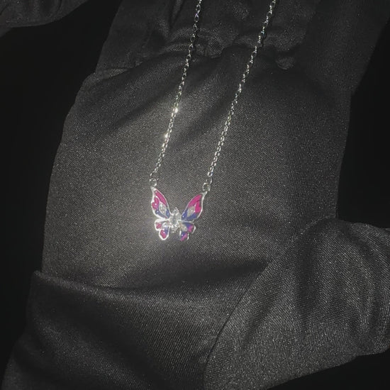 Silver Bi-Colour Butterfly Pendant beautifully showcases a vibrant bi-colour design on the wings, anchored by a brilliant center stone. Each of the four wings is delicately accented with a single sparkling stone, creating a striking and elegant statement piece.