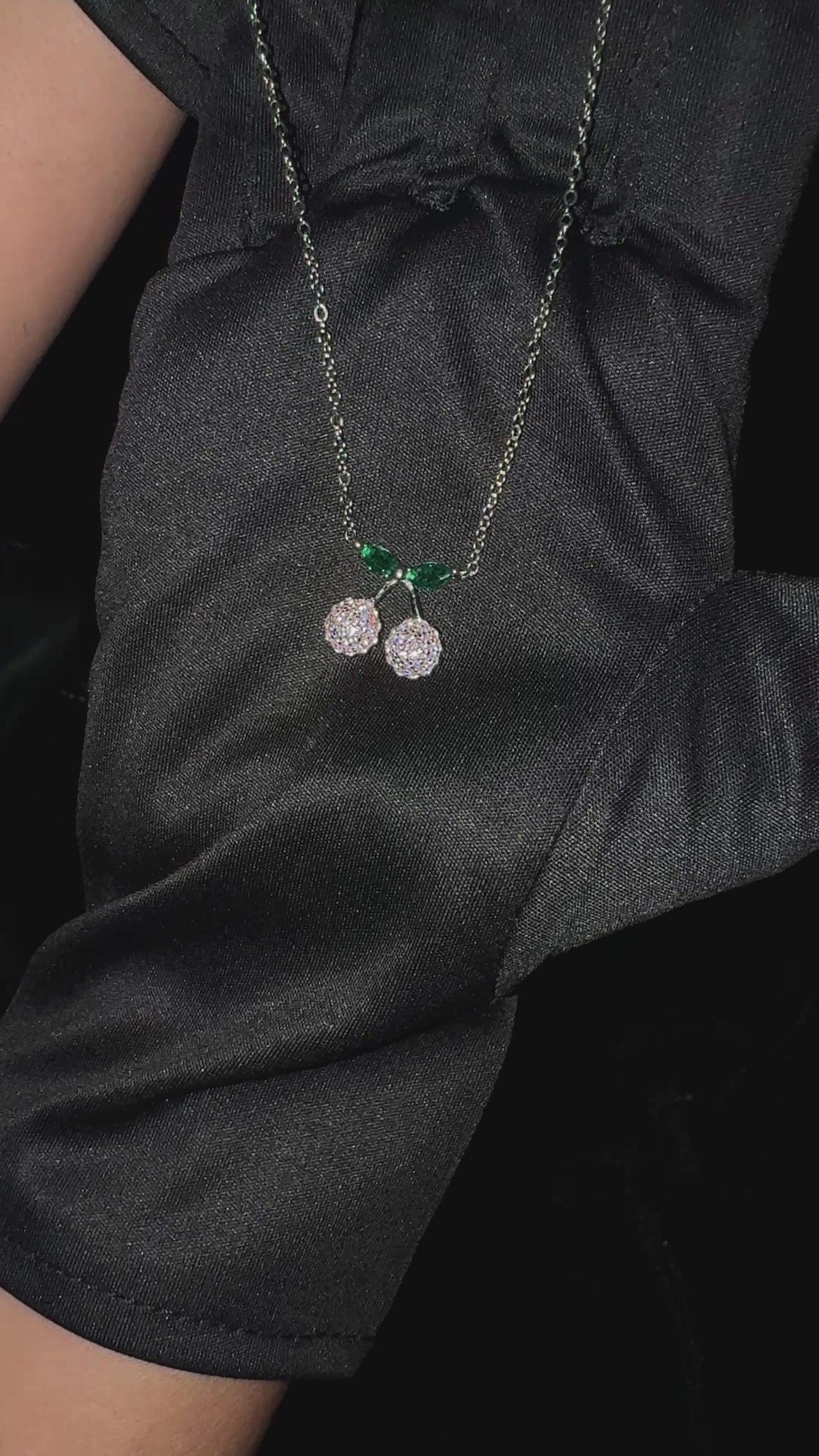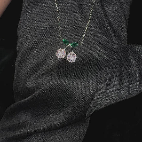 Silver Cherry Pendant captures a playful and sweet vibe with two charming cherry charms pave-set with sparkling pink stones. The cherries are complemented by two vibrant green zirconia gemstone leaves, adding freshness and color to this delightful piece.