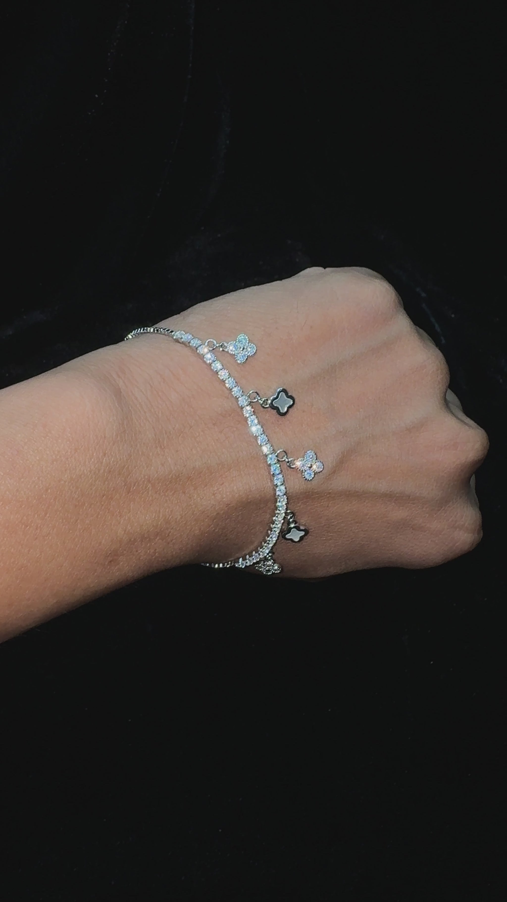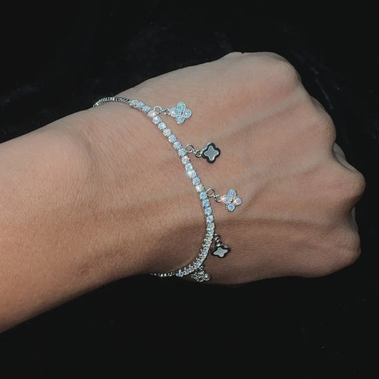 The Silver Dazzling Clover Drop Bracelet is a radiant blend of sparkle and charm. Designed with a continuous row of shimmering stones, it features five delicate petal charms—three studded with sparkling stones and two finished with a luminous glow. Crafted from 925 sterling silver, this bracelet is anti-tarnish, skin-friendly, and perfect for adding an elegant touch to everyday wear or festive occasions.