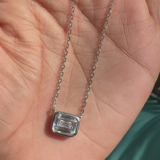 Silver Emerald Cut Pendant showcases a large rectangular zirconia stone as its centerpiece, cut in an elegant emerald style to catch the light brilliantly. This classic design offers refined sophistication and timeless beauty.