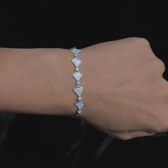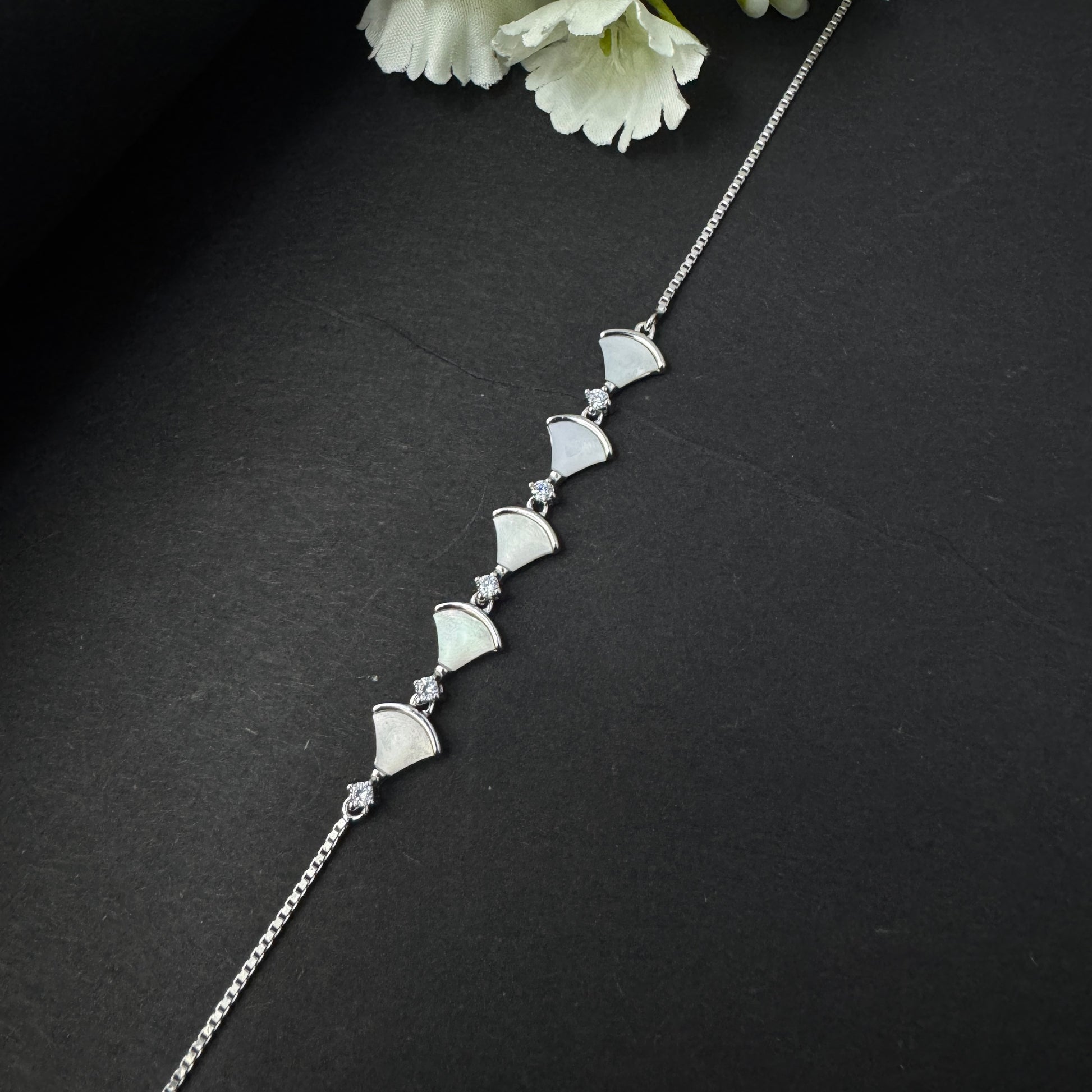 Bring a touch of playful elegance to your wrist with the Silver Fan Charm Bracelet. Crafted in 925 sterling silver, this bracelet features a dainty fan-shaped charm that sways gracefully with every movement. Its sleek chain design makes it easy to style solo for a minimal look or stack with other bracelets for a chic layered vibe. Finished with an anti-tarnish coating, it stays radiant and skin-friendly for everyday comfort. A versatile piece that transitions effortlessly from casual days to evening occasions.