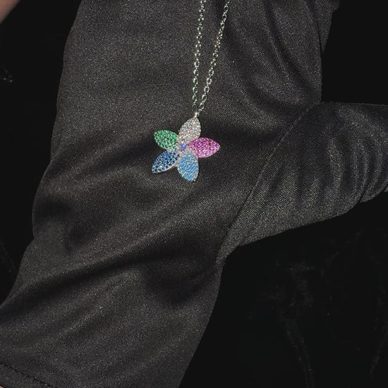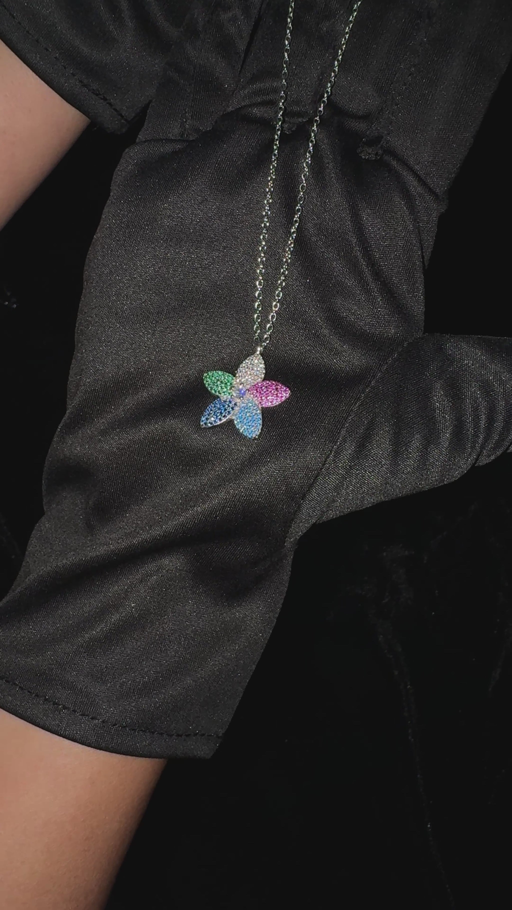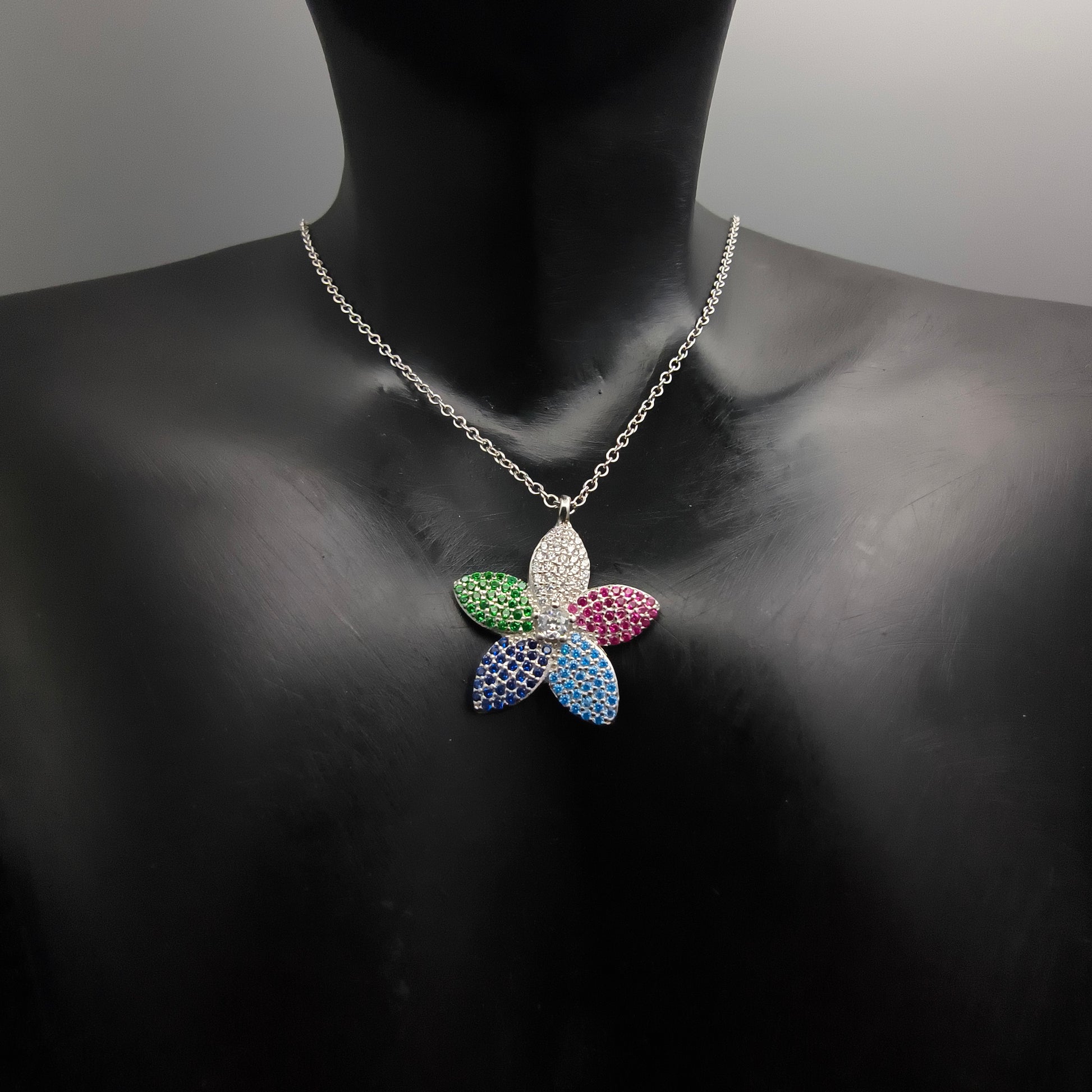 Silver Flower Pendant features a single large flower with five petals, each adorned with different colored zirconia stones in white, green, pink, dark blue, and light blue, creating a vibrant and eye-catching design.