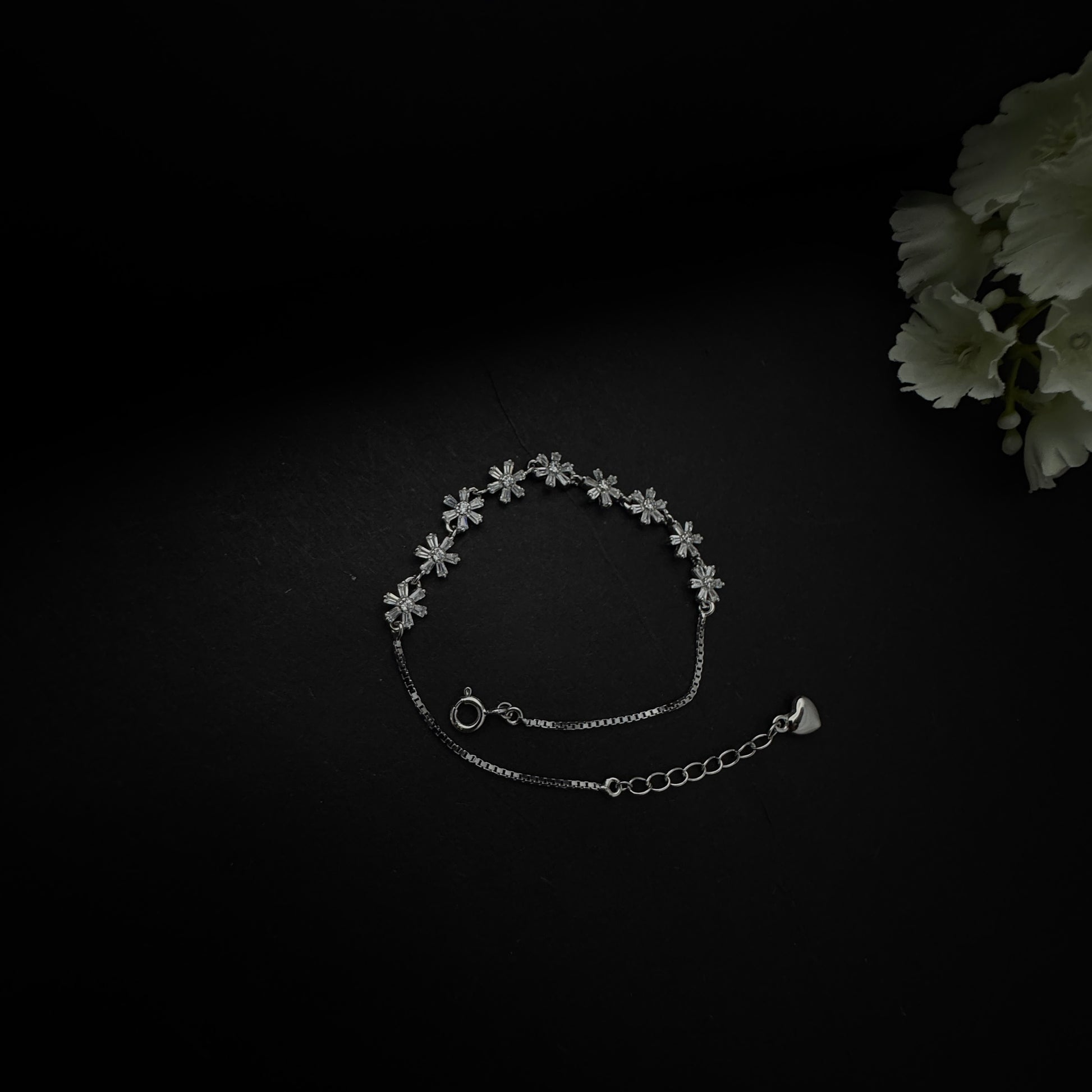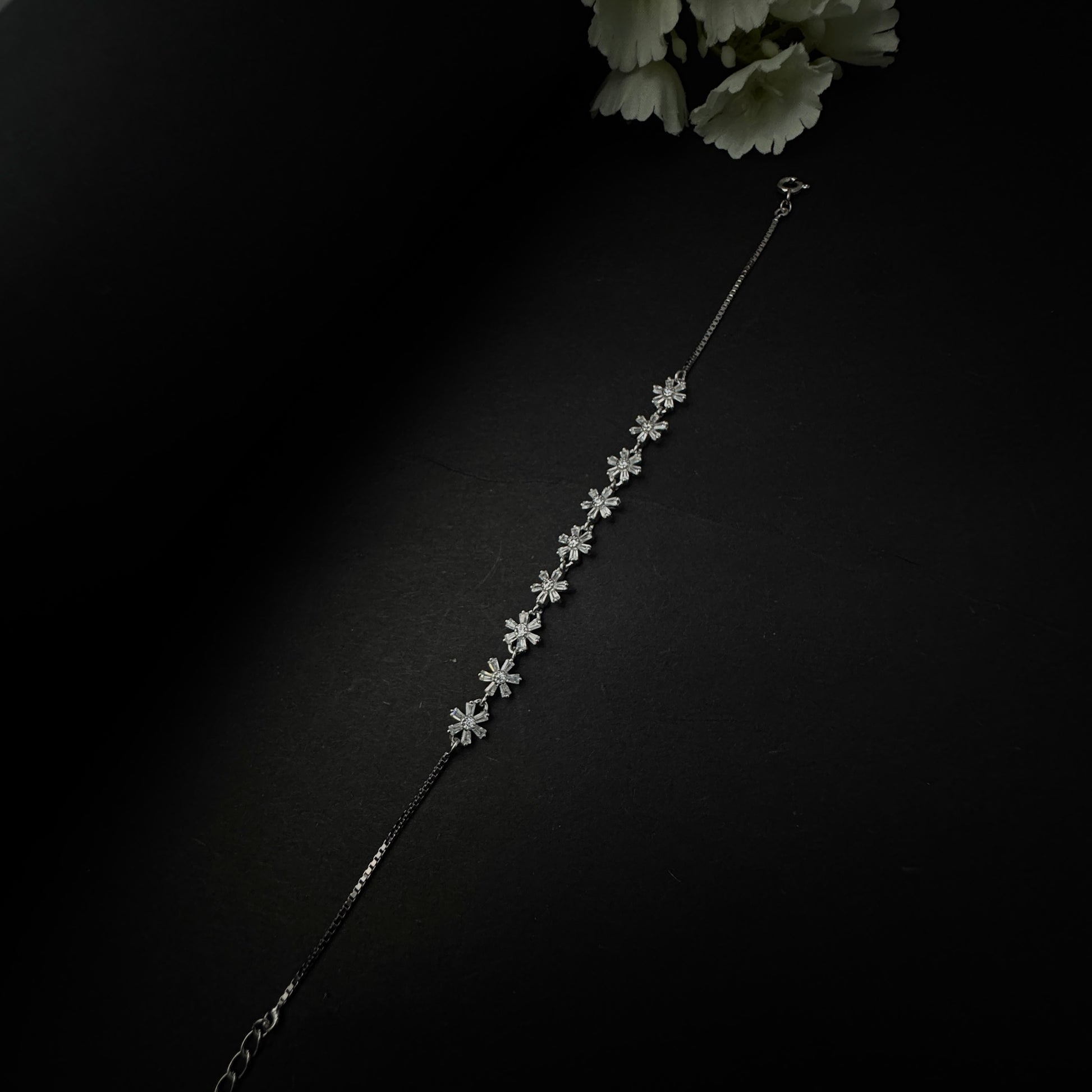 Bring the beauty of a blooming garden to your wrist with the Silver Garden of Diamonds Bracelet, crafted in 925 sterling silver. Designed with nine delicate floral charms, each separated by a shimmering diamond, this bracelet captures the essence of elegance and sparkle. Lightweight and refined, it transitions effortlessly from daily wear to special occasions. With its anti-tarnish finish and skin-friendly design, it promises long-lasting shine and all-day comfort.