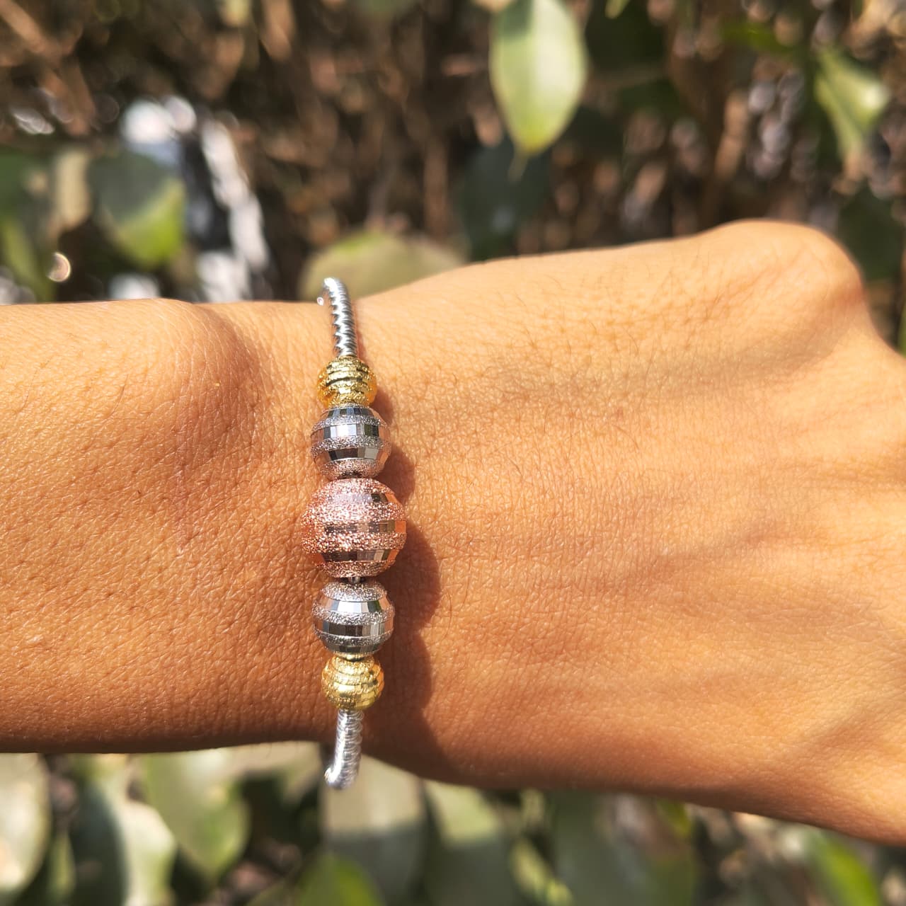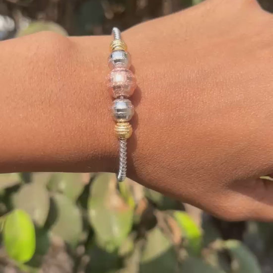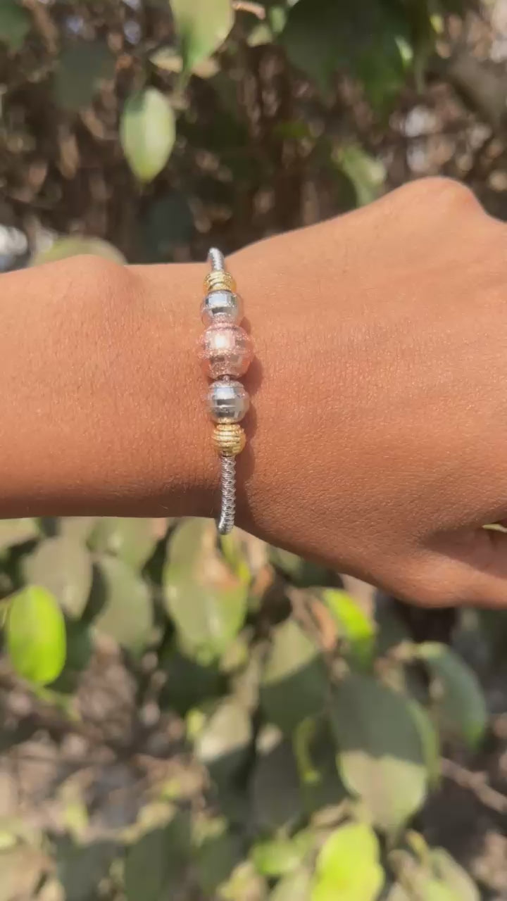 - Design details: Modern beaded bracelet with mixed silver & rose‑gold metallic beads on a geometric chain