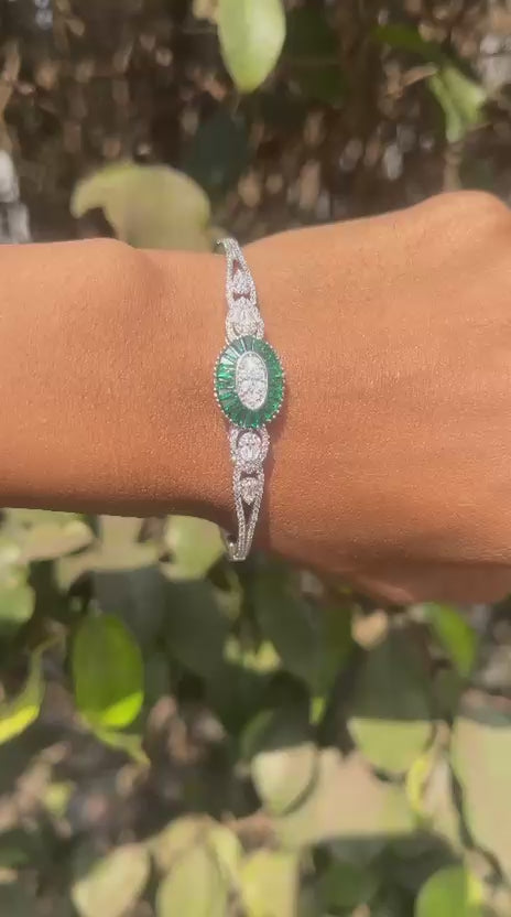 - Design details: Modern geometric cuff with green enamel eye and white zircon stones.