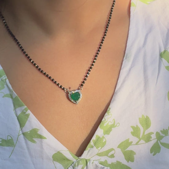 Celebrate love with a modern twist through the Silver Green Heart Pendant Mangalsutra, crafted from premium 925 sterling silver. Featuring a vibrant green heart pendant, this mangalsutra blends traditional sentiment with contemporary elegance. Anti-tarnish and skin-friendly, it ensures comfort for sensitive skin while retaining a lasting shine. Perfect for daily wear, weddings, anniversaries, or gifting, this piece adds a pop of color and charm to any ensemble.