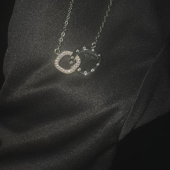 Silver Interlock Circles Pendant features two interlocking rings, one fully paved with sparkling crystals and the other accented with a modern mixed texture for a stylish contrast.