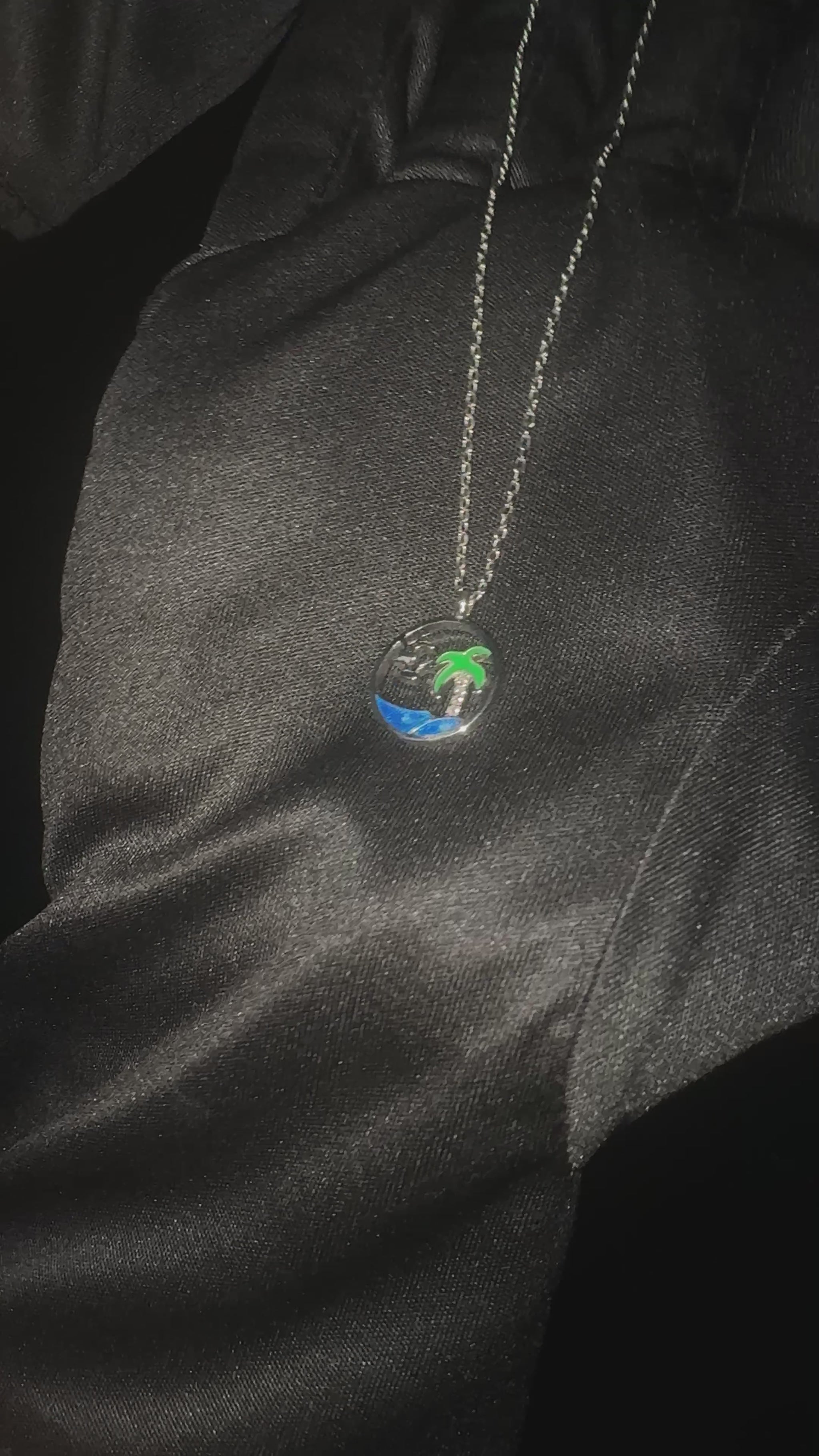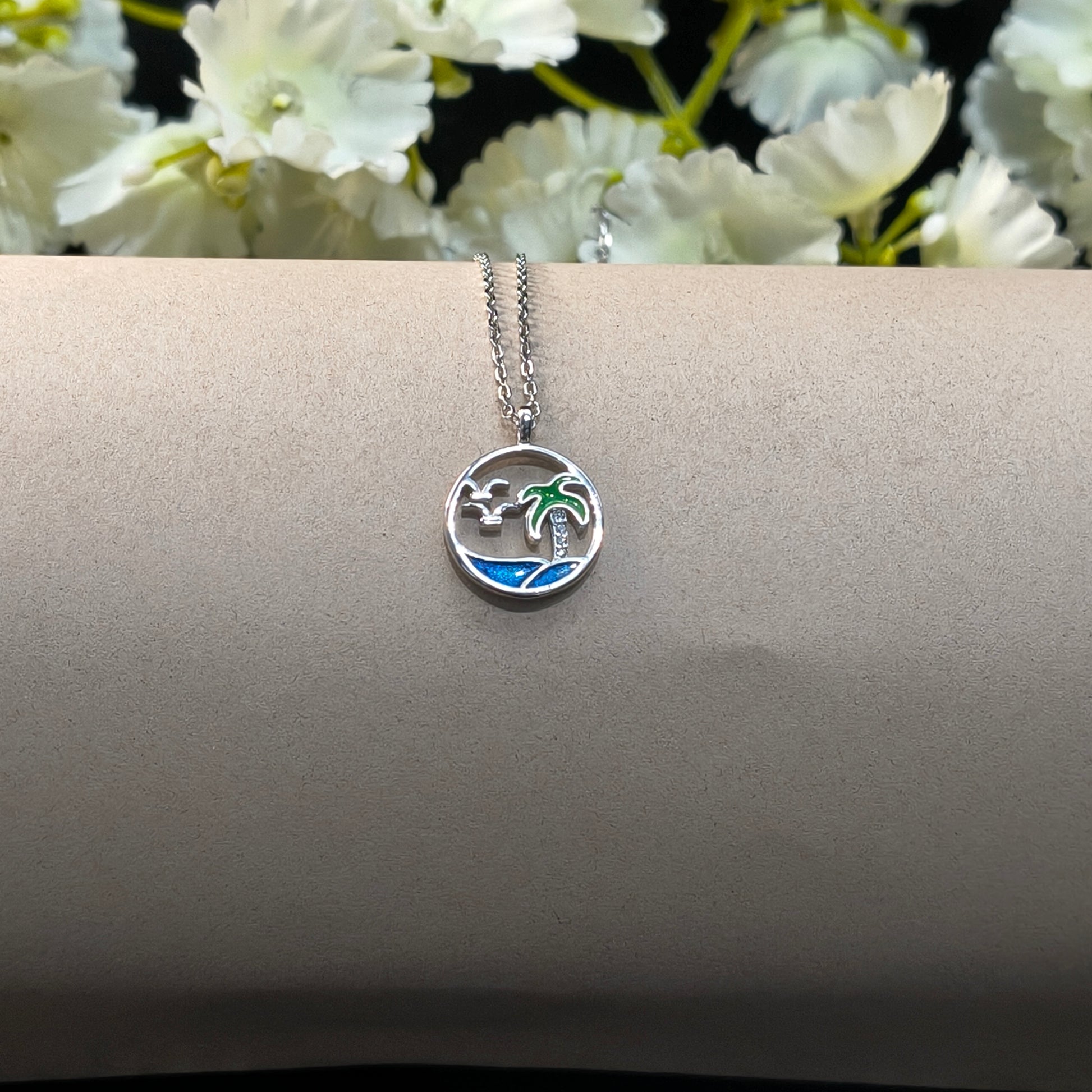 Silver Island Pendant features a circular design beautifully capturing an island scene inside, with palm trees, gently rolling sea waves, and two birds flying gracefully. The tree trunk is studded with sparkling stones, adding a touch of brilliance to the tranquil tropical scene.